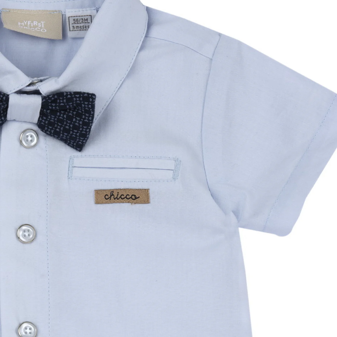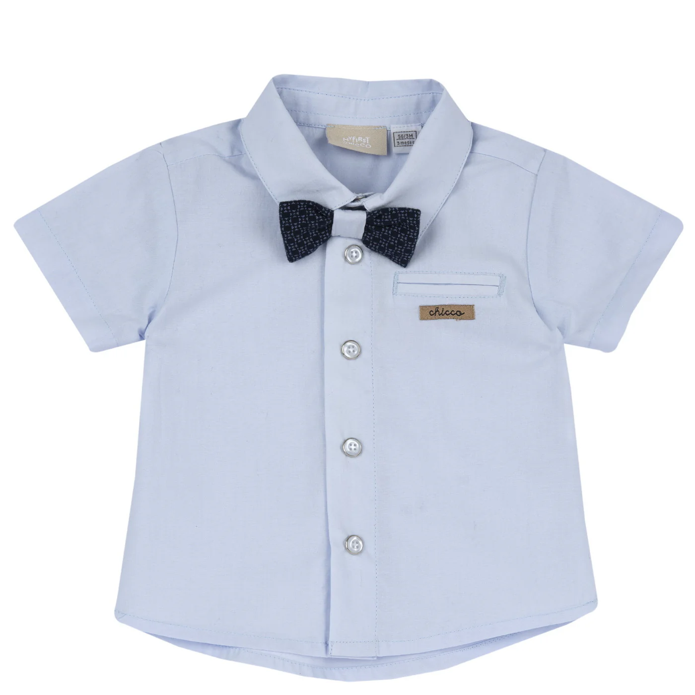 Chicco camicia con papillon neonato cotone celeste Maniche corte Taschino con patch logo lato cuore Chiusura centrale con bottoni a pressione Papillon blu in micro fantasia Rimovibile Composizione: 100% cotoneMade in IndiaCollezione Primavera Estate Vestibilitร :Taglia Etร