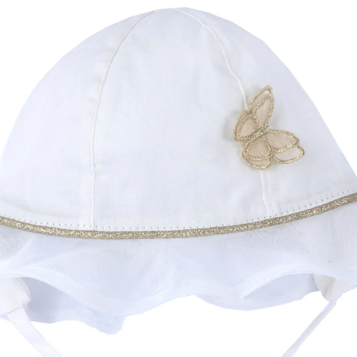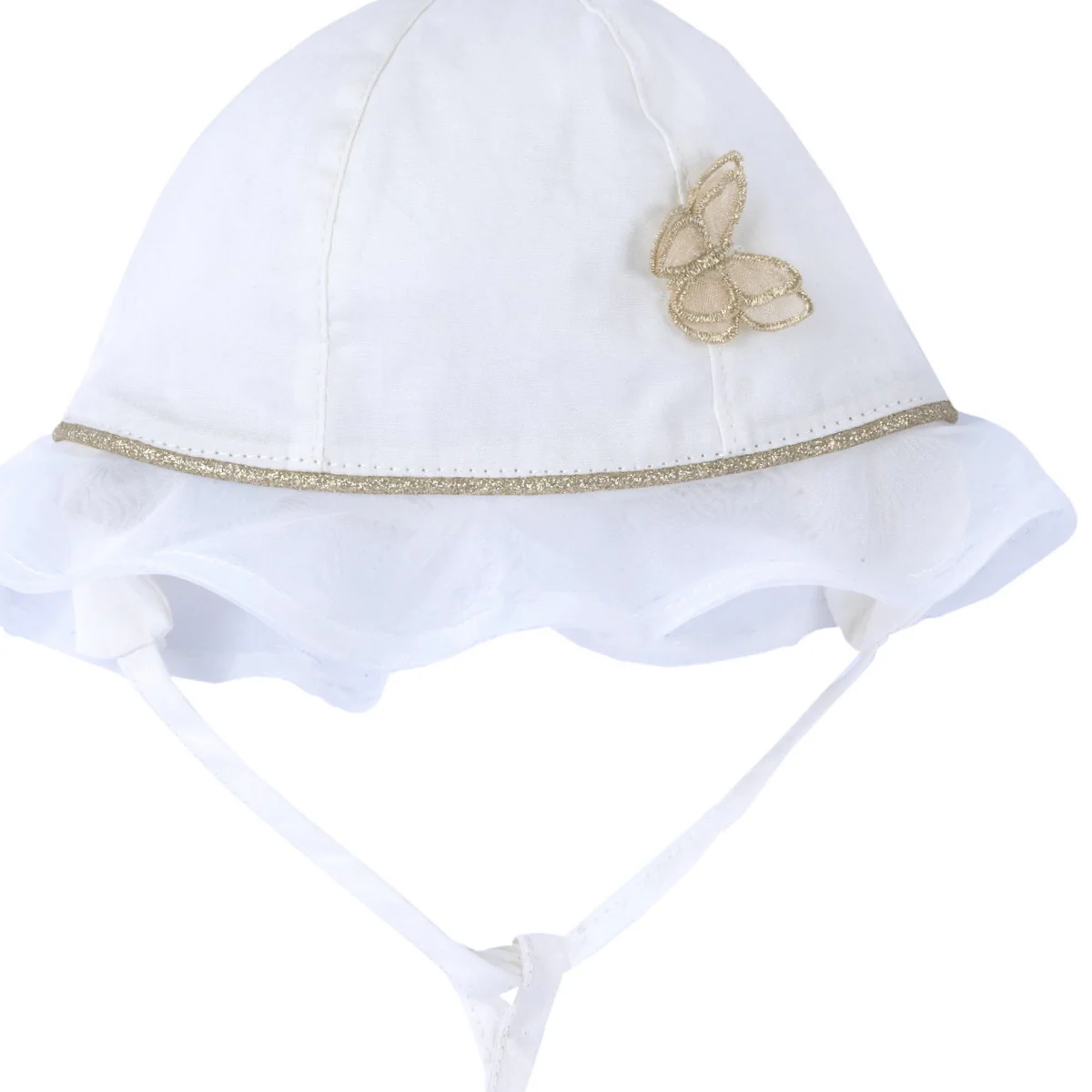 Chicco cappello neonata cotone bianco Modello pescatore con paraorecchie Volant in tulle Farfalla sul lato Orlino lurexComposizione: 100% cotoneMade in CinaCollezione Primavera Estate Vestibilitร :Taglia Etร