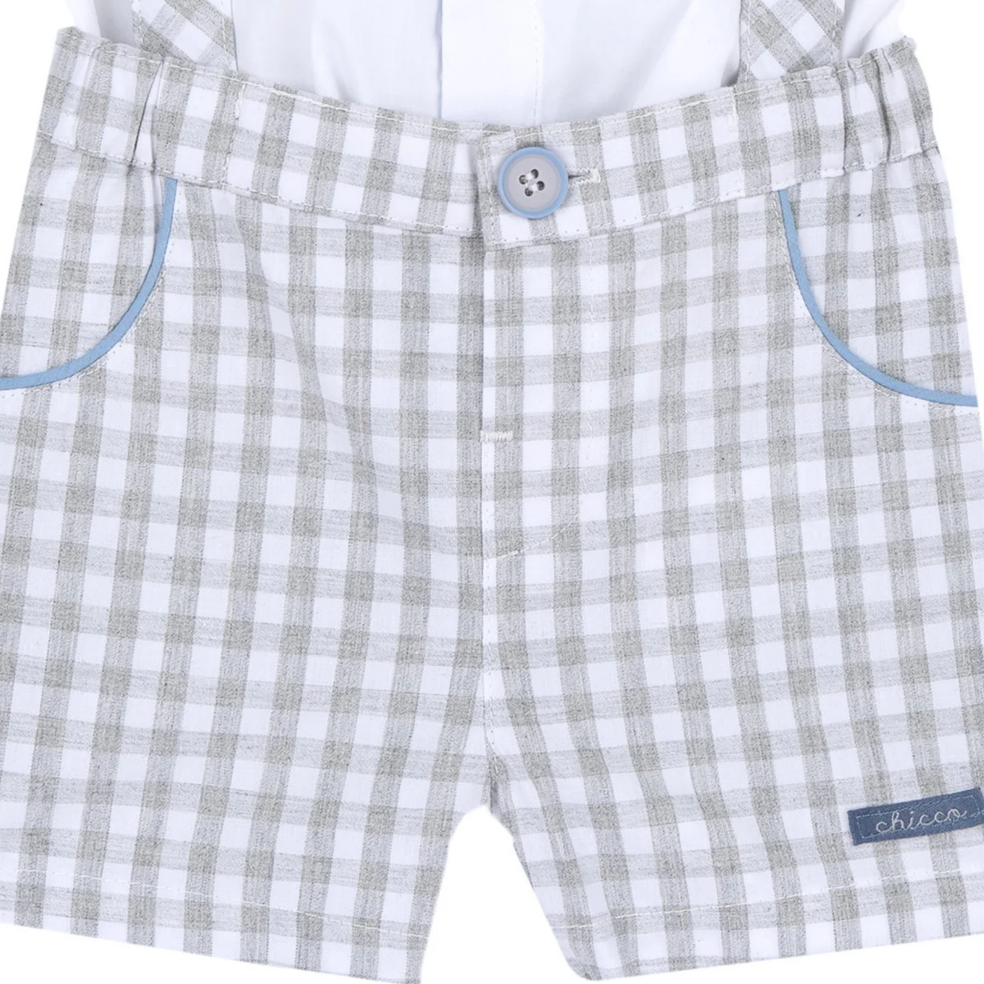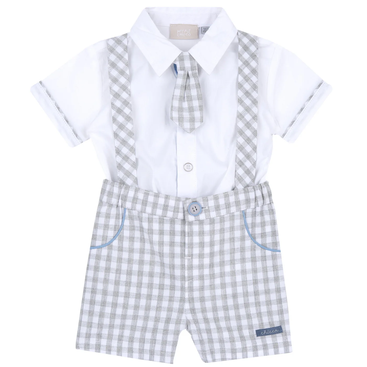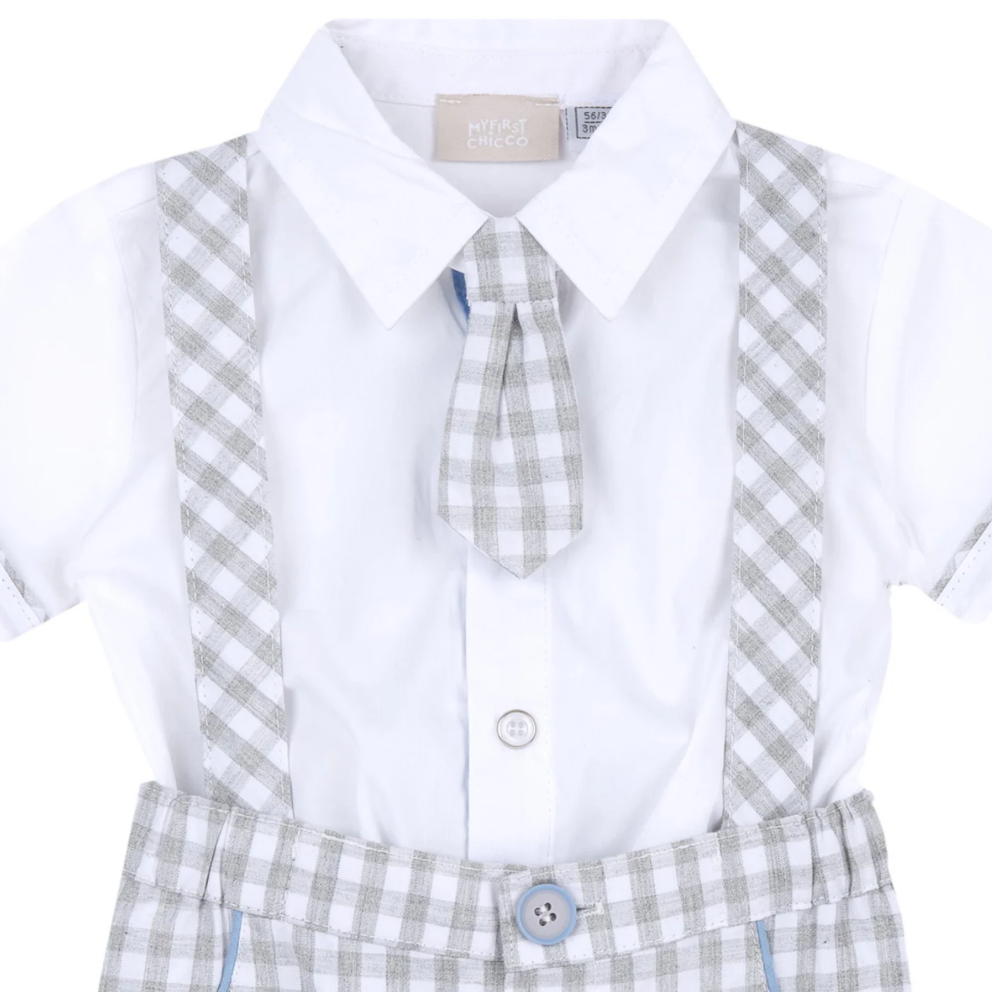 Chicco completo tre pezzi neonato in cotone bianco grigio Camicia maniche corte Chiusura con bottoni a pressione Cravatta a quadrettini rimovibile Bermuda a quadrettini con bretelle rimovibiliFinte tasche Patch logo sul fondoComposizione: 100% cotoneMade in CinaCollezione Primavera Estate Vestibilitร :Taglia Etร
