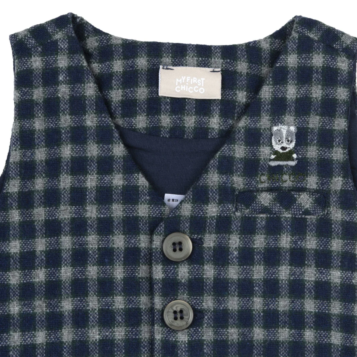 Chicco gilet panciotto neonato blu grigio verdeMisto lanaChiusura a tre bottoniRicamo logo lato cuoreComposizione: 49% lana 23% poliestere 19%acrilica 7% poliammide 2% cotone fodera 100%cotone Made in IndiaCollezione Autunno Inverno Vestibilitร :Taglia Etร