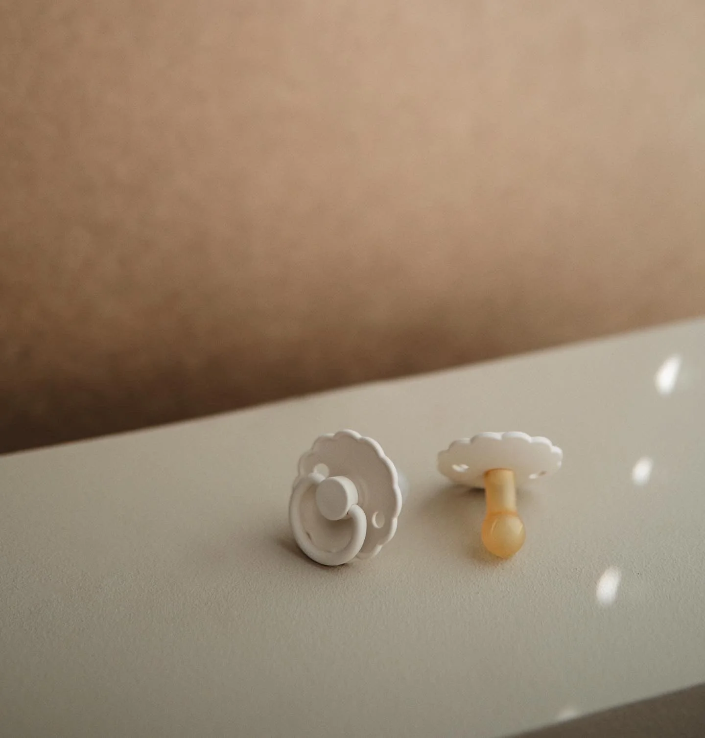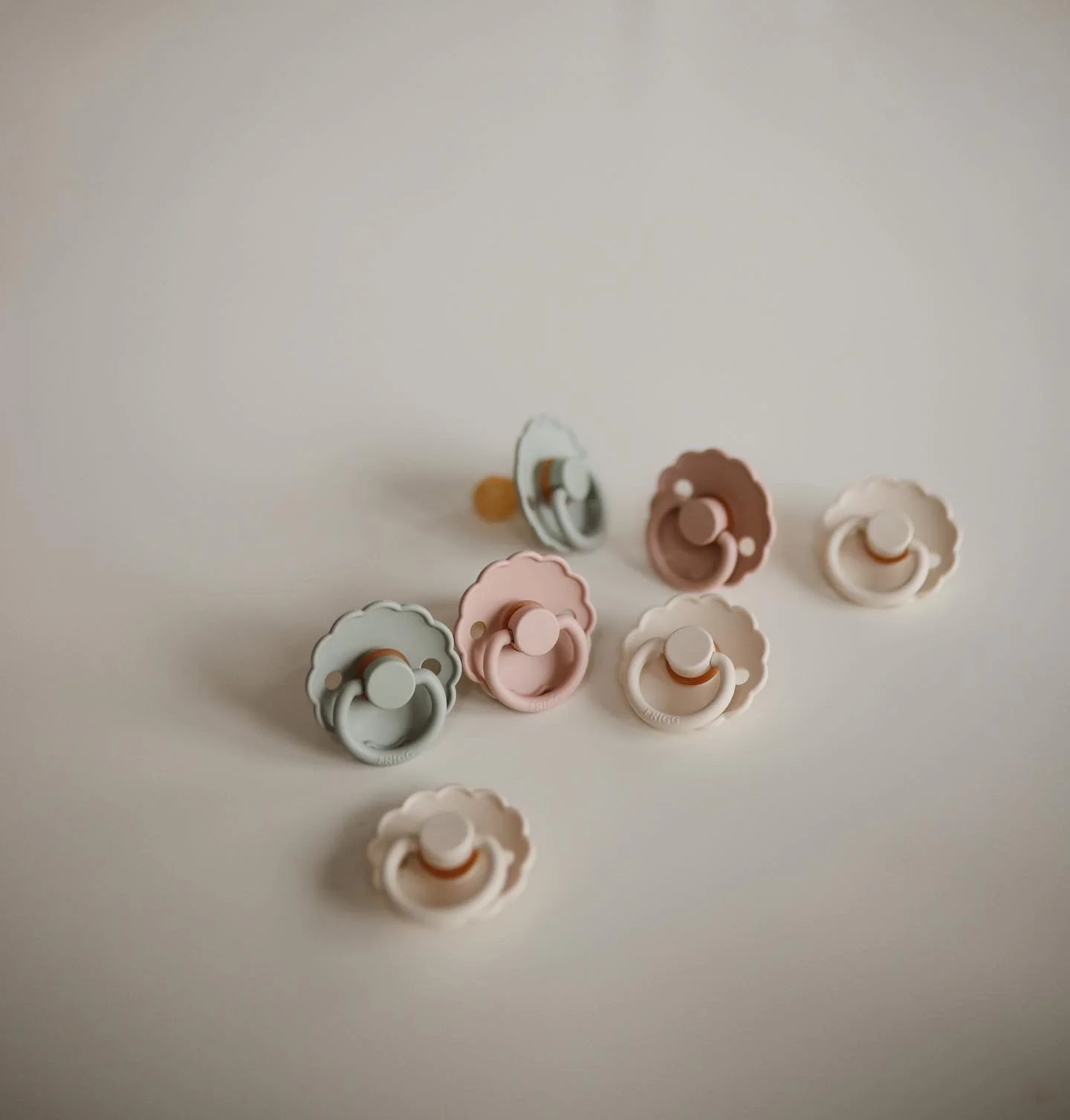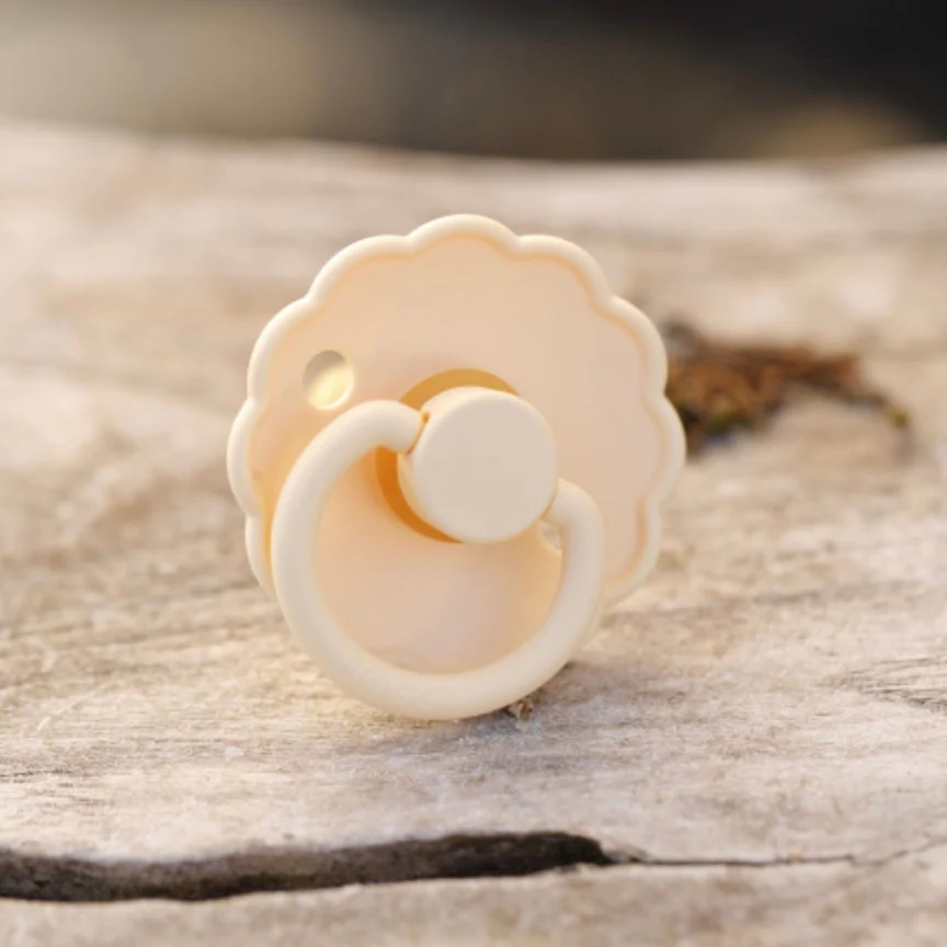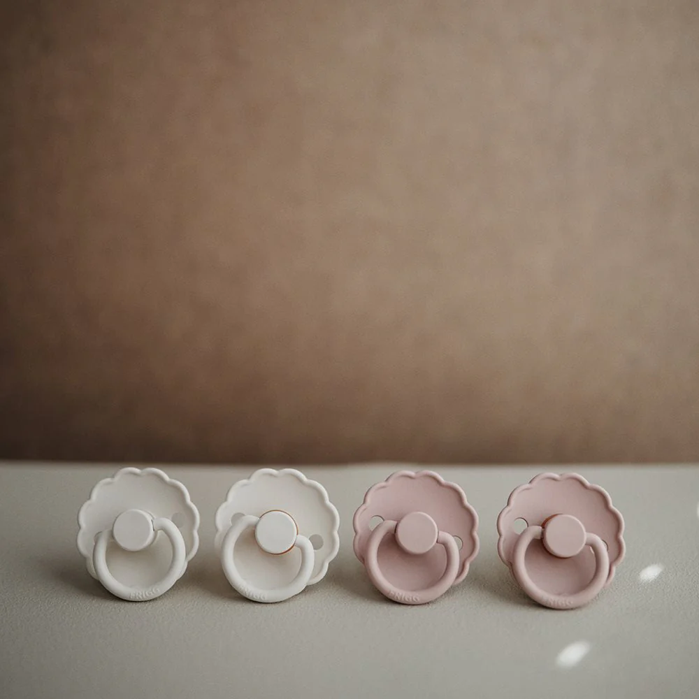 Il ciuccio FRIGG Daisy con bordi smerlati che imitano i petali di fiori รจ l’essenza del design elegante.
