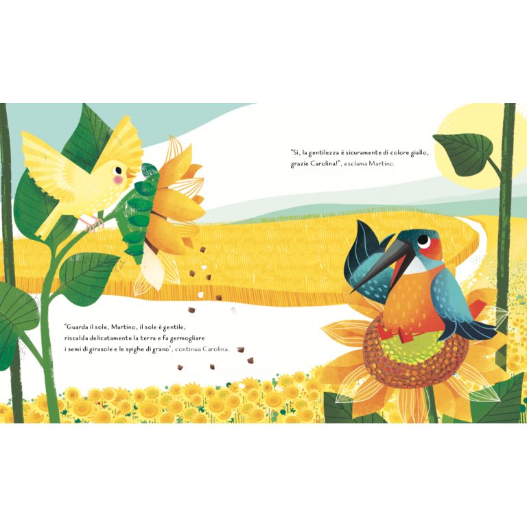 Martino, un martin pescatore, vorrebbe sapere di che colore è la gentilezza. Vola ovunque ponendo a tutti quelli che incontra la stessa domanda: “Di che colore è la gentilezza?”. Le risposte sono sempre diverse, ma, grazie a questo, Martino si rende conto che la gentilezza può avere tutte le sfumature dell’arcobaleno.