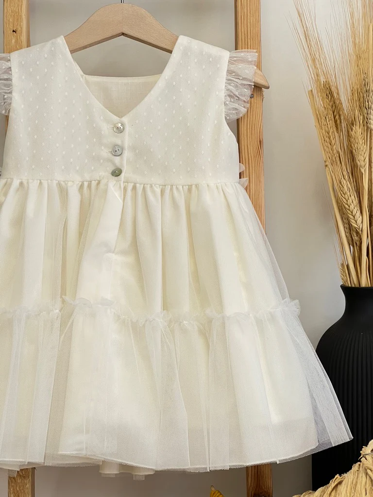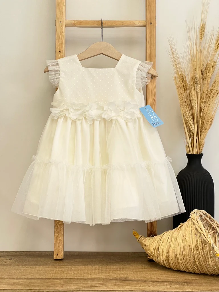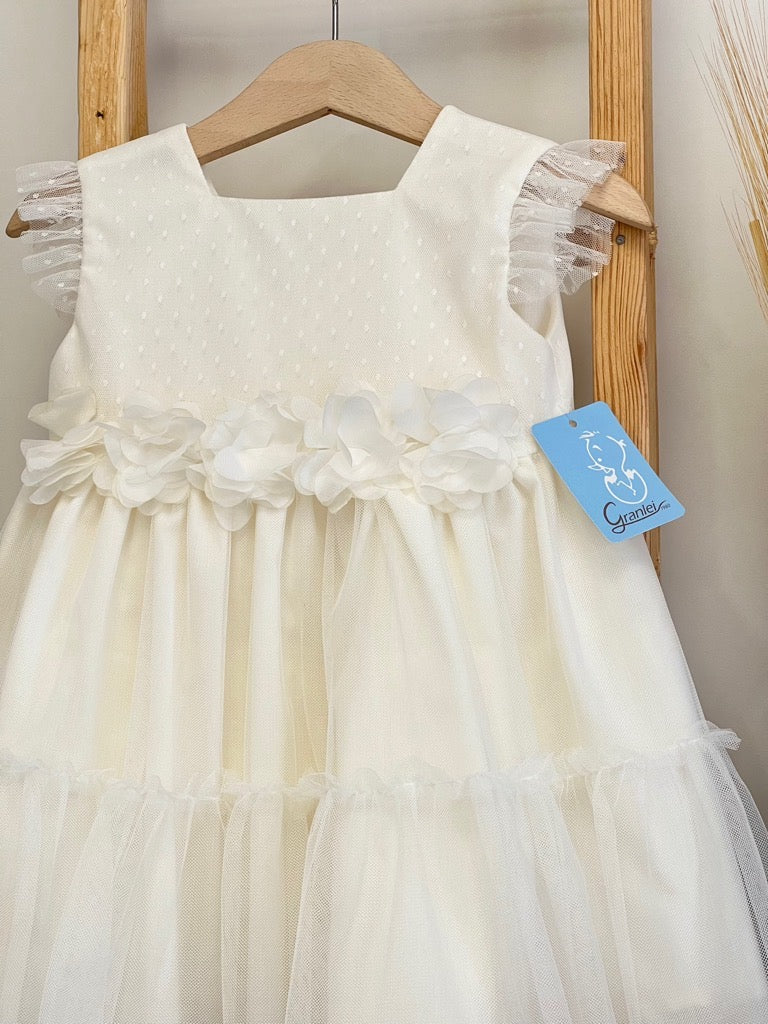 Vestitino Bambina con tulle a pois fiori sovrapposti in vita e balze in fondo100% cotone