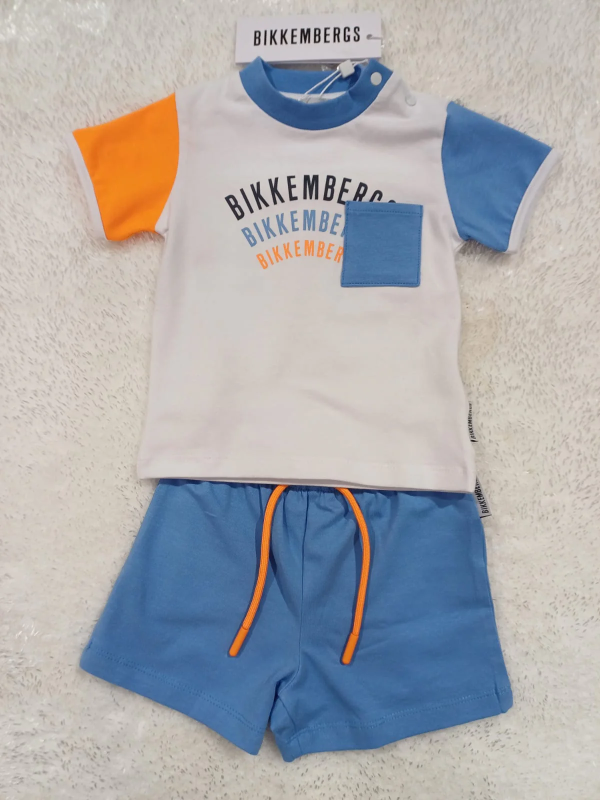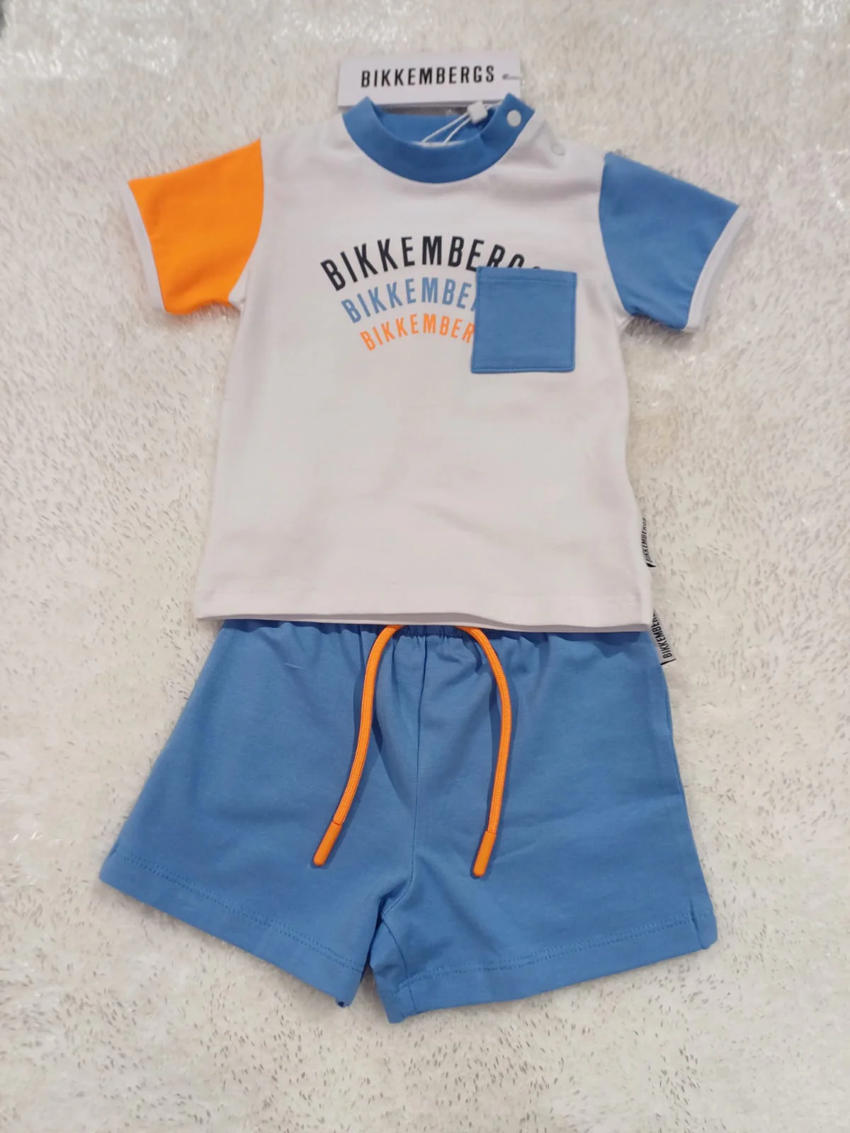Completo Bikkembergs T shirt cotone bianco Dettagli manica azzurra e arancione con taschino avanti Pantaloncino in cotone azzurro con laccetto arancione