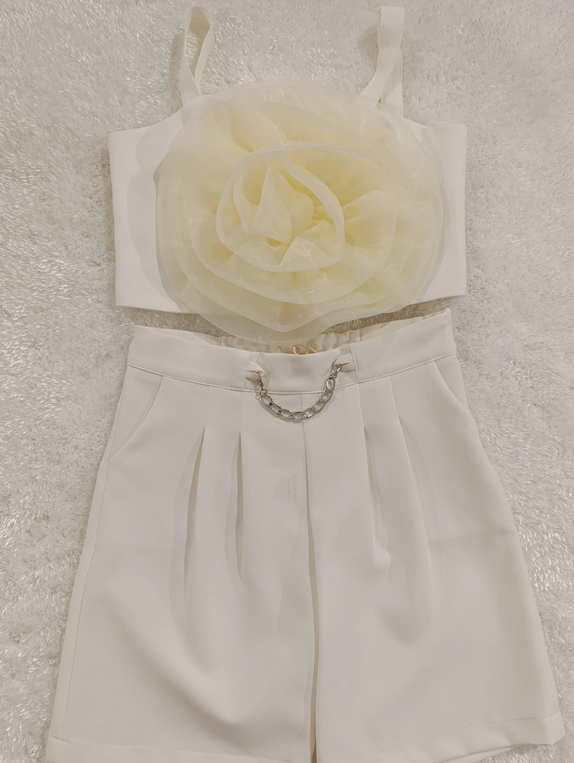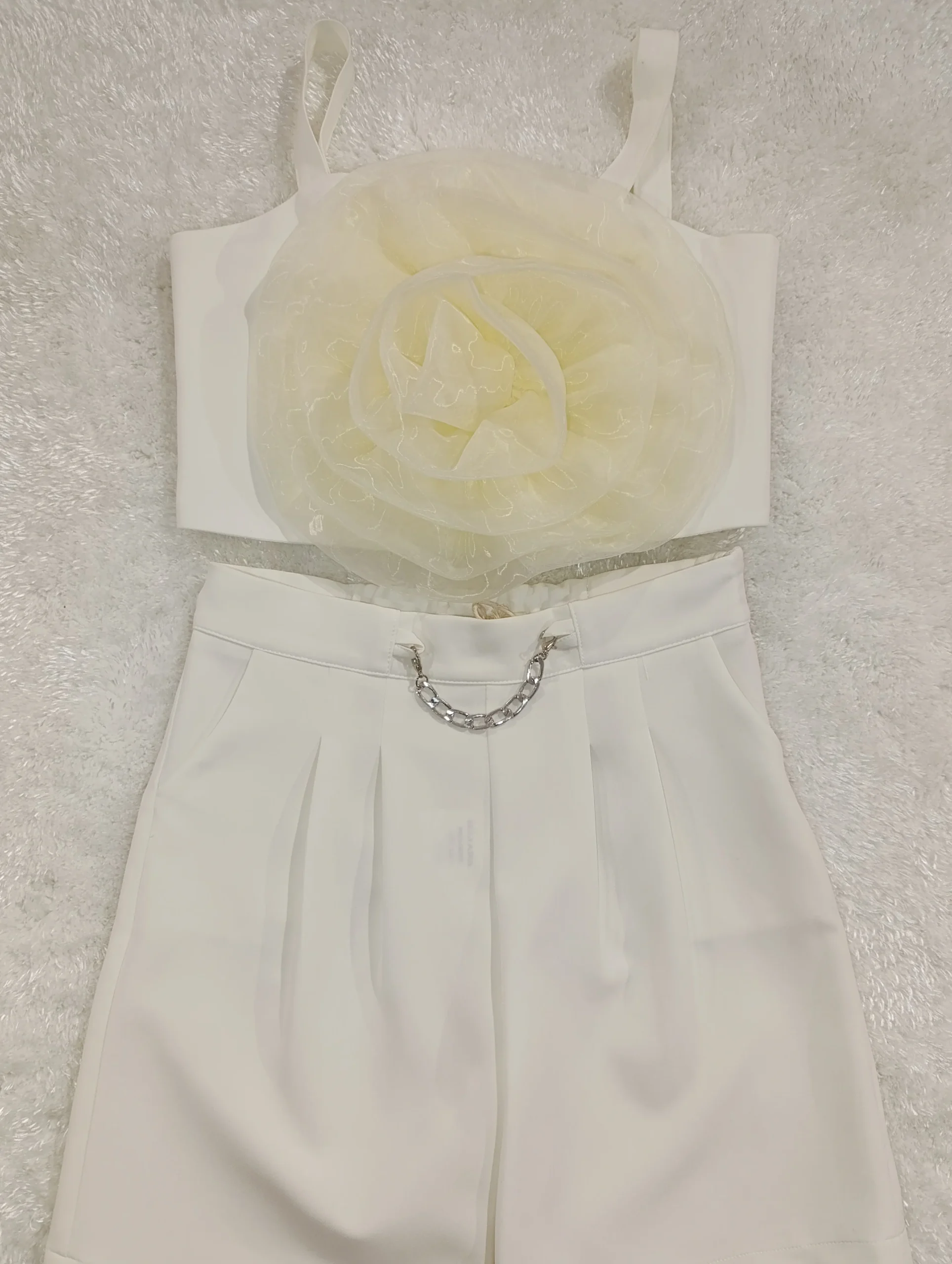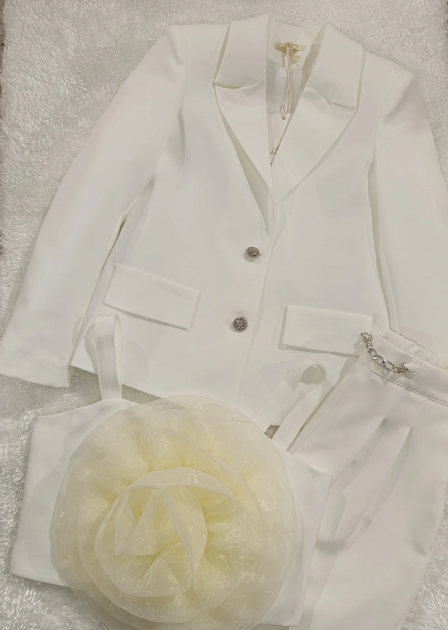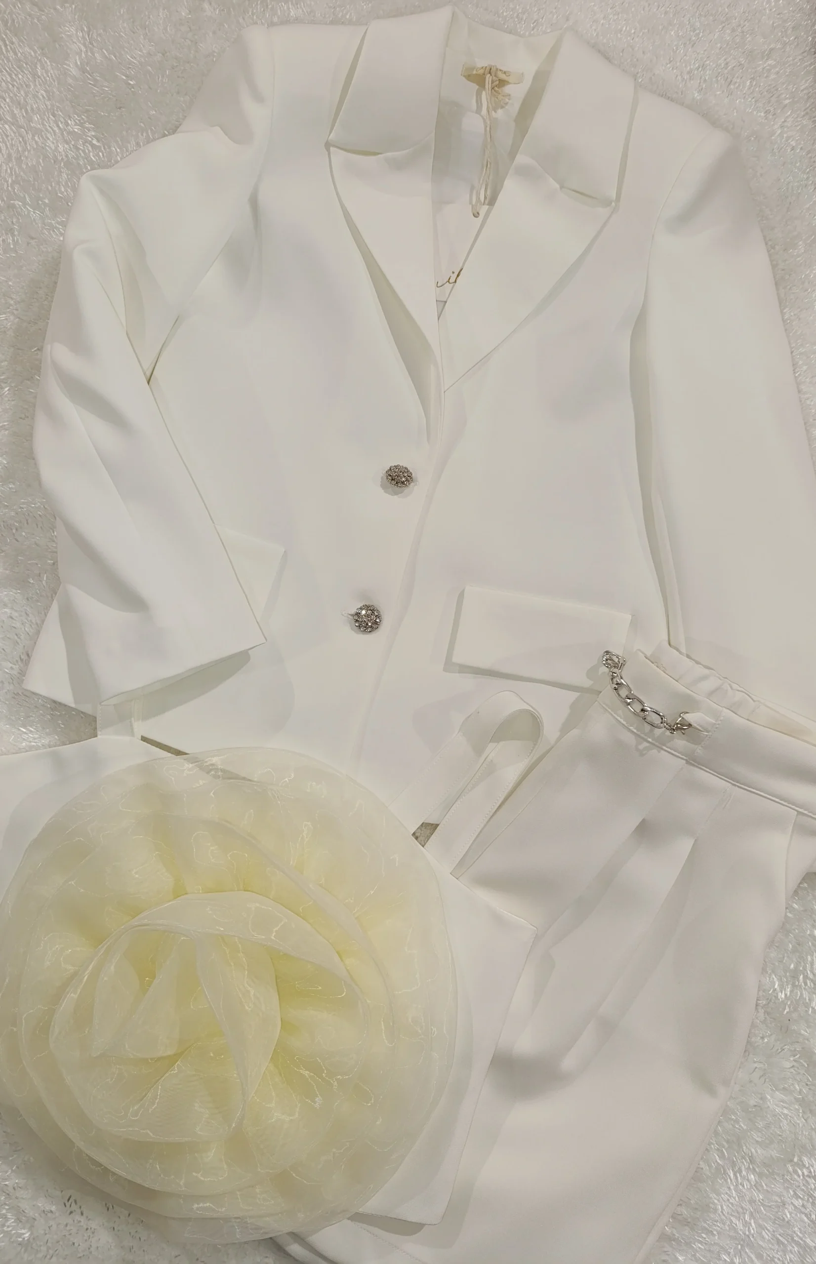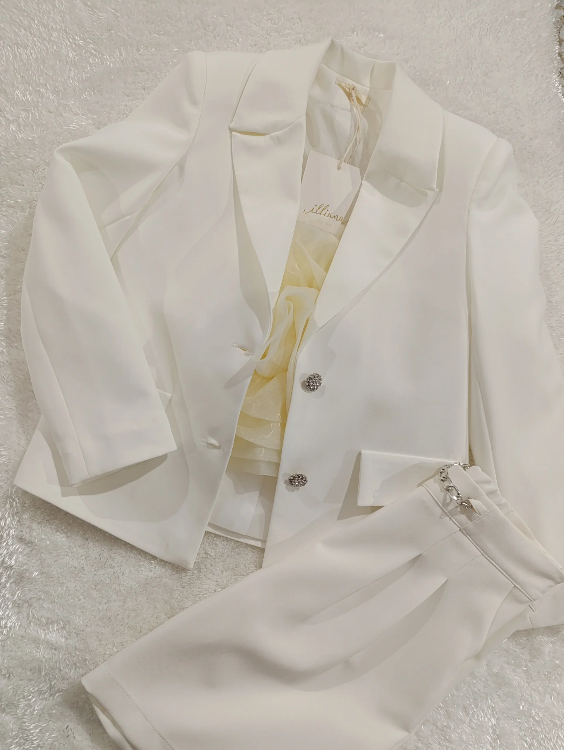Completo panna comunione /cerimonia bimba Giacca Bottoni con strass. Top con zip dietro e fiore grande in tulle Pantaloncini con tasche e dettaglio catena.