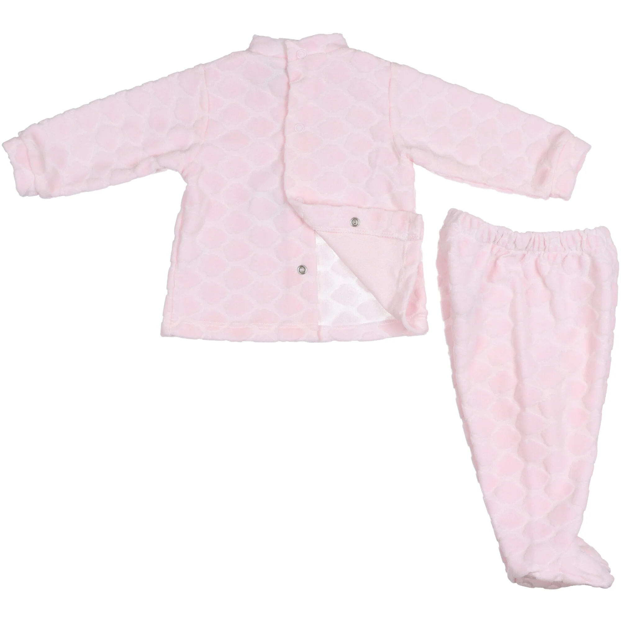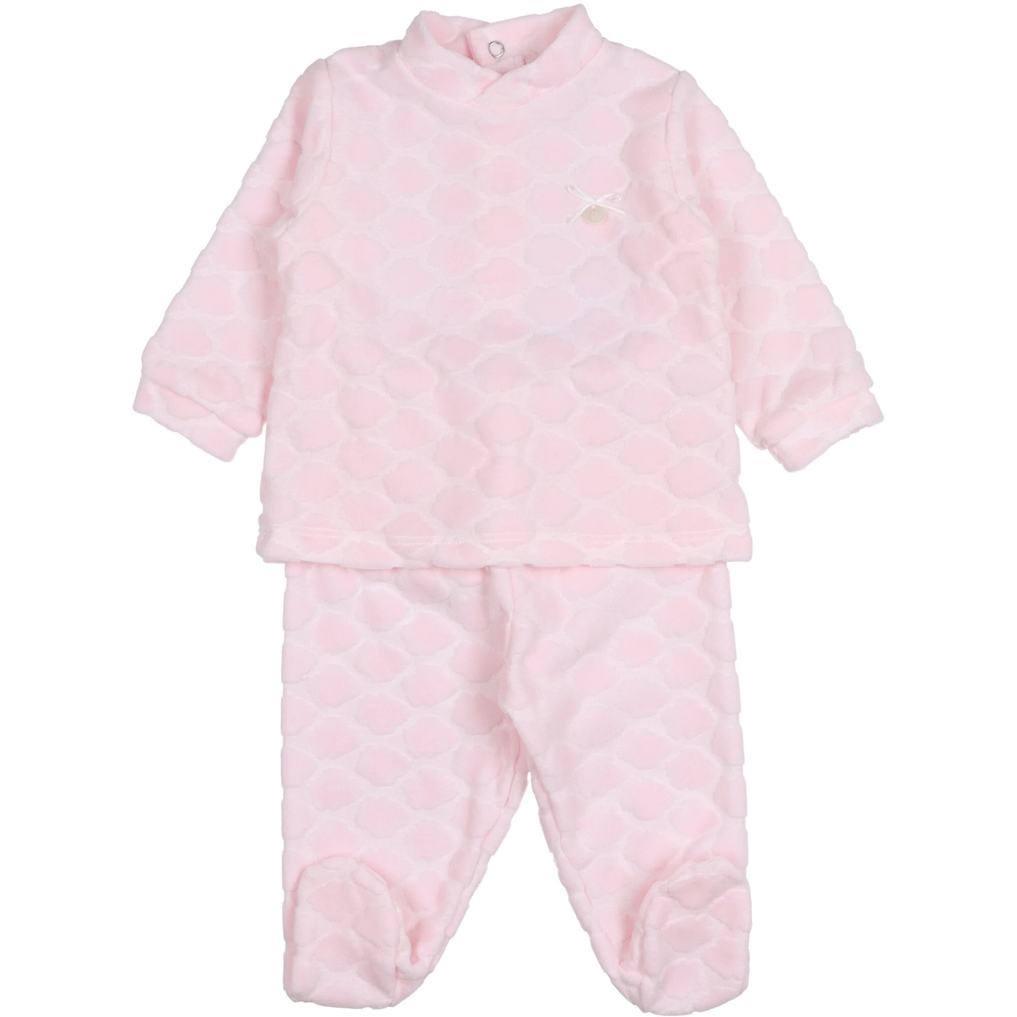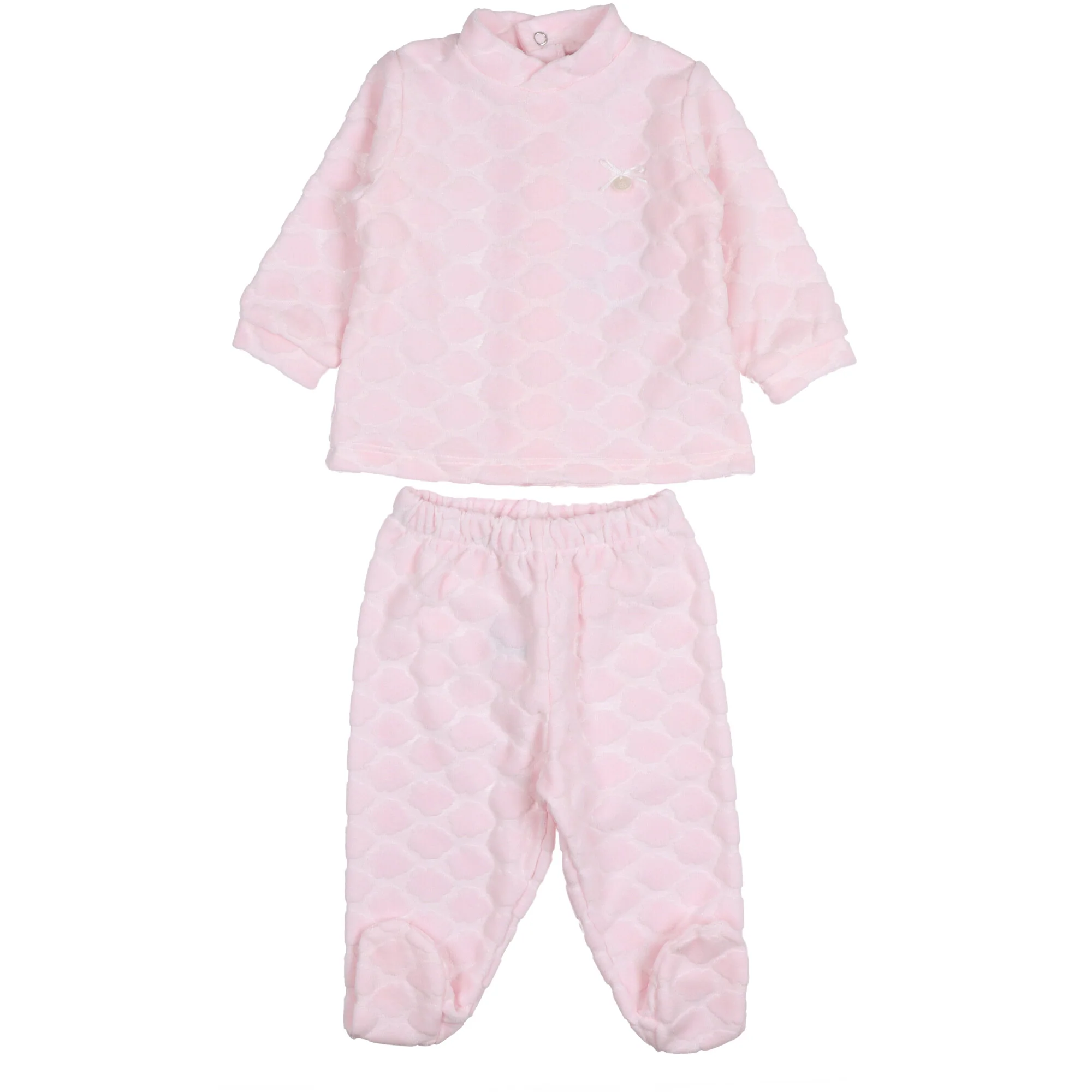 Completo due pezzi colore rosa pallido per neonata, realizzato in velluto di cotone super morbido lavorato in rilievo con nuvolette in ciniglia tono si tono, la maglia ha un colletto alla coreana e chiusura dietro con bottoni a pressione abbinata con ghettine, con vita elastica. Fiocchetto e madreperla decorativa sul petto.
