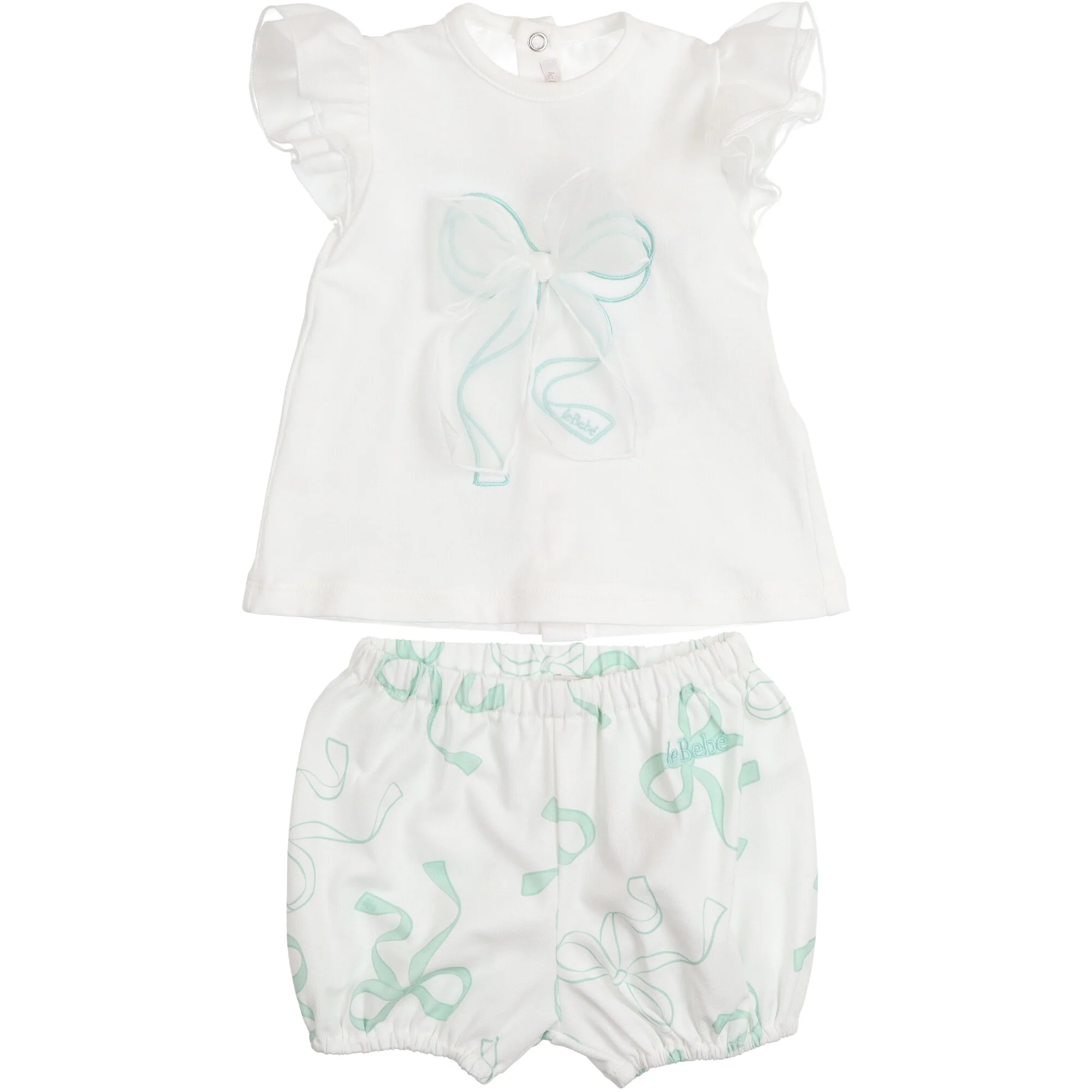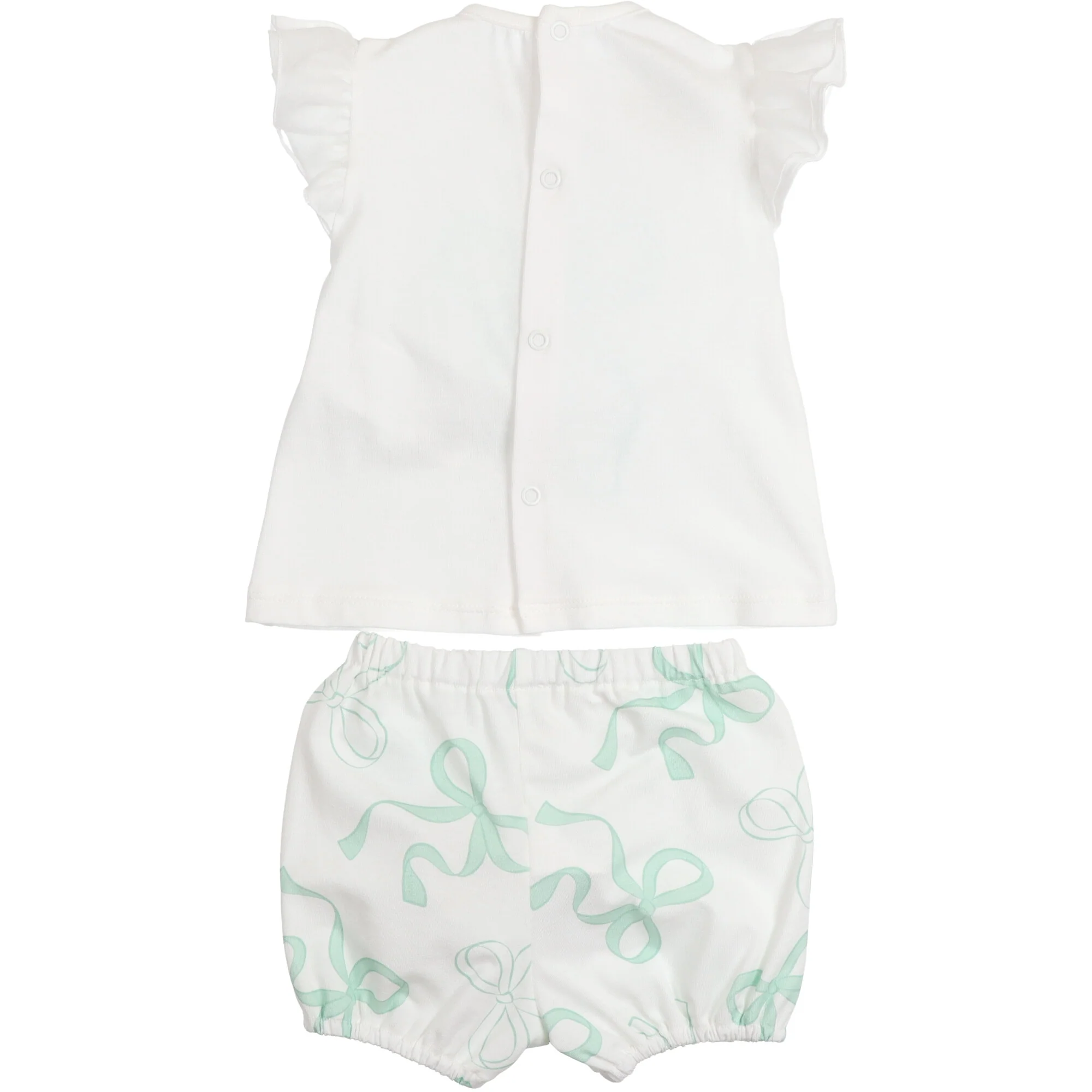 Completo due pezzi in jersey di cotone composto da t-shirt a maniche corte con volant in organza sulle spalle e stampa fiocco frontale in tono verde acqua, impreziosito da applicazione in tulle trasparente. Chiusura posteriore con bottoncini a pressione. Coordinato con short a palloncino in cotone elasticizzato con stampa fiocchi all over e vita e girogamba elasticizzati. Vestibilitร comoda, ideale per la stagione estiva.