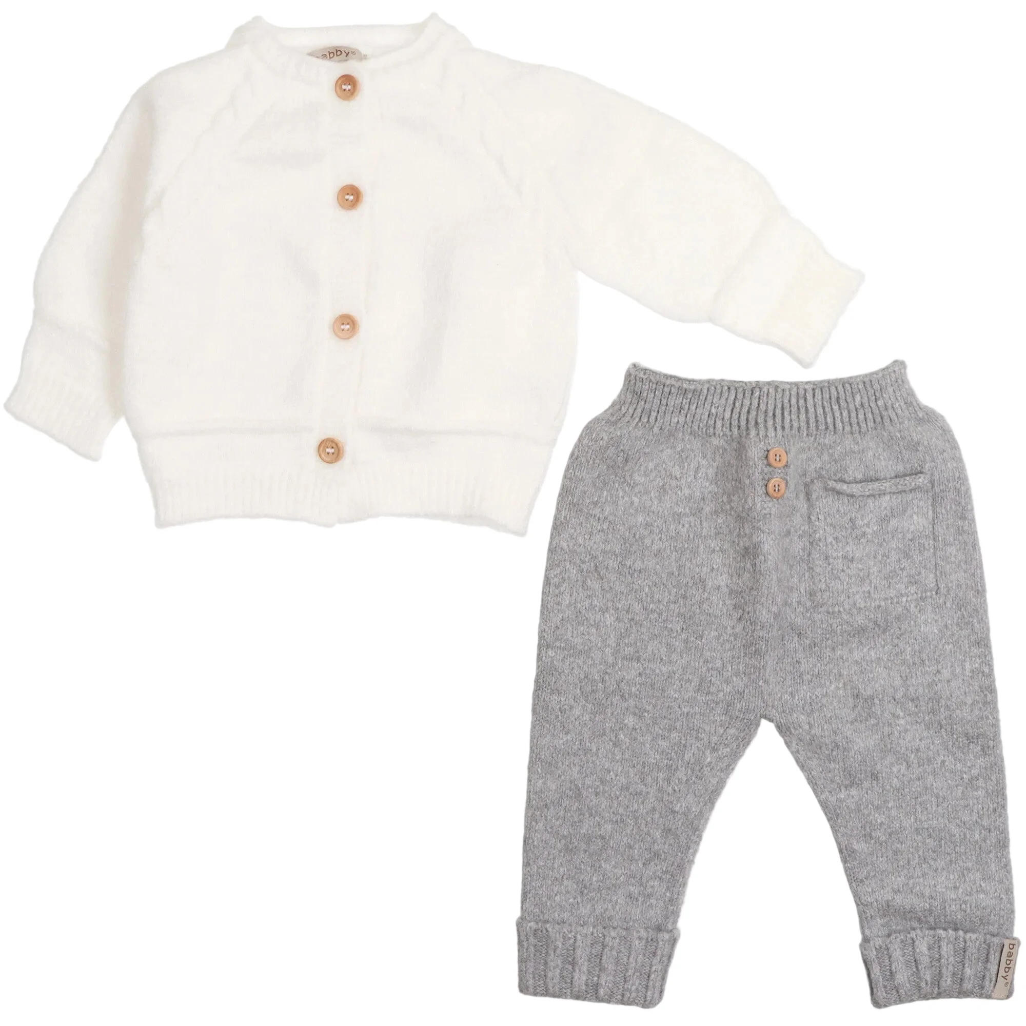 Completo per neonato realizzato in misto lana. Cardigan colore bianoc chiuso davanti con bottoni. Pantalone senza piede morbido in vita, colore grigio