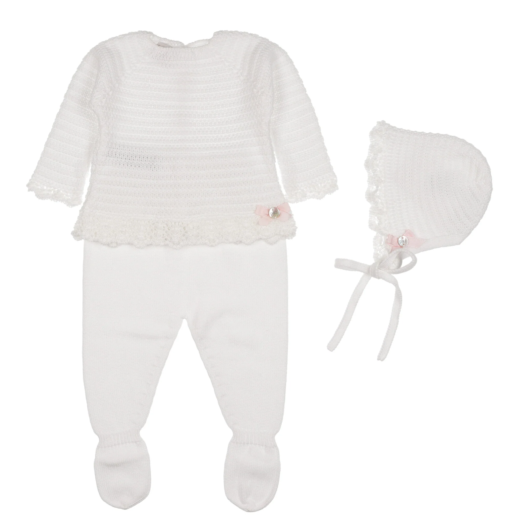 DESCRIZIONE Completo bianco realizzato in filo di cotone. Maglioncino lavorato effetto uncinetto, chiusura dietro con bottoni ed asole. Ghettine abbinate delicatamente elasticizzata. Completo di cuffia abbinata e ficco rosa sul lato, Composizione: 50% cotone, 50% acrilico. Cura: lavaggio ad acqua, non candeggiare, non utilizzare l’asciugatrice, si puรฒ lavare a secco e si puรฒ stirare.