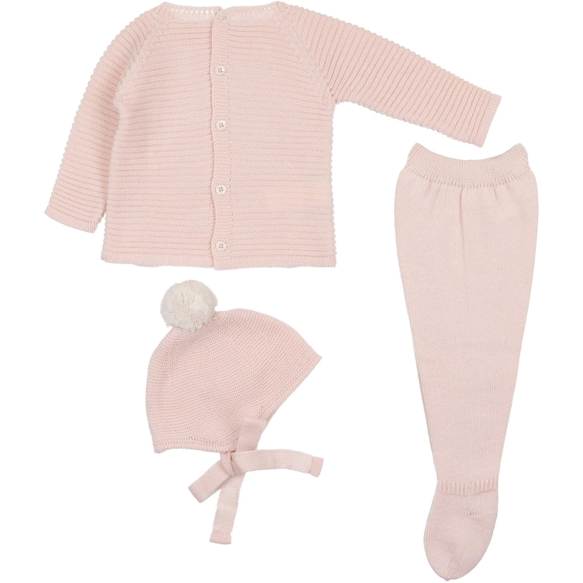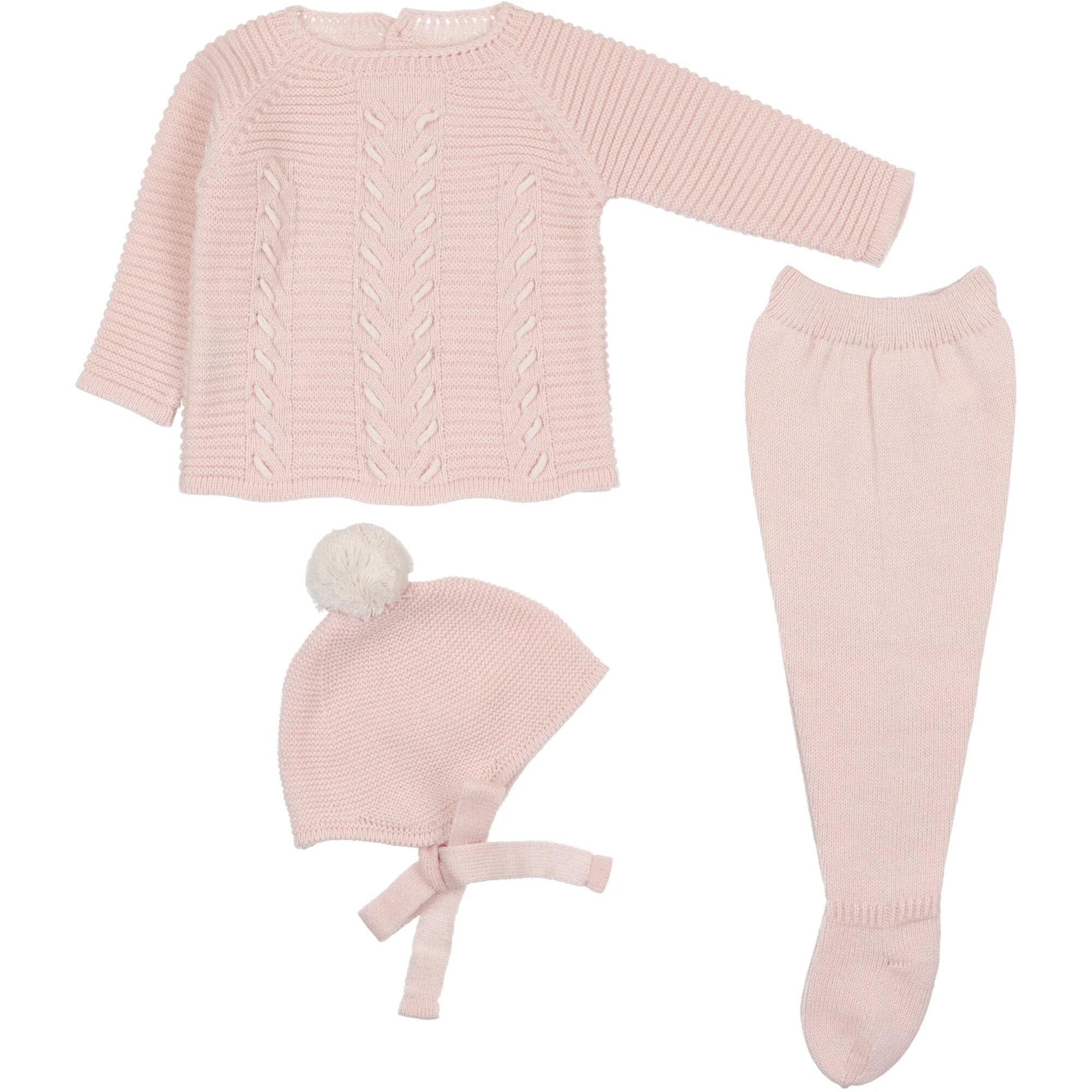 Completo in misto lana include maglia, pantaloni con piedini e cappellino con pompon, tutti coordinati nel classico e raffinato azzurro pastello.