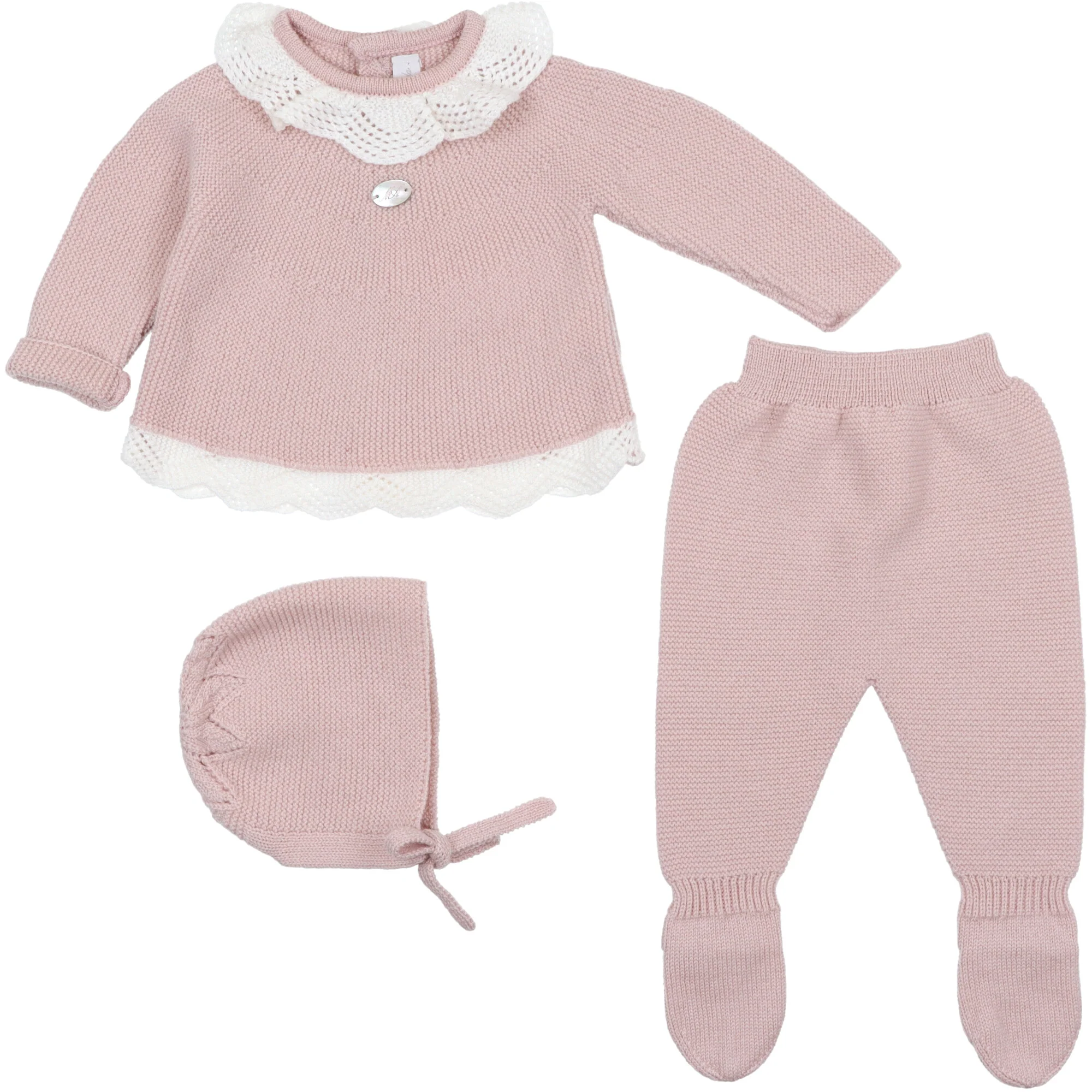 La maglia presenta un meraviglioso colletto ricamato a doppia balza, che dona luminositร e un tocco romantico al capo. Il bordo inferiore riprende lo stesso motivo lavorato, creando un insieme armonioso e delicato. I pantaloni con piedini mantengono la piccola sempre al caldo, garantendo comfort e libertร di movimento.