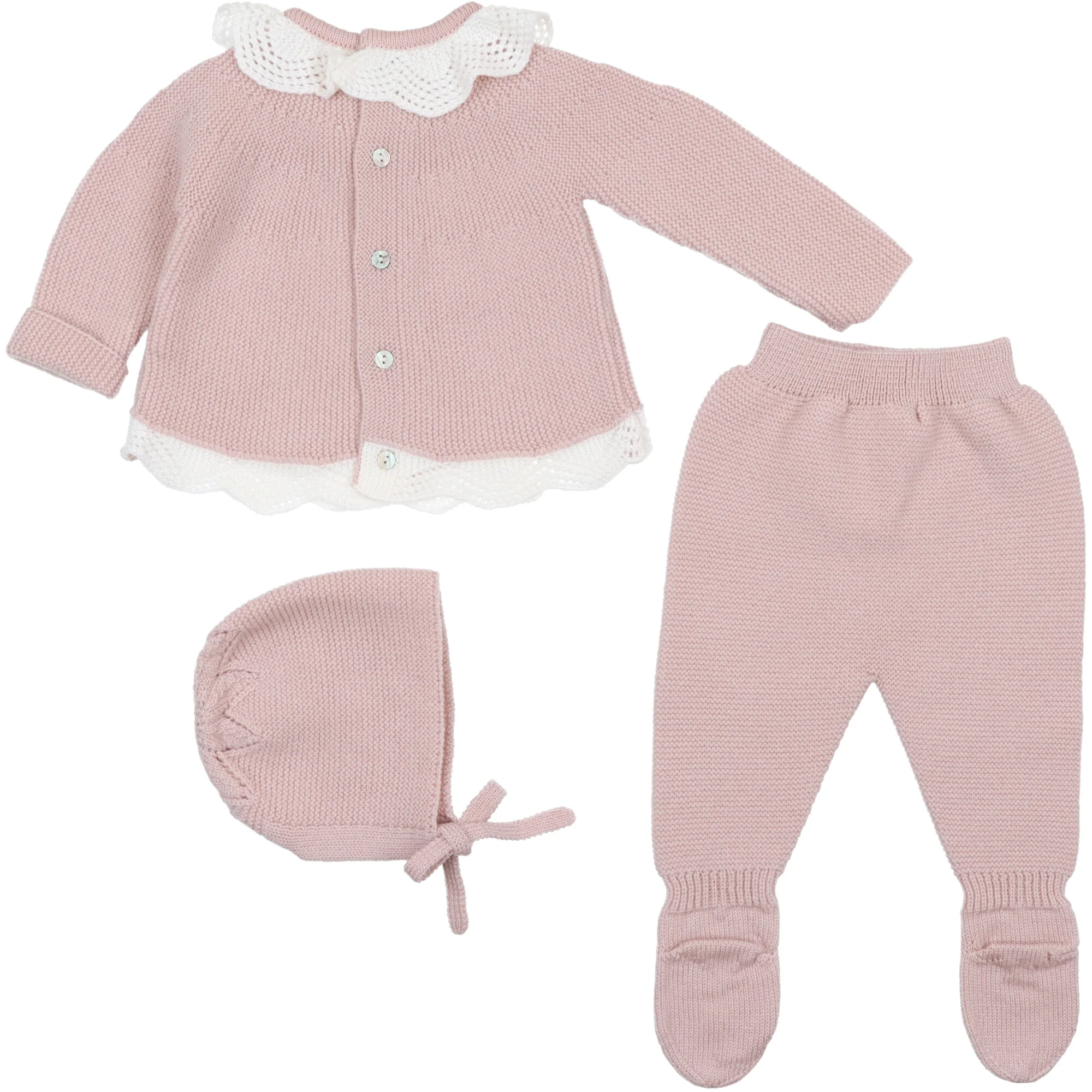 Il completino รจ arricchito da un cuffietta coordinata con elegante lavorazione a onde e laccetti da annodare sotto il mento, per una vestibilitร stabile e avvolgente.