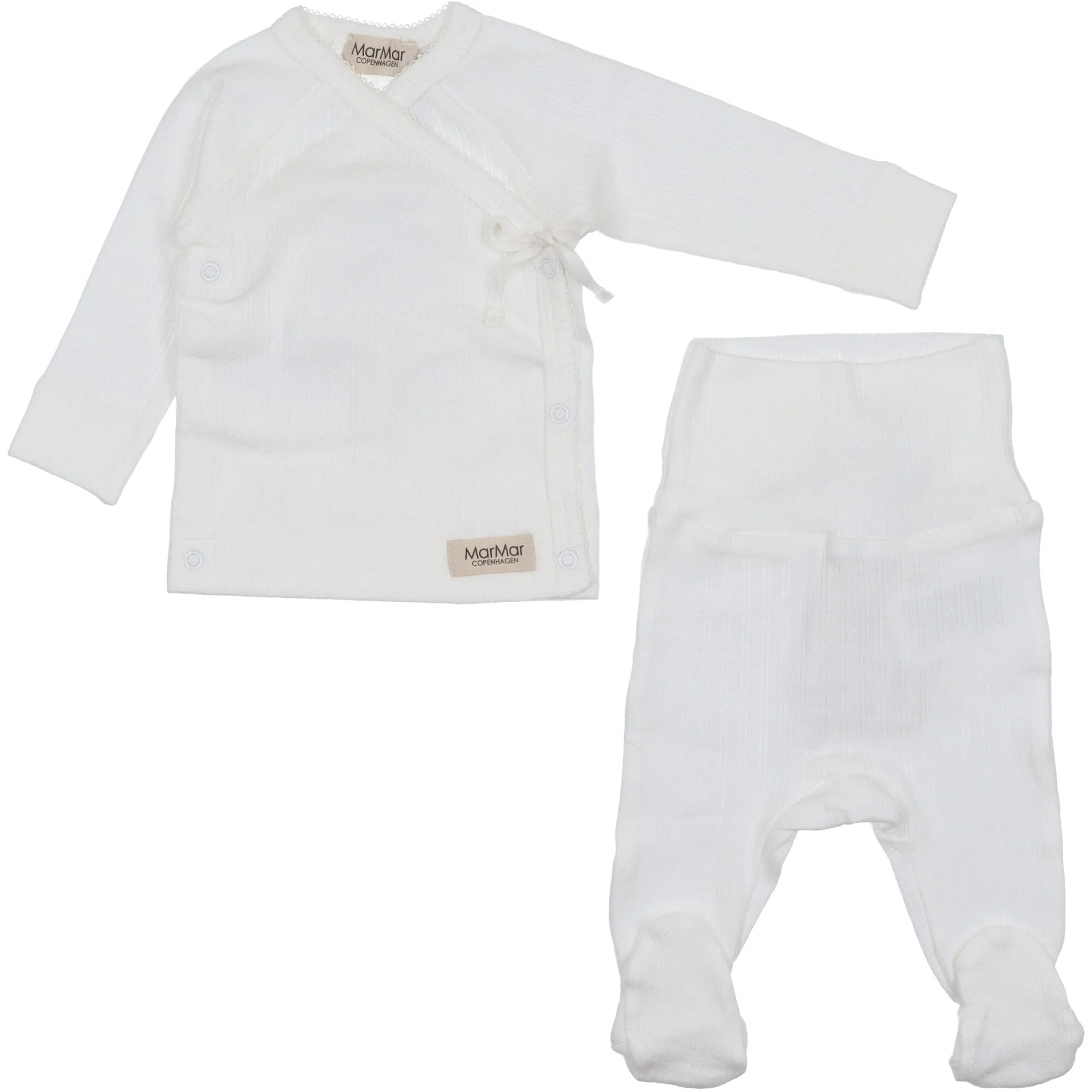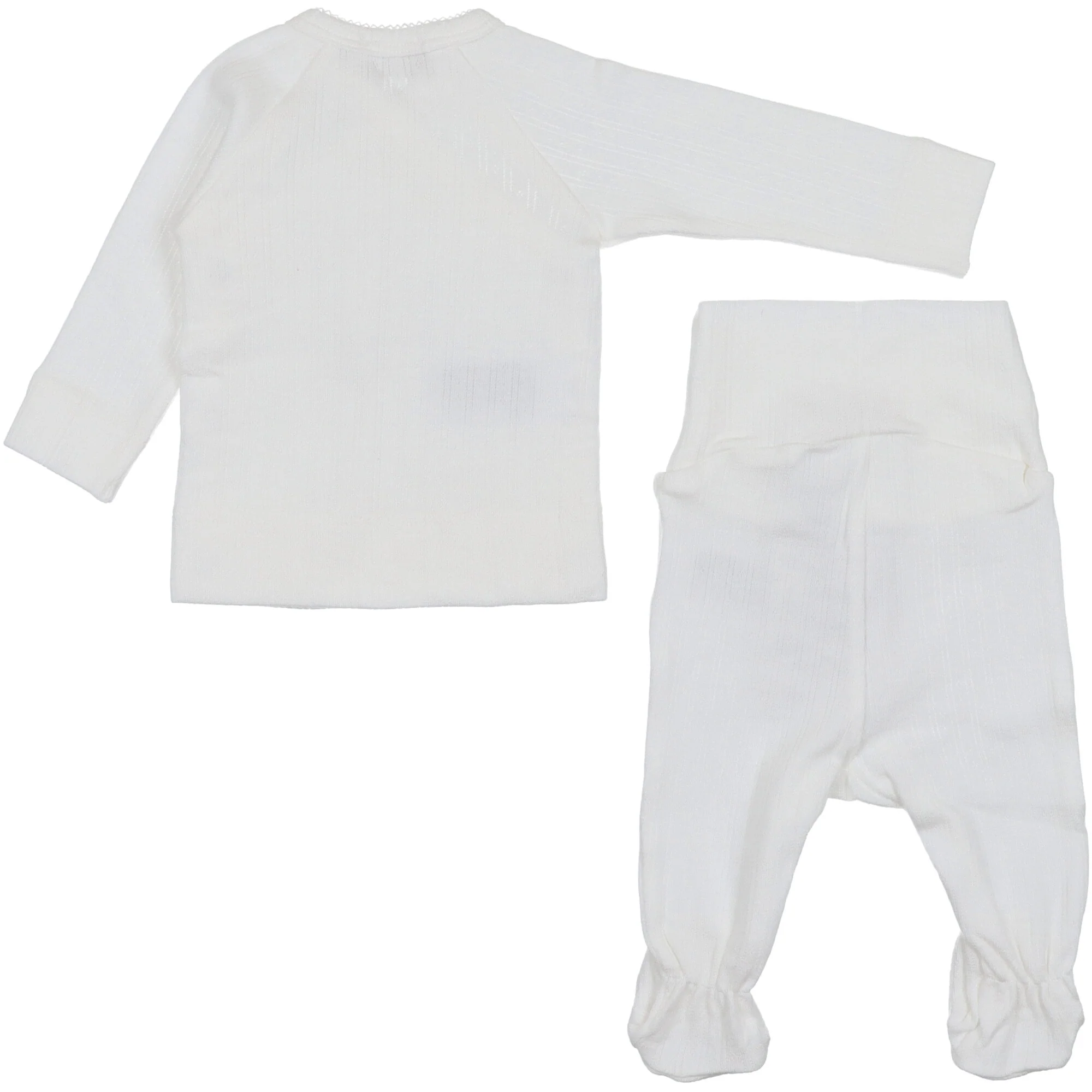 Blusa a maniche lunghe per neonati con chiusura avvolgente. La blusa si chiude con bottoni a pressione ed รจ morbida, elasticizzata e comoda da indossare. Comodi pantaloni con piedini per neonati e morbido elastico dietro al tallone. I pantaloni sono morbidi, elastici e comodi da indossare. Completo in maglia di cotone pointelle, caratterizzato da delicati […]