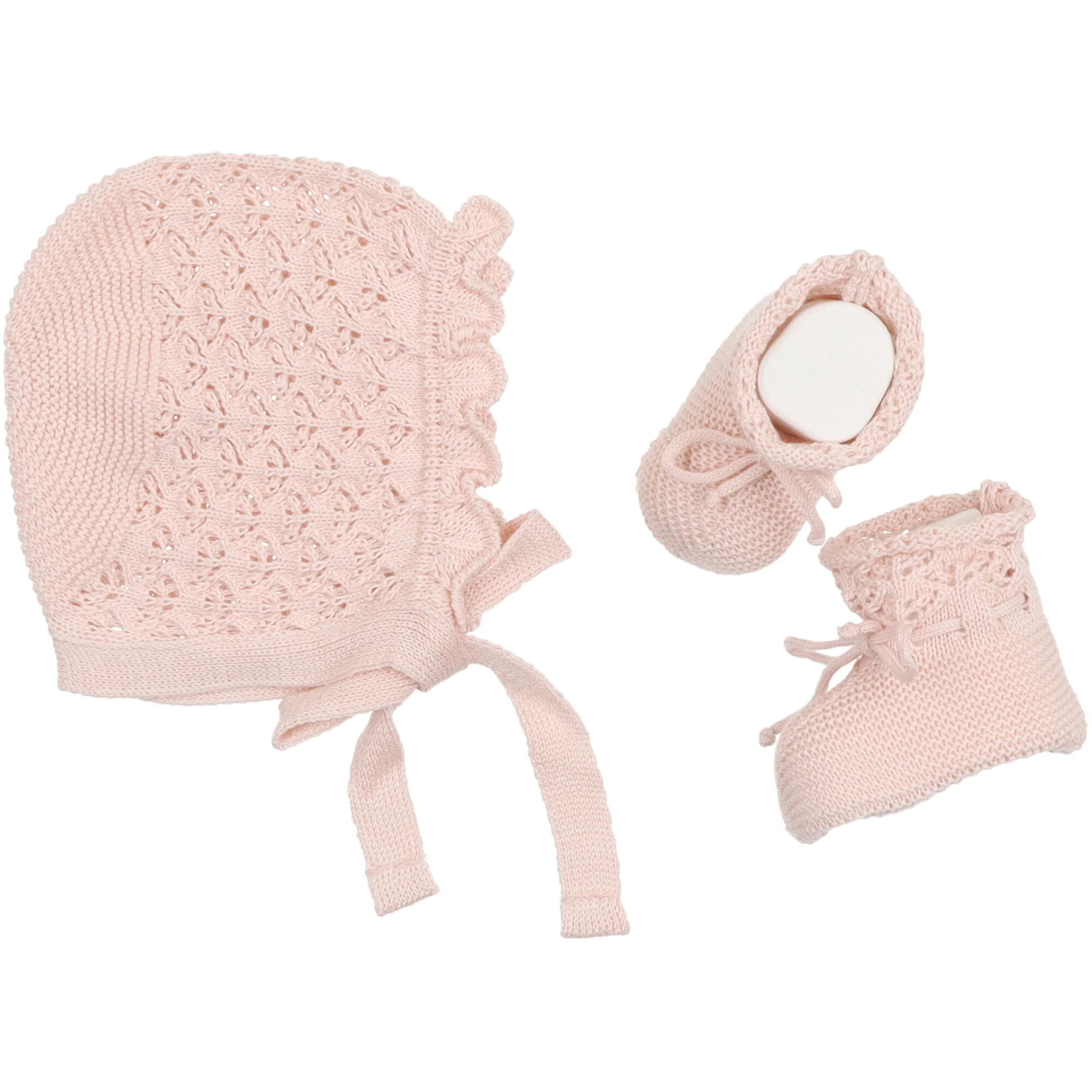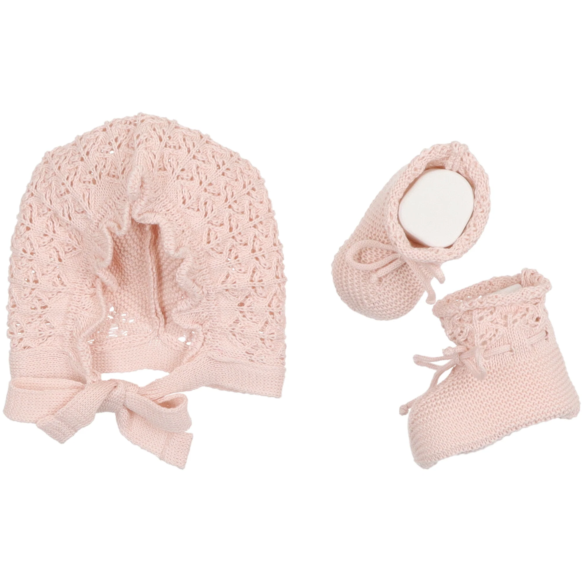 Cappellino modello cuffia in filo di cotone rosa, calzetti abbinato con fiocchetto.