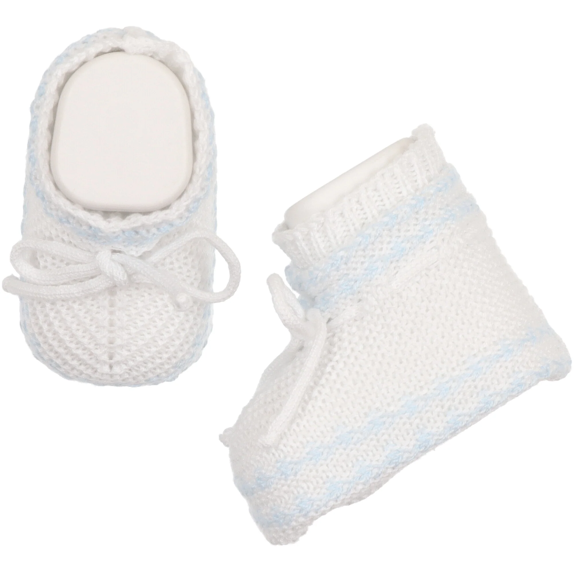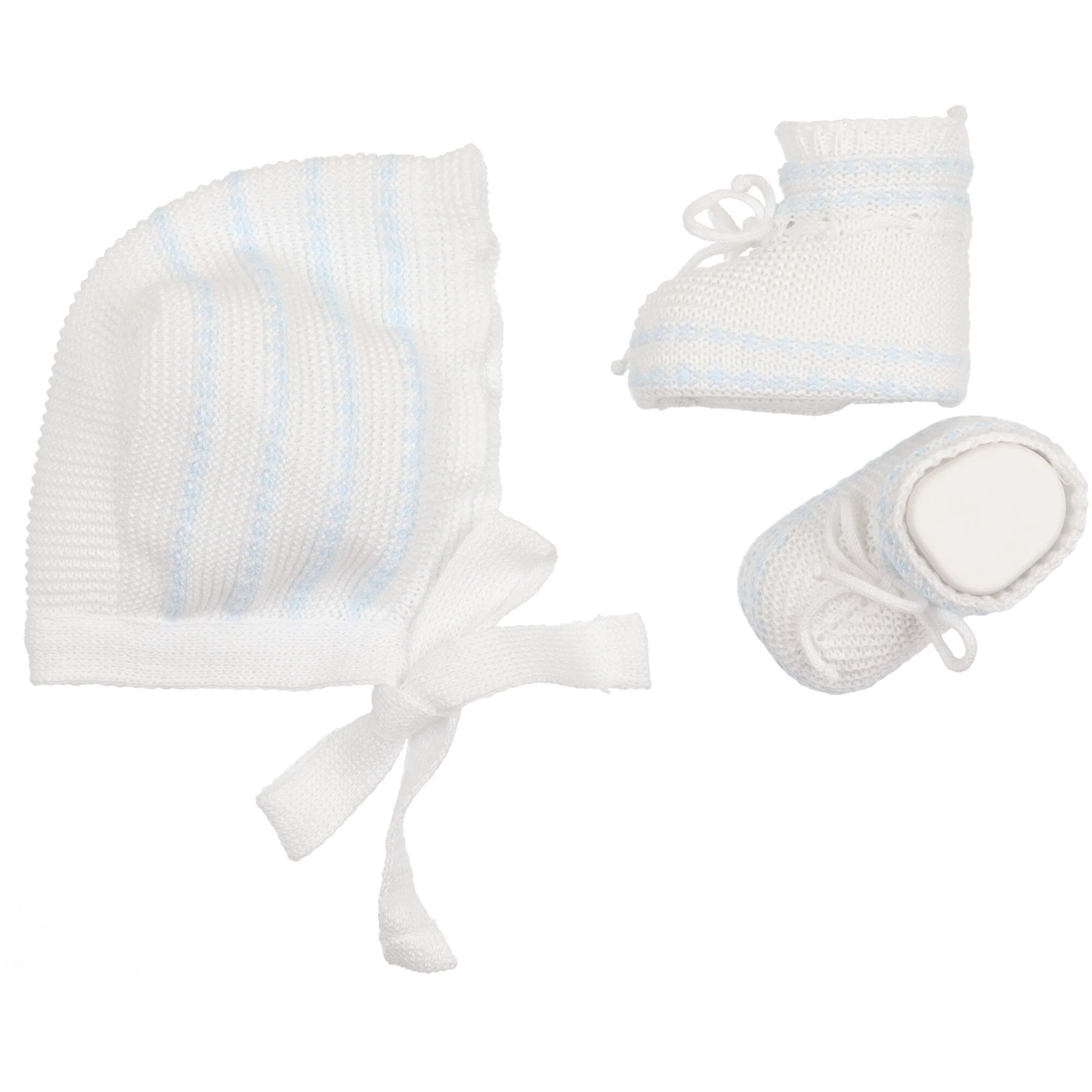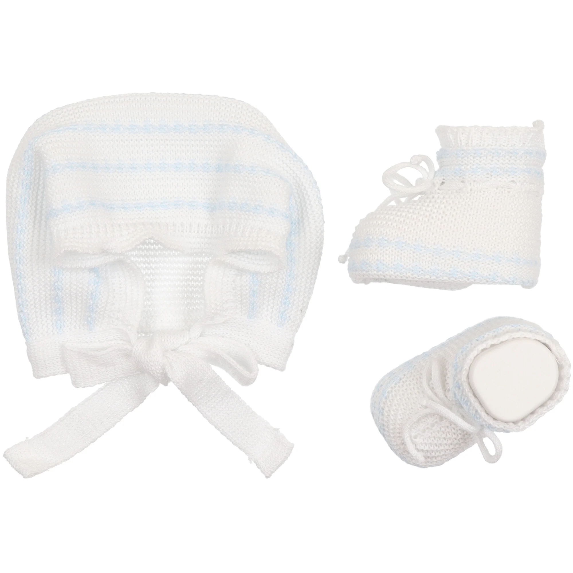 Cappellino modello cuffia in filo di cotone con riga azzurra, calzetto abbinato con fiocchetto.