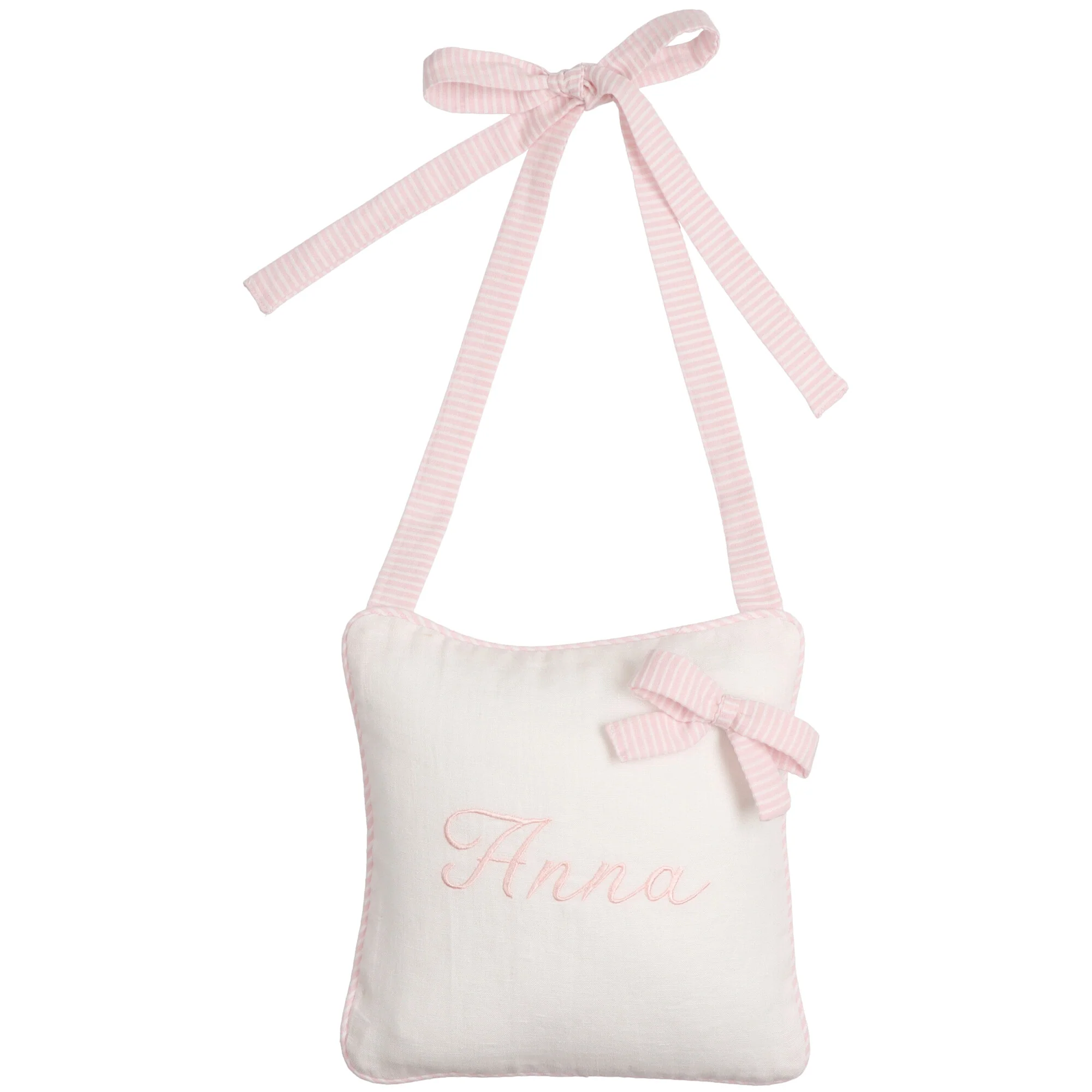 DETTAGLIO cuscino nascita sfoderabile realizzato in tessuto di lino e piquet bianco. Forma quadrata con fiocco abbinato. Personalizzabile. Nelle NOTE dell’acquisto scrivi il nome da ricamare. Forma quadrato: cm 15 x 15 cm circa. Composizione: 100% lino, 100% cotone – Imbottitura 100% poliestere. Cura: consigliamo il lavaggio a mano per conservarne morbidezza e colore.