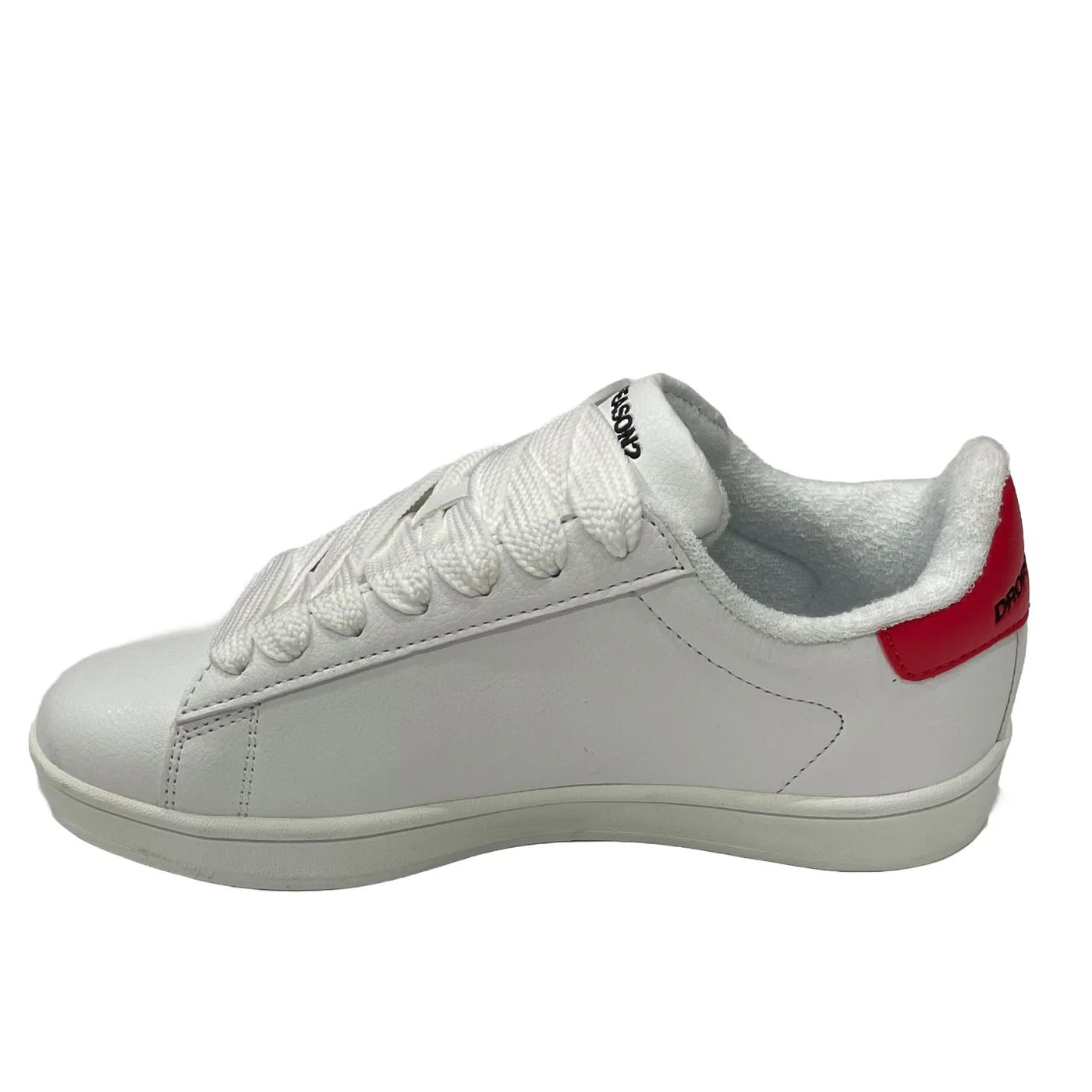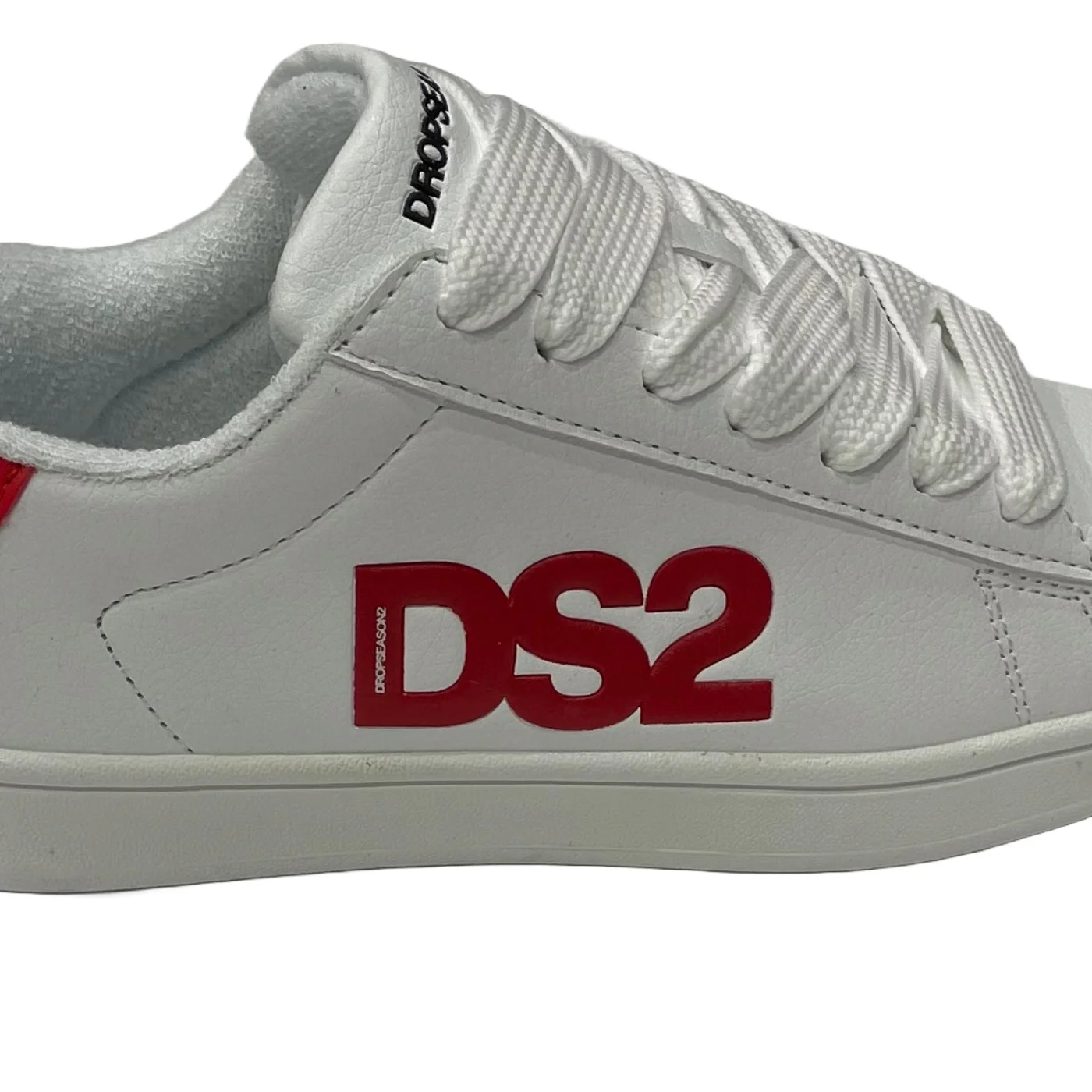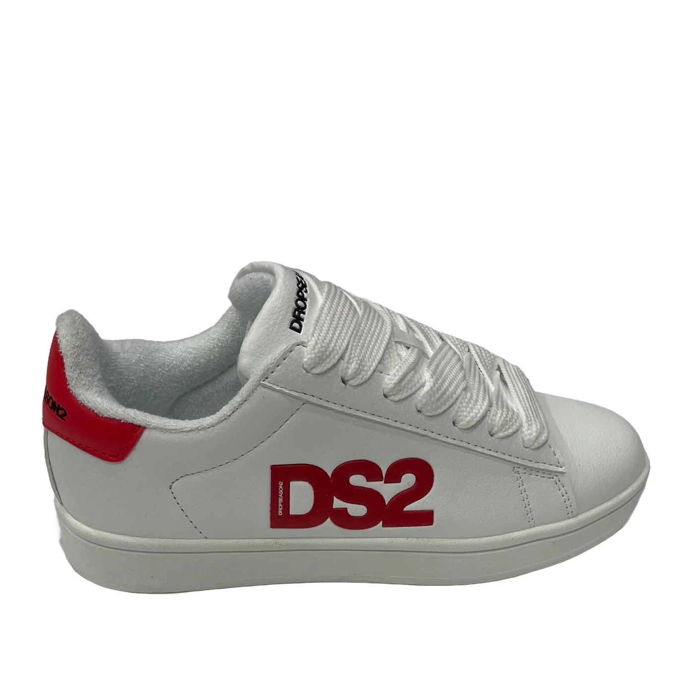DS2 sneakers con lacci unisex in ecopelle bianca Dettagli rossi Logo fronte retro e laterale Composizione: 60% poliuretanico 20% poliestere Made in Italy Collezione Continuativa Vestibilitร :Taglia Europea