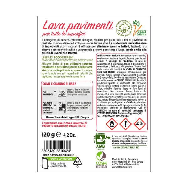 Il detergente in polvere, certificato biologico, studiato per pulire tutti i tipi di pavimenti in piastrelle, in modo efficace ed ecologico e senza lasciare aloni.
