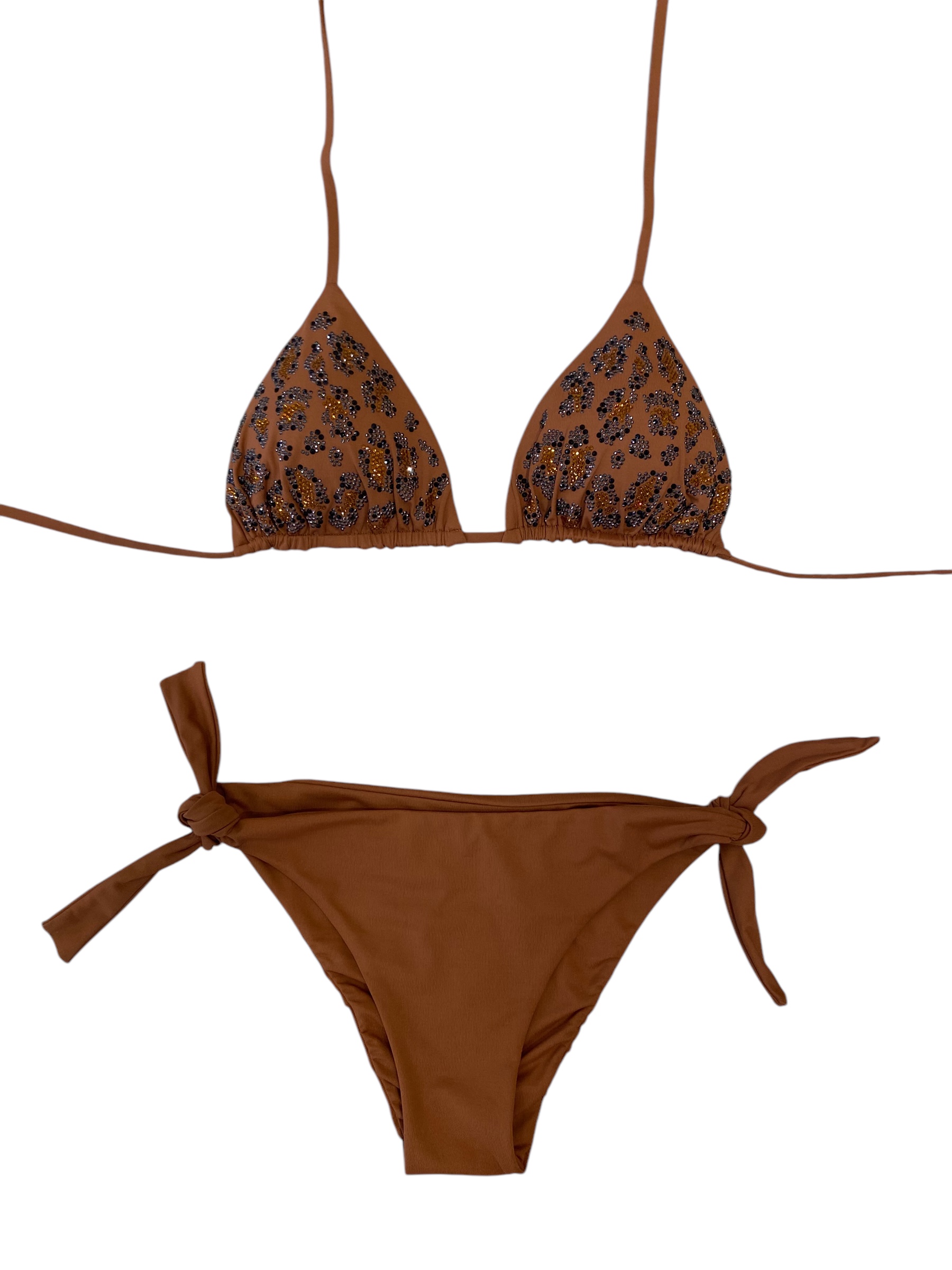 Bikini triangolo scorrevole con imbottitura estraibile, in un sofisticato color tabacco. Borchiette e strass compongono una stampa a macchia di leopardo sul reggiseno, che ti faranno splendere sotto il sole.