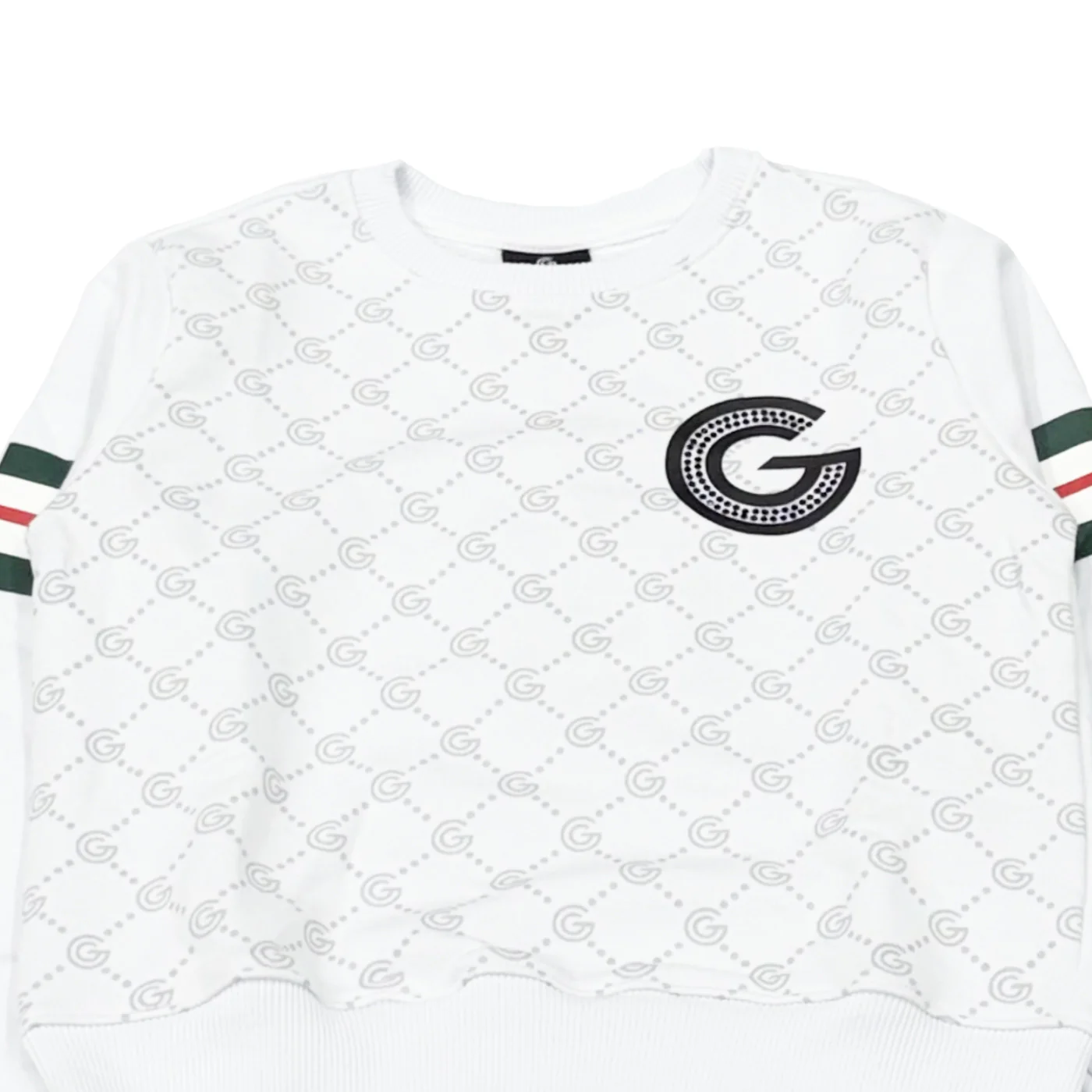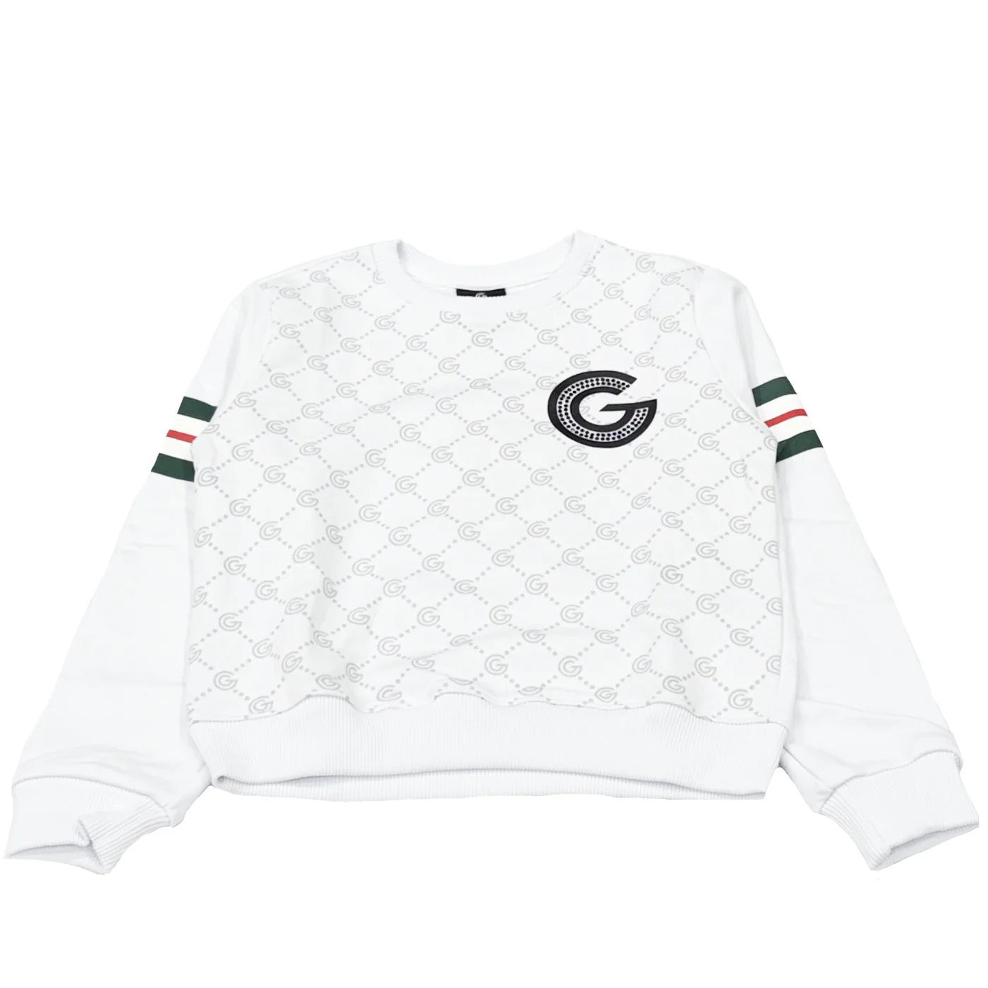 Gabriella Gucci felpa girocollo bambina in cotone garzato bianca Logo all over Bande logo su maniche Logo in strass lato cuore Collo polsini e fondo a coste Composizione: 100% cotoneMade in ItalyCollezione Primavera Estate Vestibilitร :Taglia Etร