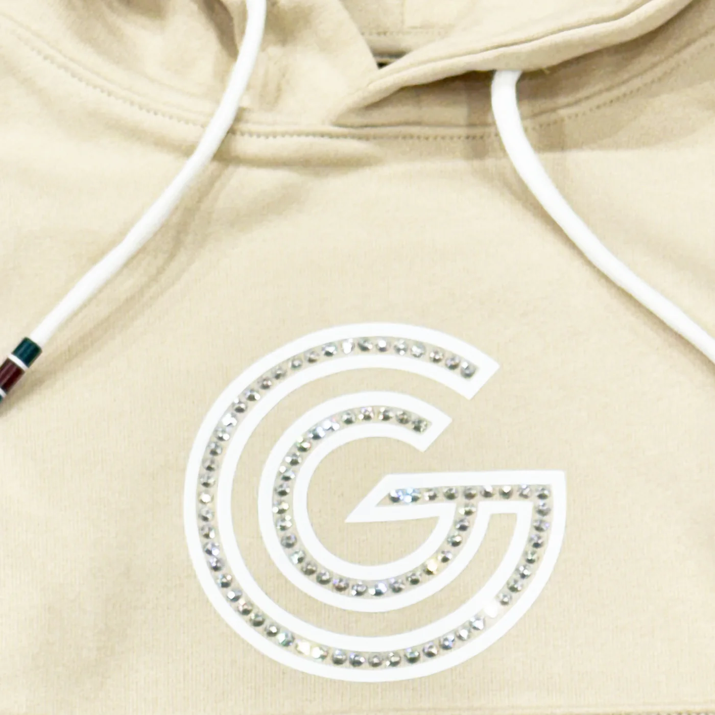 Gabriella Gucci felpa con cappuccio ragazza in cotone garzato beige Logo frontale in strass Tasca a marsupio frontale Bande logate su maniche Polsini e fondo a coste Composizione: 100% cotone Made in ItalyCollezione Primavera Estate Vestibilitร :Taglia Etร