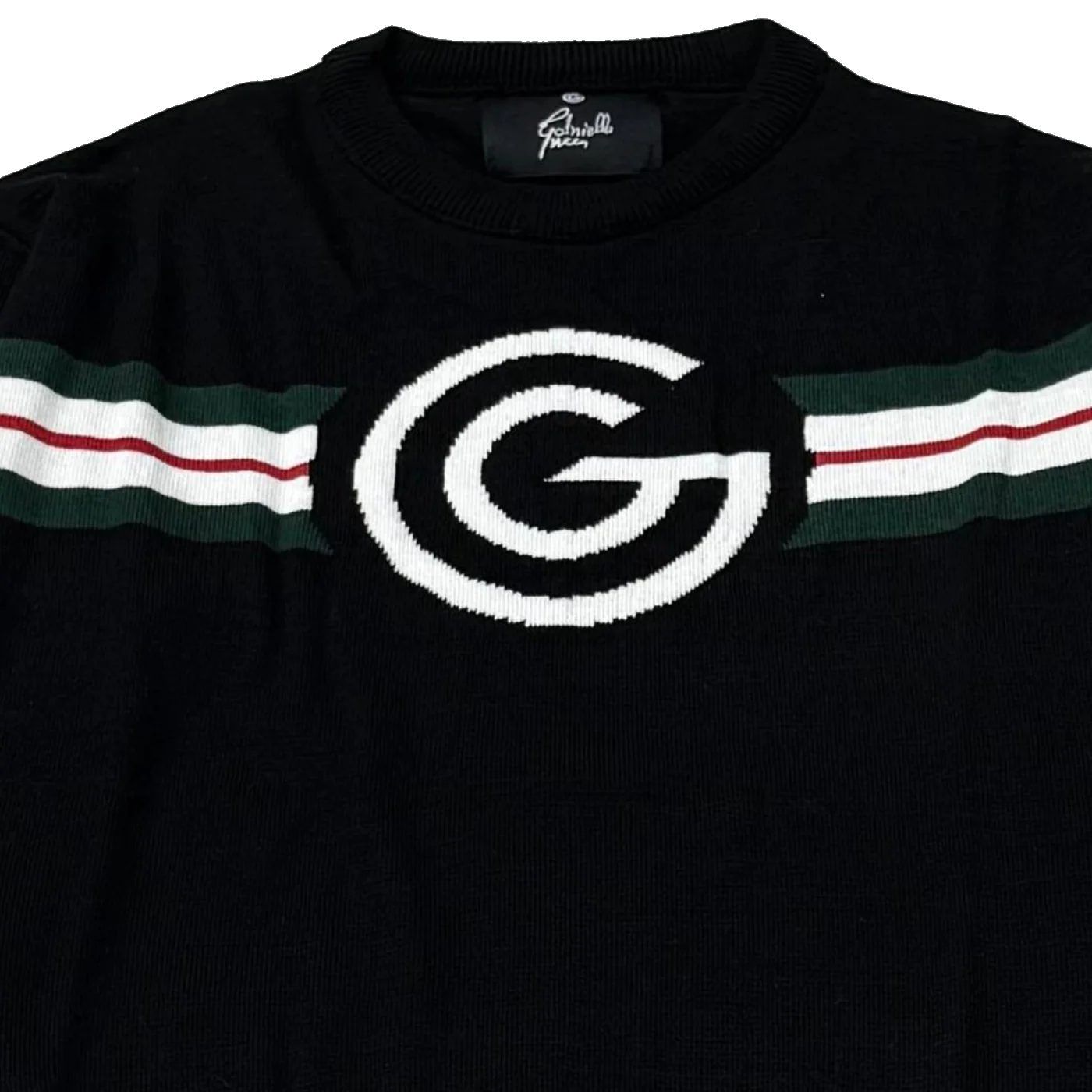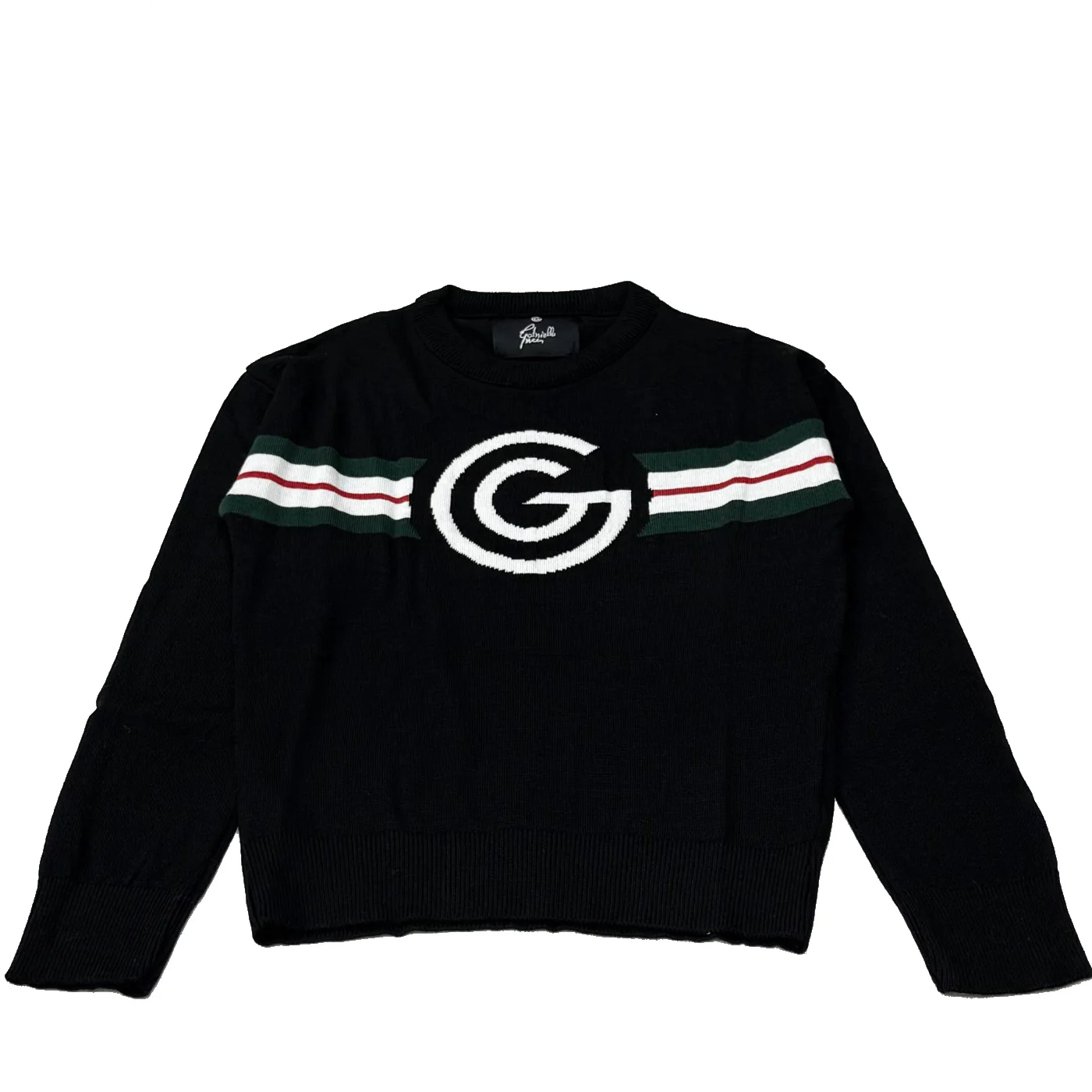 Gabriella Gucci maglia girocollo teen in misto viscosa neraLogo frontale Collo polsini e fondo a costeComposizione: 52% viscosa 26% pรฒoliestere 22% poliammideMade in Italy Collezione Autunno Inverno Vestibilitร :Taglia Etร