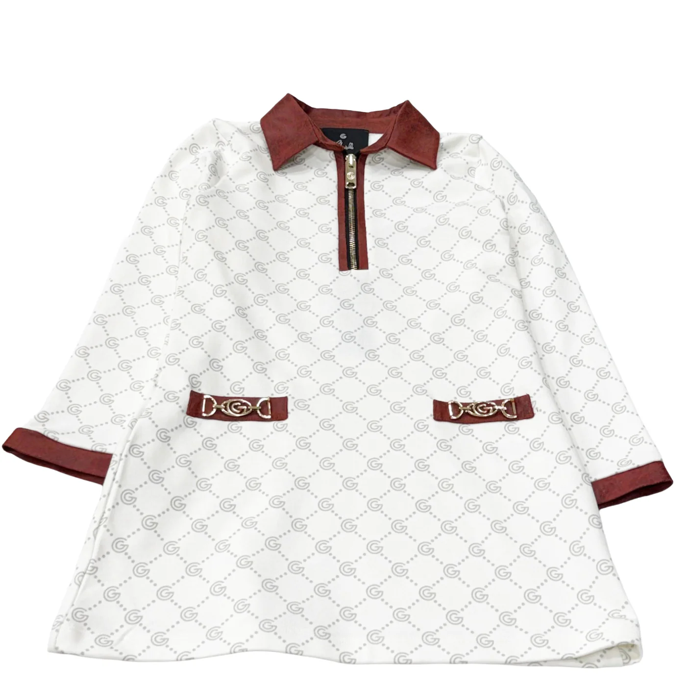 Gabriella Gucci vestito monogram teen in cotone garzato bianco Collo camicia con chiusura zip Tasche frontali con patch in metallo oro Dettagli in crosta a contrasto Composizione : 100% cotoneMade in AlbaniaCollezione Autunno Inverno Vestibilitร :Taglia Etร