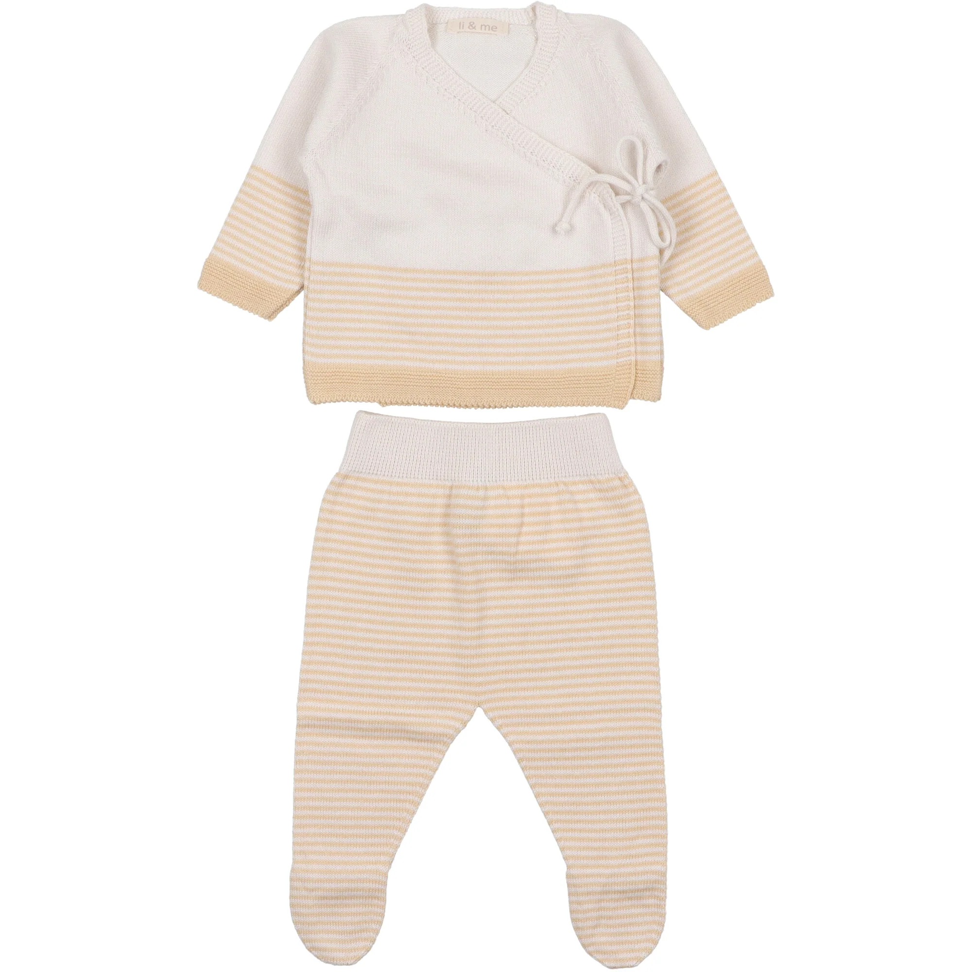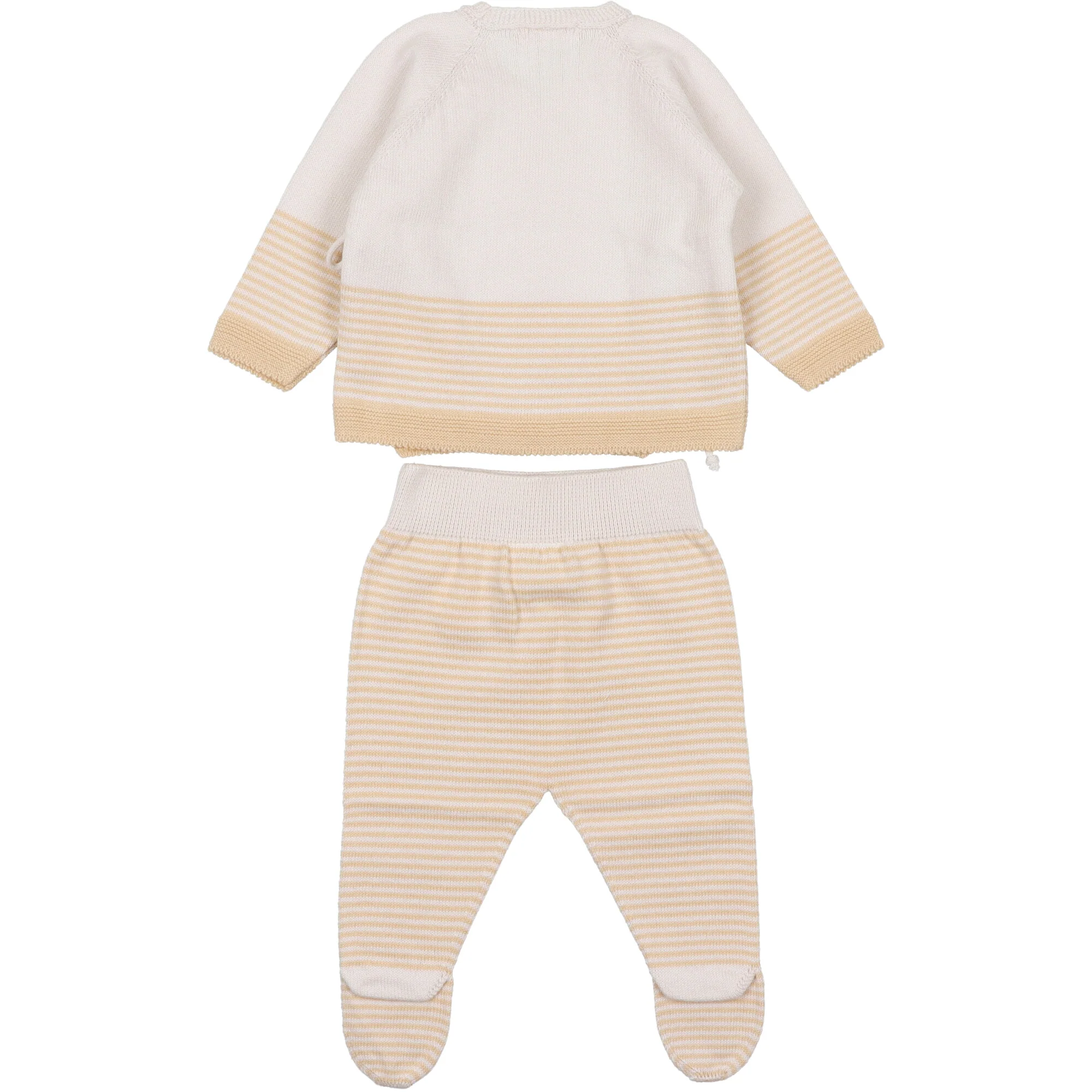 Golfino ad incrocio chiusa con fiocchetto, completa di ghettine fantasia righe con morbido elastico in vita.