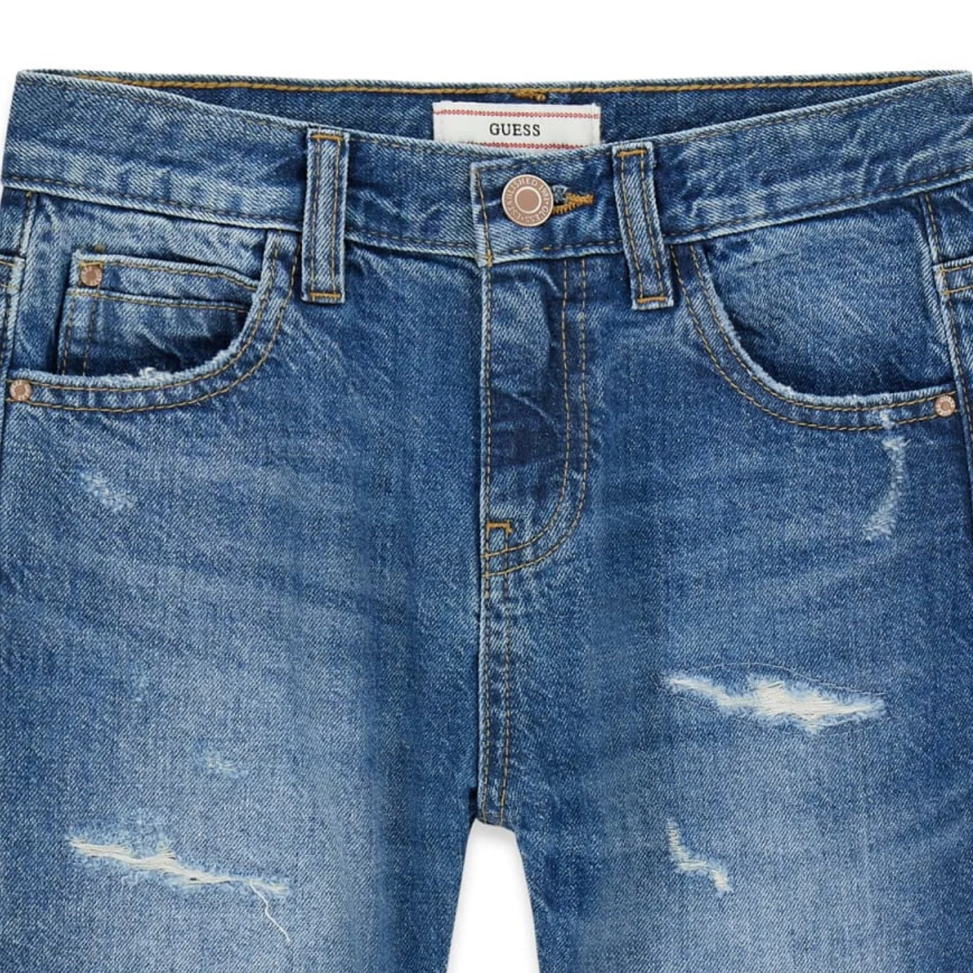 Guess bermuda teen in jeans blu Denim in cotone Cinque tasche Vita con passanti Chiusura con zip e bottone Strappi frontali Patch logo posterioreComposizione: 80% cotone 14% lino 4% elastanMade in PakistanCollezione Primavera Estate Vestibilitร :Taglia Etร