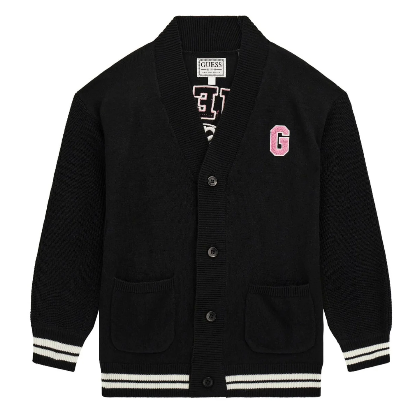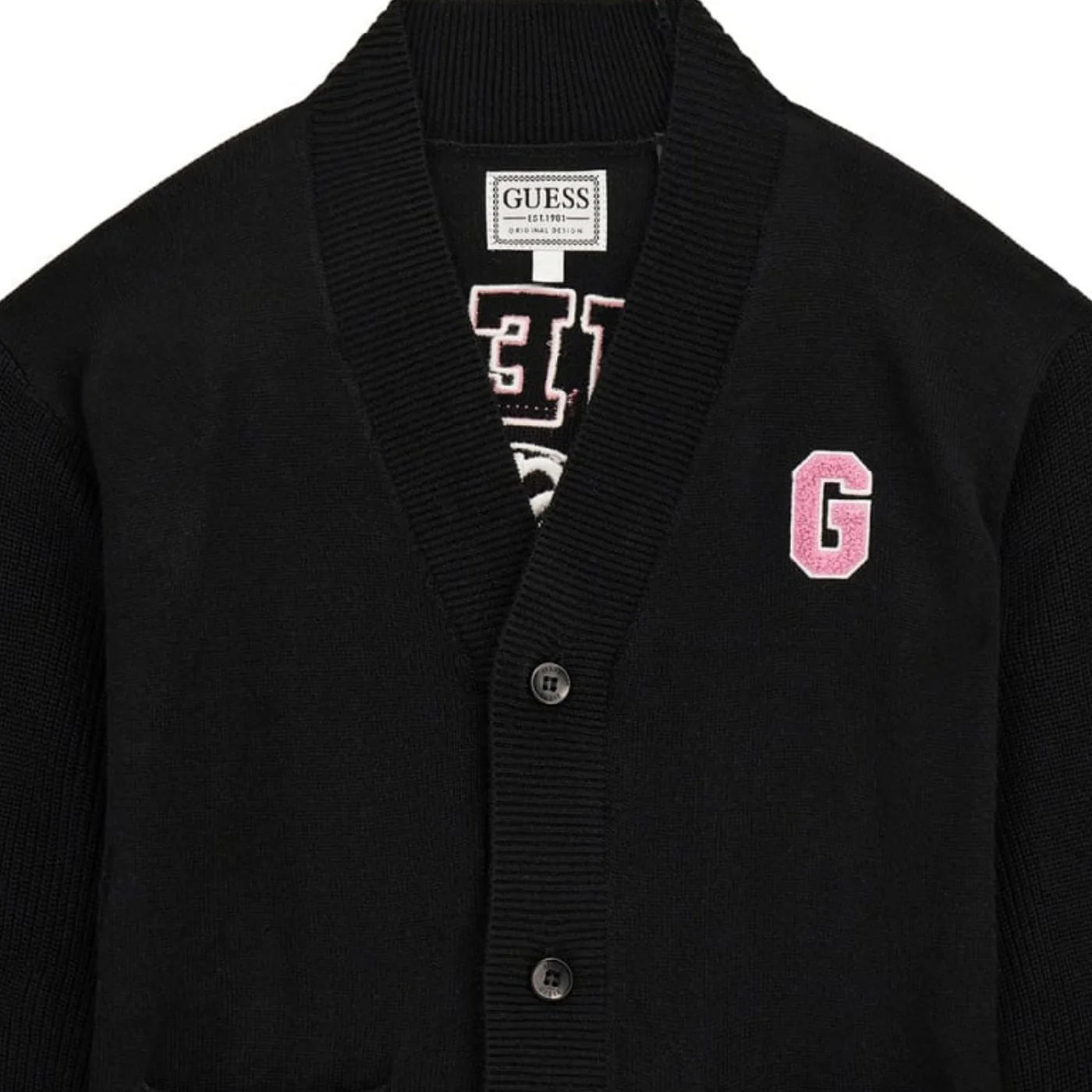 Guess cardigan bambina in misto lana nero Chiusura con bottoni Patch logo glitter lato cuore Max logo con ricami sul retro Tasche a toppa frontaliComposizione: 70% poliestere 30% lanaMade in CinaCollezione Autunno Inverno Vestibilitร :Taglia Etร