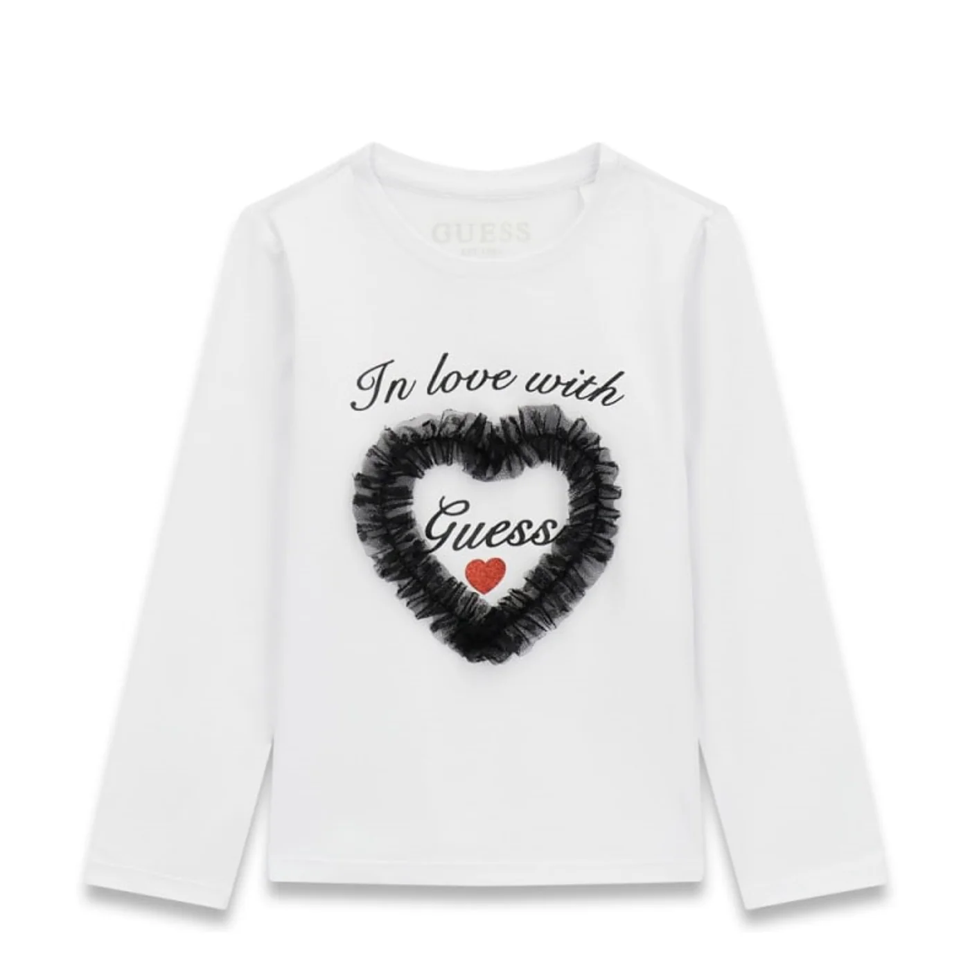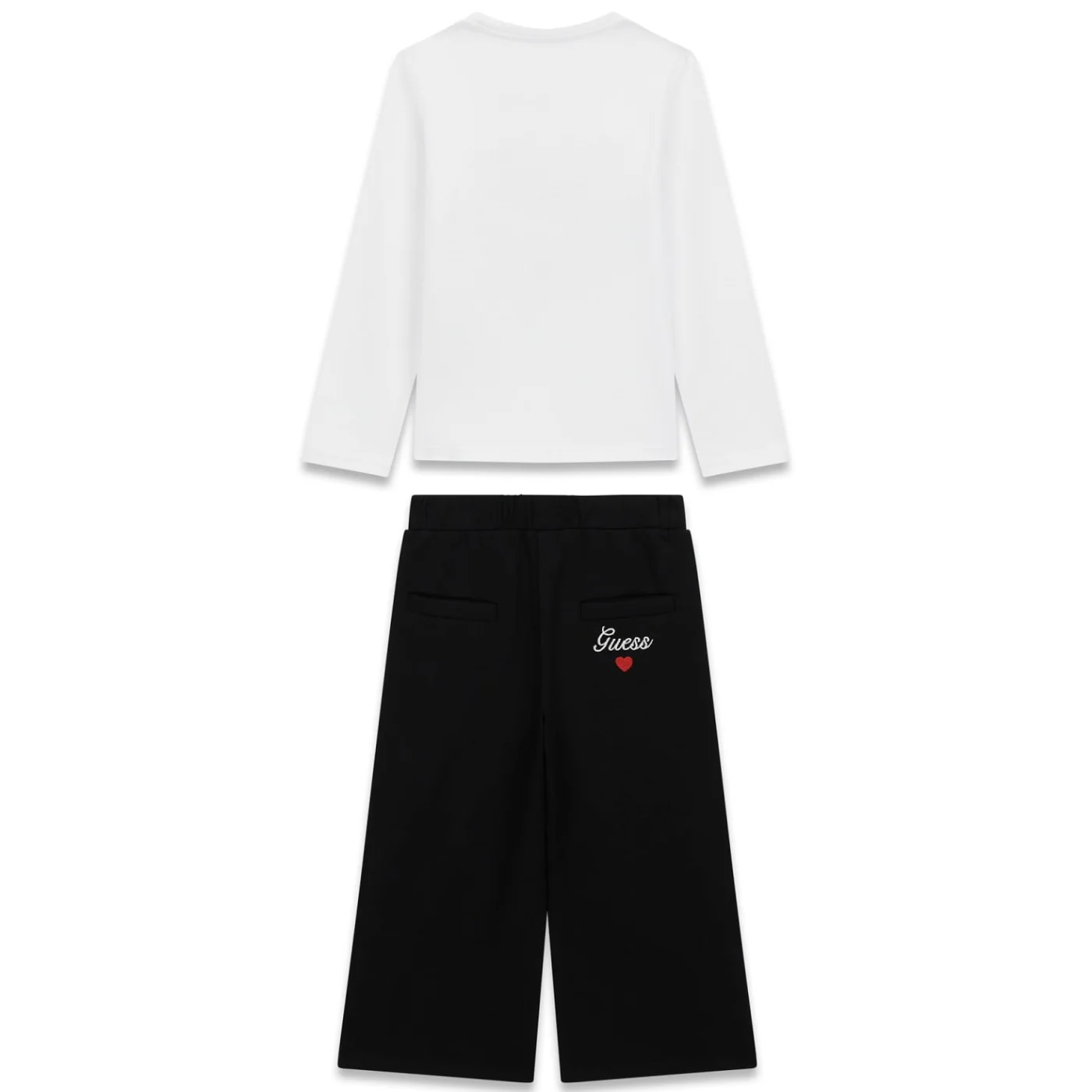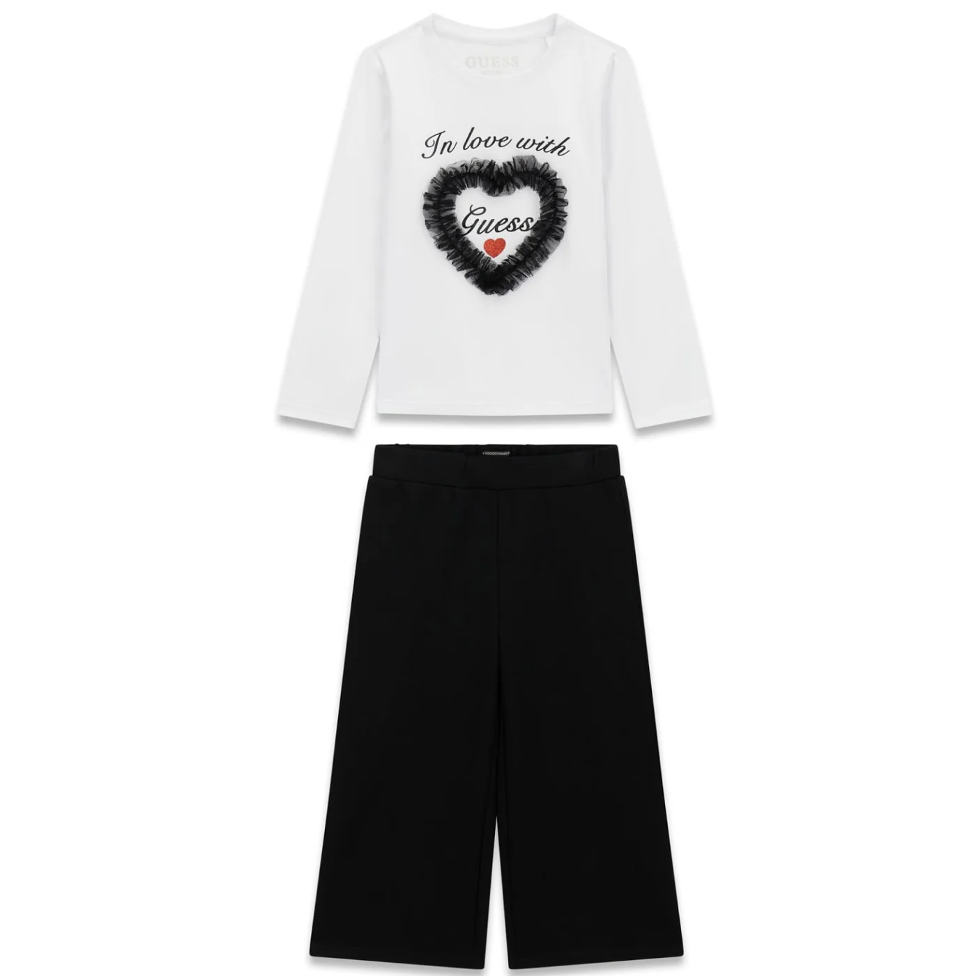 Guess completo due pezzi bambina bianco nero T-shirt girocollo Maniche lunghe Tulle e logo glitter frontale Pantalone punto milano Modello palazzo Vita elastica Tasche a toppa sul retro con ricamo logoComposizione: 95% cotone 5% elastanMade in CinaCollezione Primavera Estate Vestibilitร :Taglia Etร