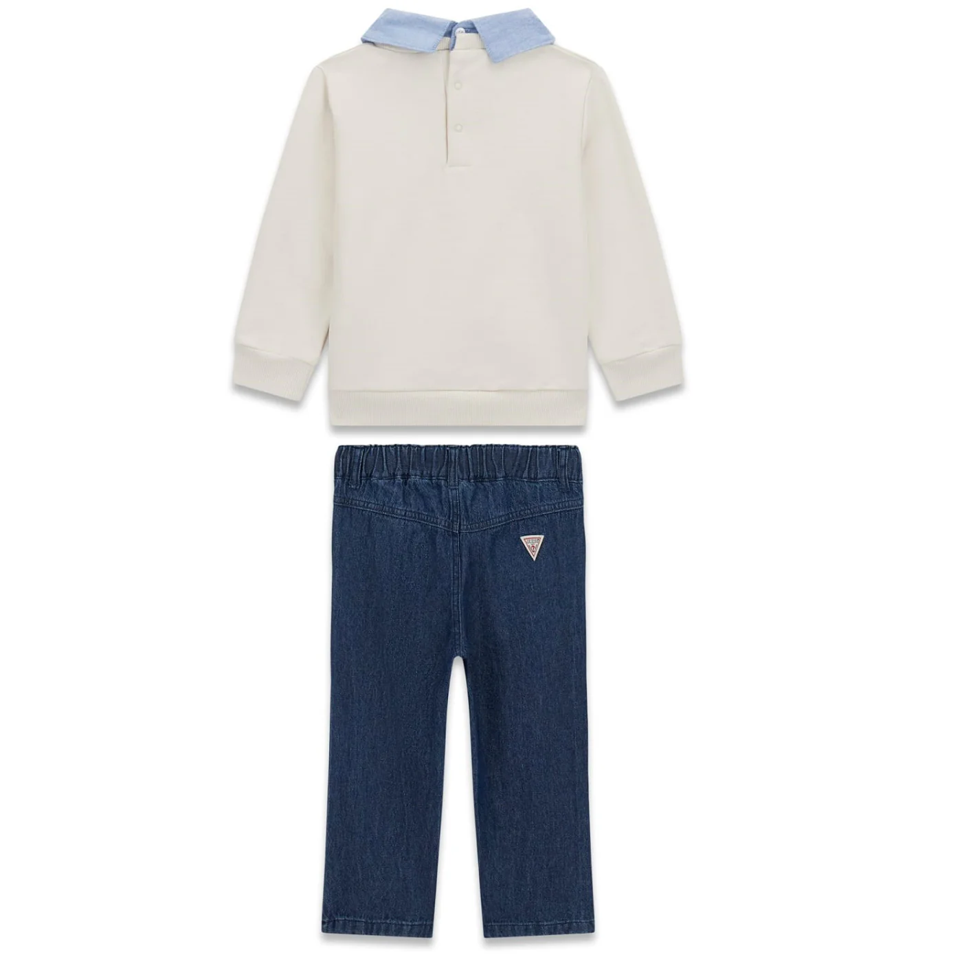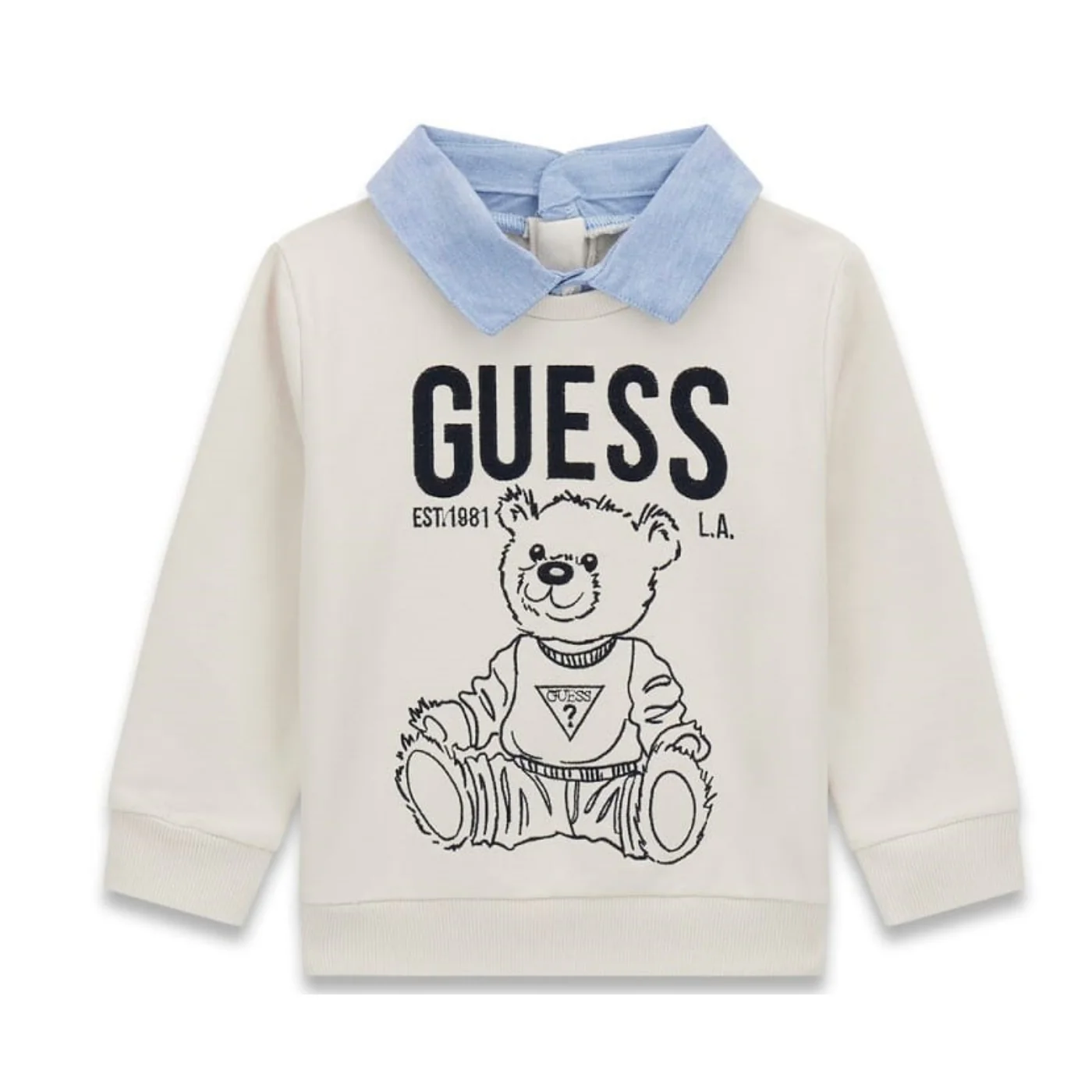 Guess completo due pezzi bambino in cotone panna blu Felpa cotone garzato Collo camicia Teddy e logo frontale Jeans vita con passanti Vhiusura zip e bottone Tasche frontali Patch logo posterioreComposizione: 100% cotone Made in Cina Collezione Primavera Estate Vestibilitร :Taglia Etร