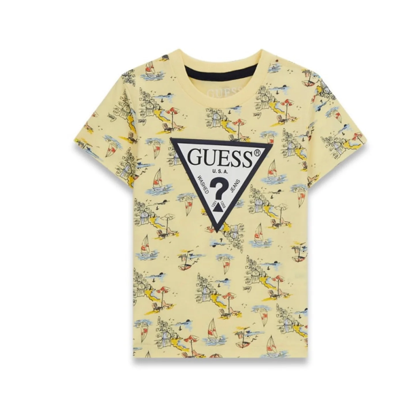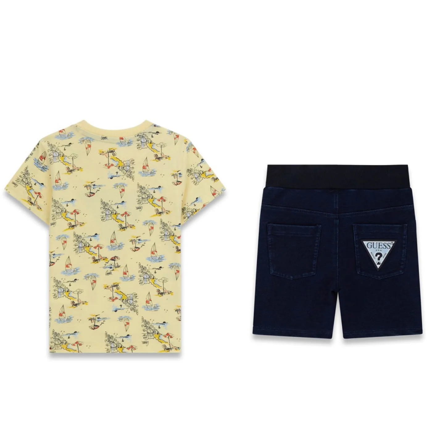 Guess completo due bambino in cotone giallo T-shirt girocollo Maniche corte Fantasia all over Logo frontale Shorts in denim di cotoneVita con passanti Chiusura con bottoneTasche frontaliTasche a toppa con patch logoComposizione: 100% cotoneMade in IndiaCollezione Primavera Estate Vestibilitร :Taglia Etร