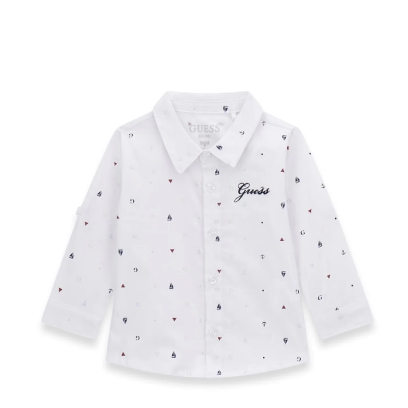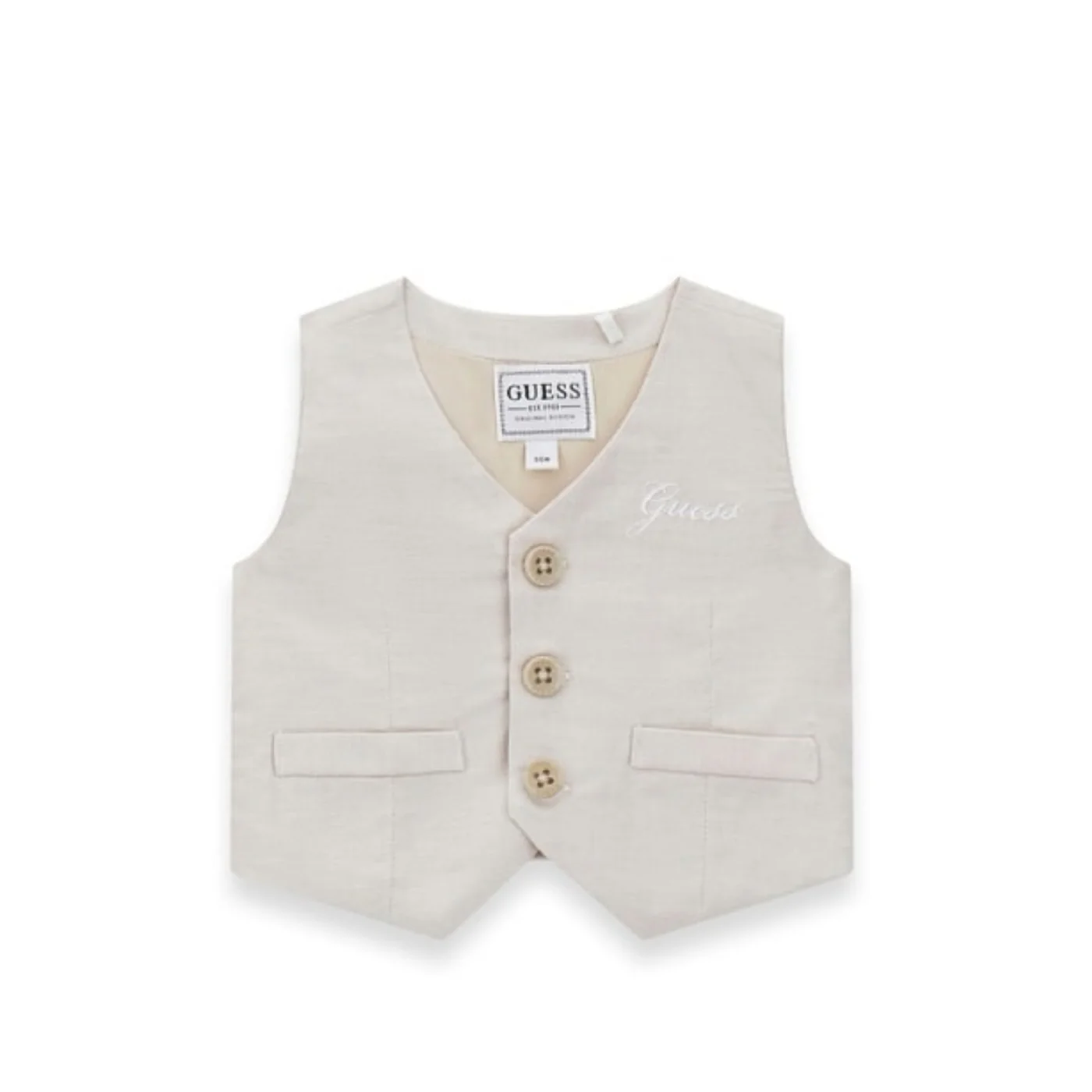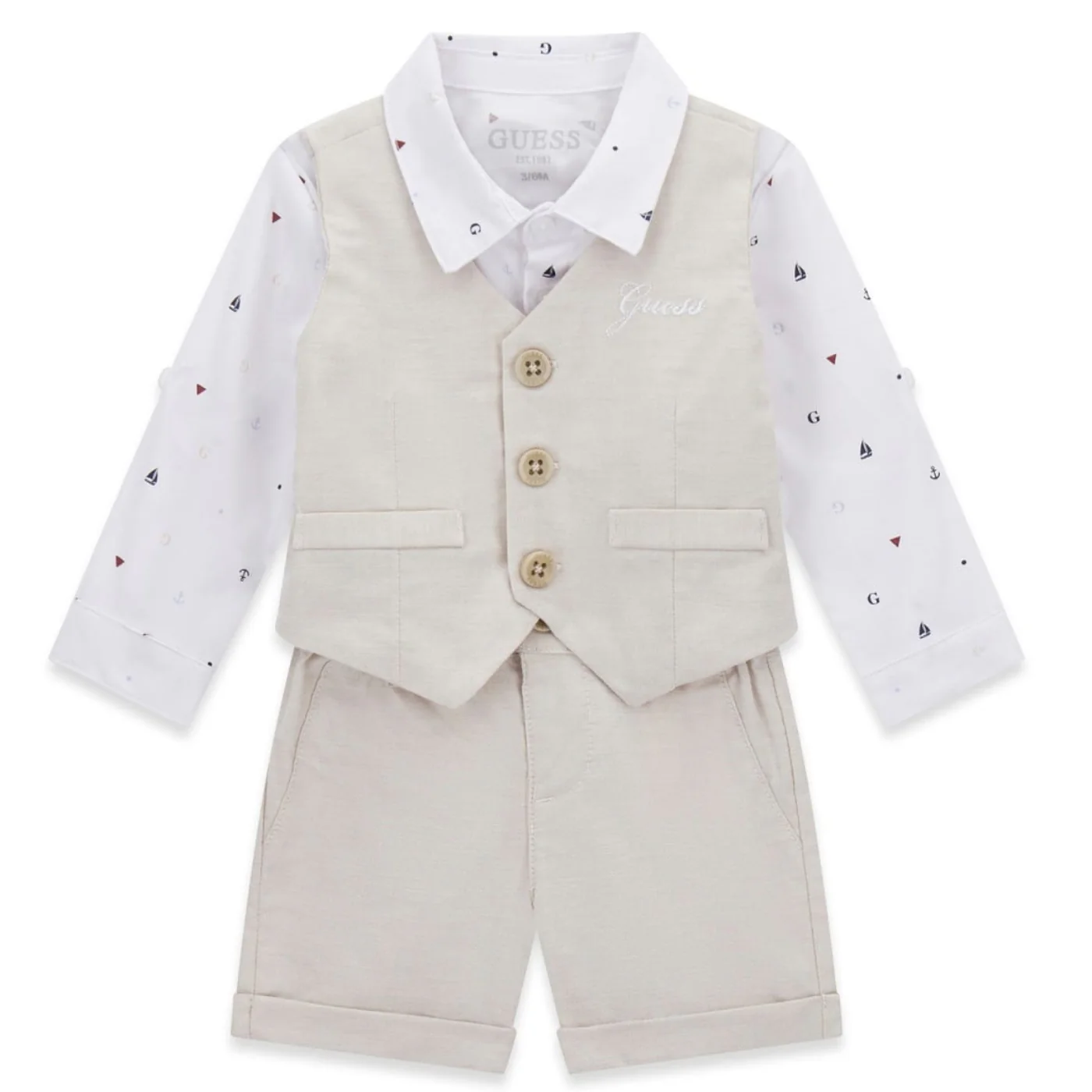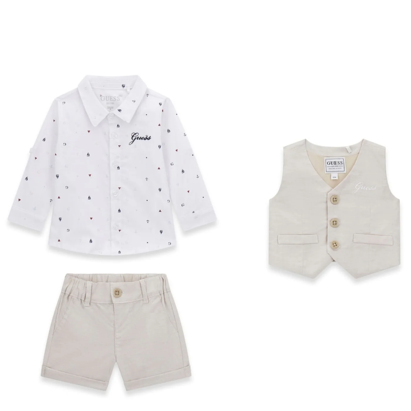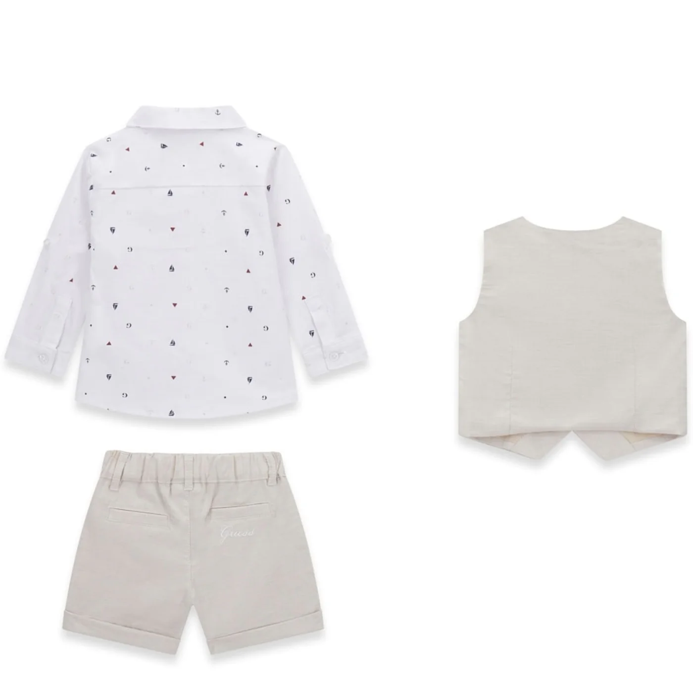 Guess completo tre pezzi cerimonia neonato in misto cotone bianco beige Camicia maniche lunghe Fantasia all over Logo lato cuore Gilet panciotto chiusura con bottoni centrale Tasche a filo Bermuda vita elastica con chiusura bottone Tasche a filo fronte retro Fondo con risavoltoComposizione: 71% cotone 27% poliestere 2% elastanMade in CinaCollezione Primavera Estate Vestibilitร :Taglia Etร