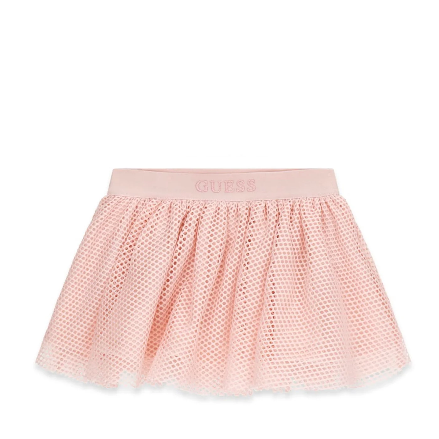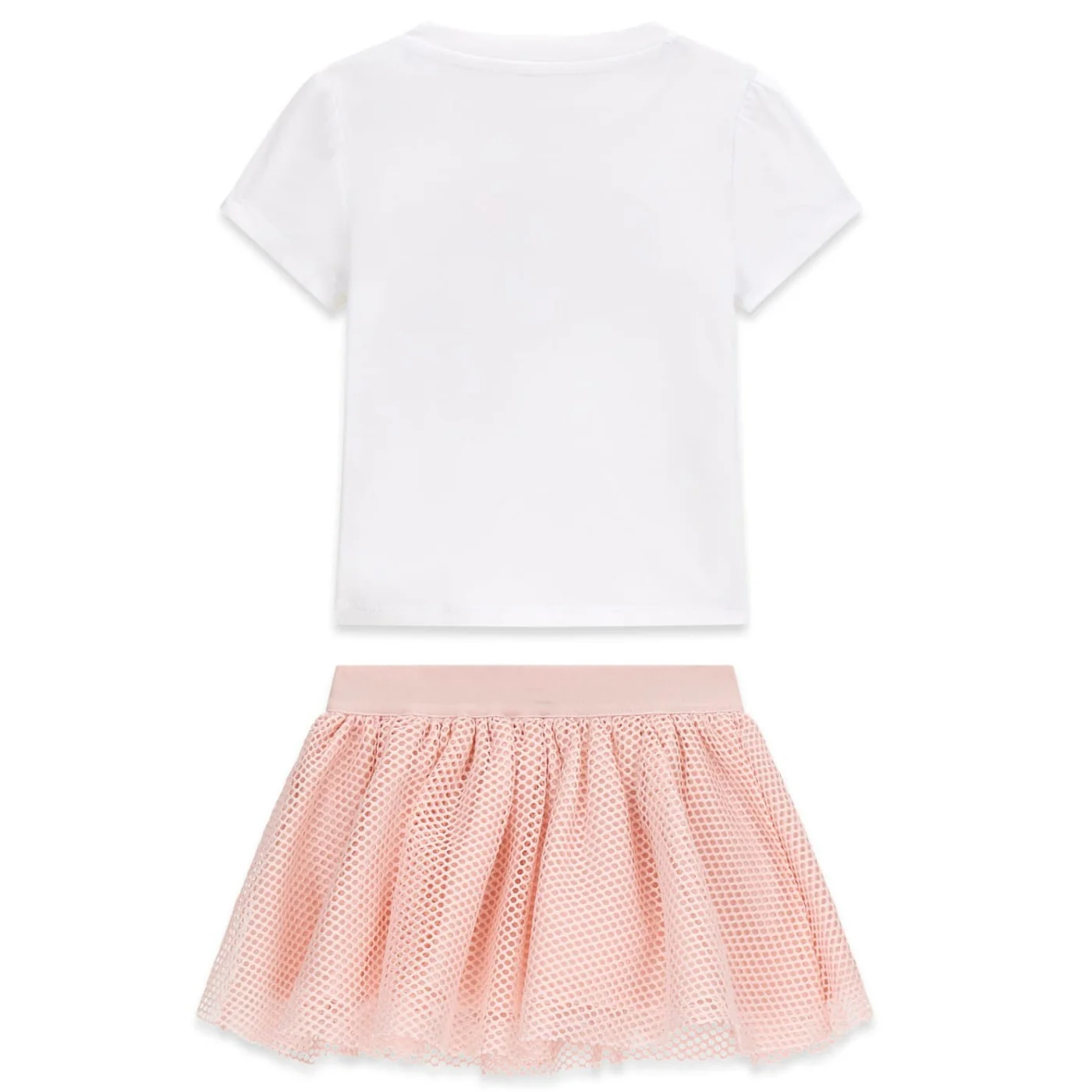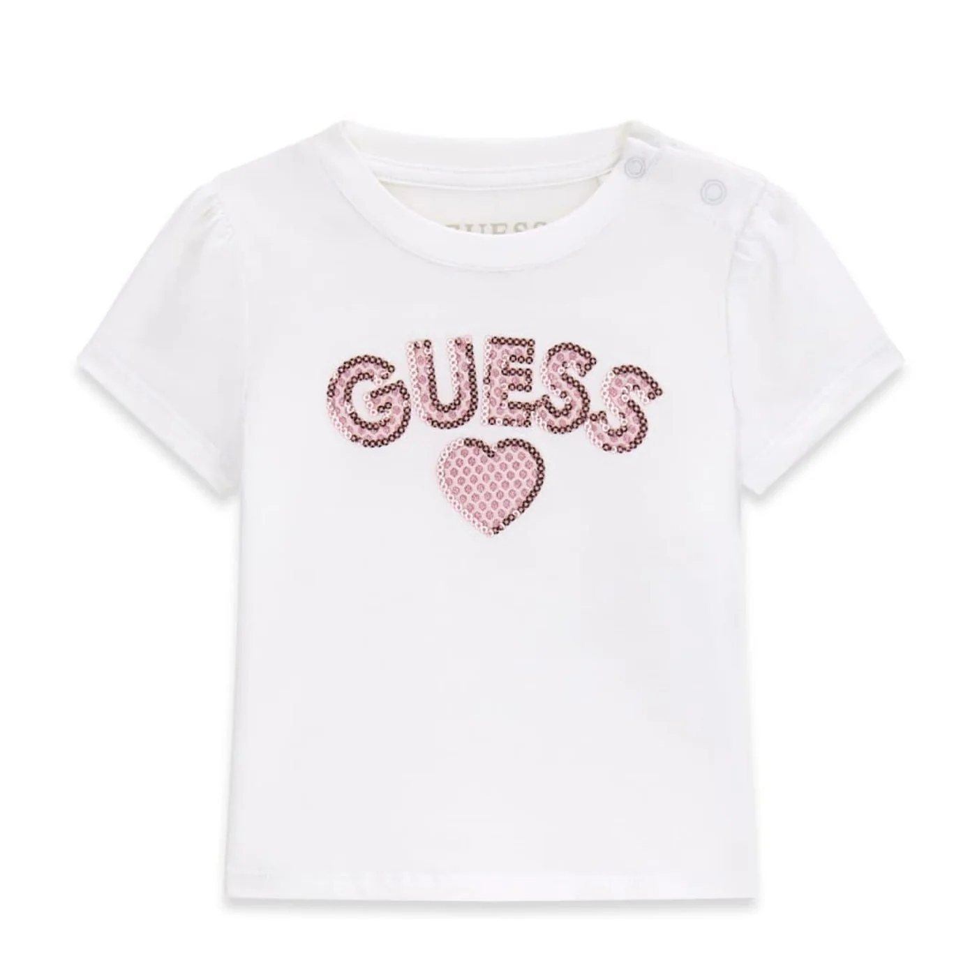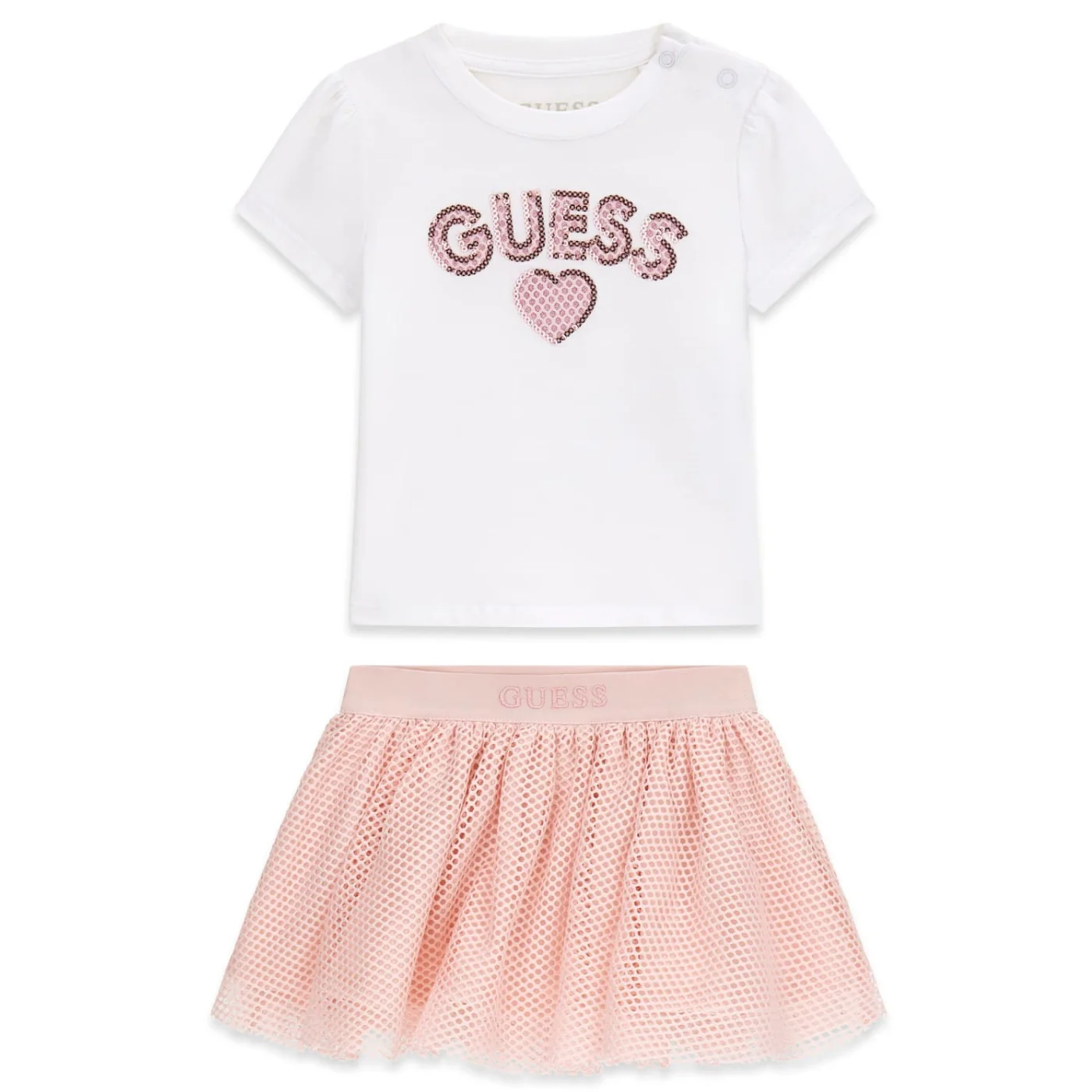 Guess completo due pezzi neonata in cotone bianco rosa T-shirt girocollo Maniche corte Logo con cuore in paillettes frontali Chiusura su spalla con bottoni a pressione Gonna con coulotteVita elastica logataComposizione: 95% cotone 5% cotoneMade in CinaCollezione Primavera Estate Vestibilitร :Taglia Etร