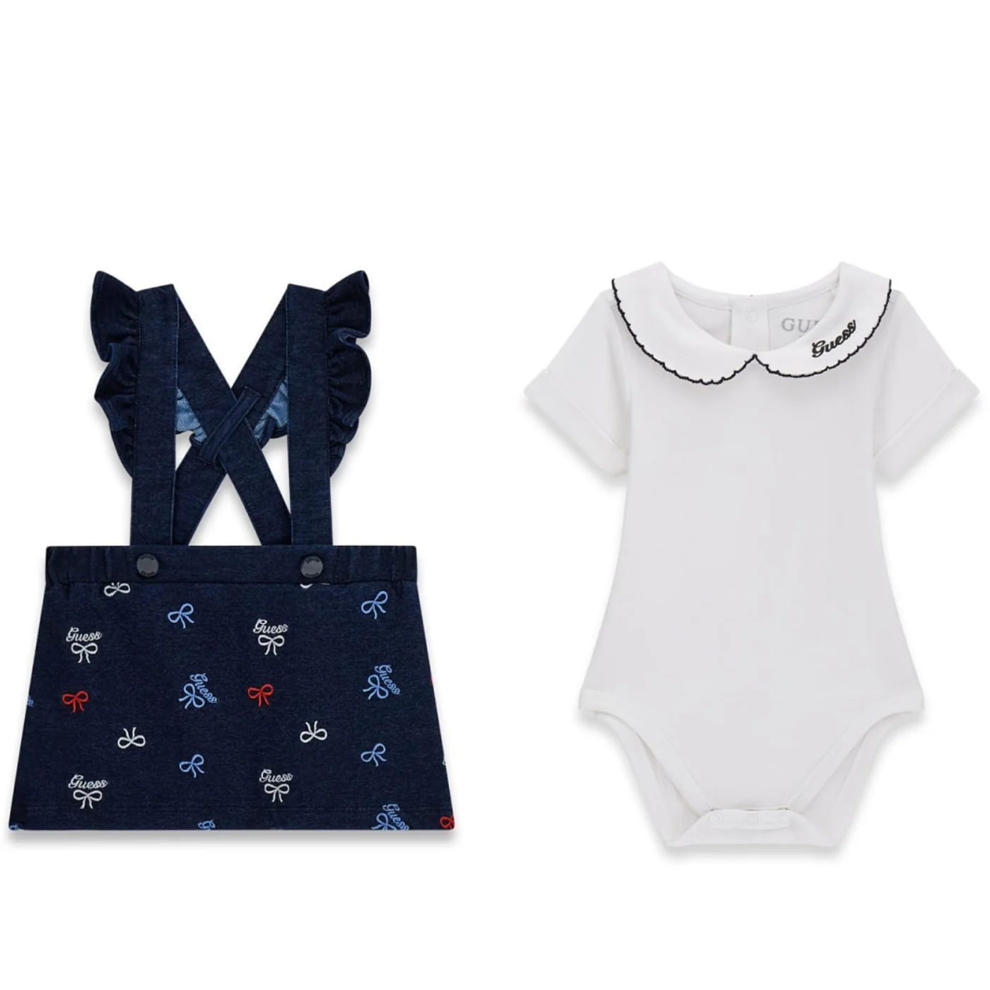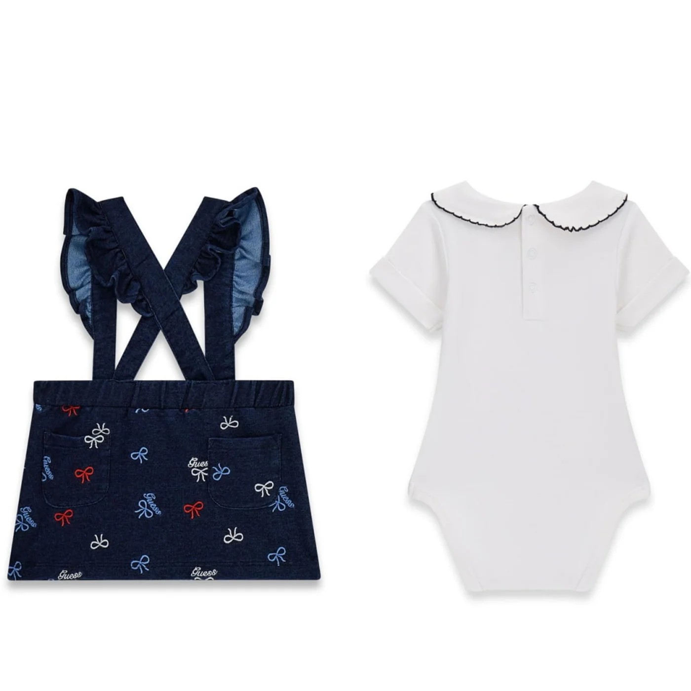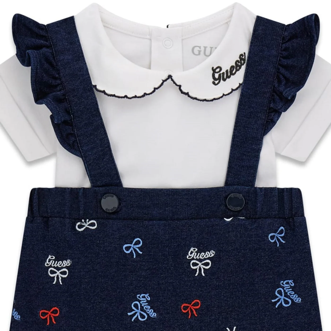Guess completo due pezzi neonata in cotone bianco denim Body maniche corte Collo peter pan con ricamo e logo Chiusura entrogamba e sul retro con bottoni a pressione Salopette ricami fiocchi e logo all over Bretelle con rouge Tasche a toppa posterioreComposizione: 95% cotone 5% elastanMade in IndiaCollezione Primavera Estate Vestibilitร :Taglia Etร