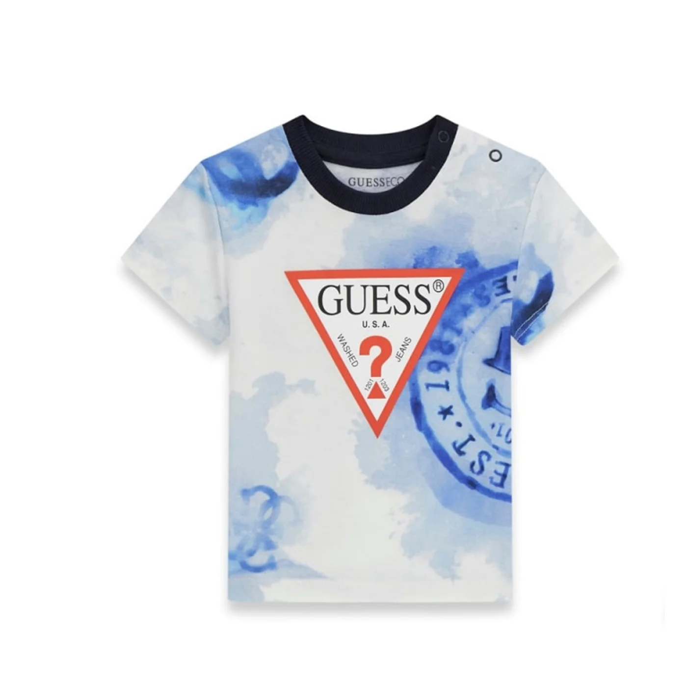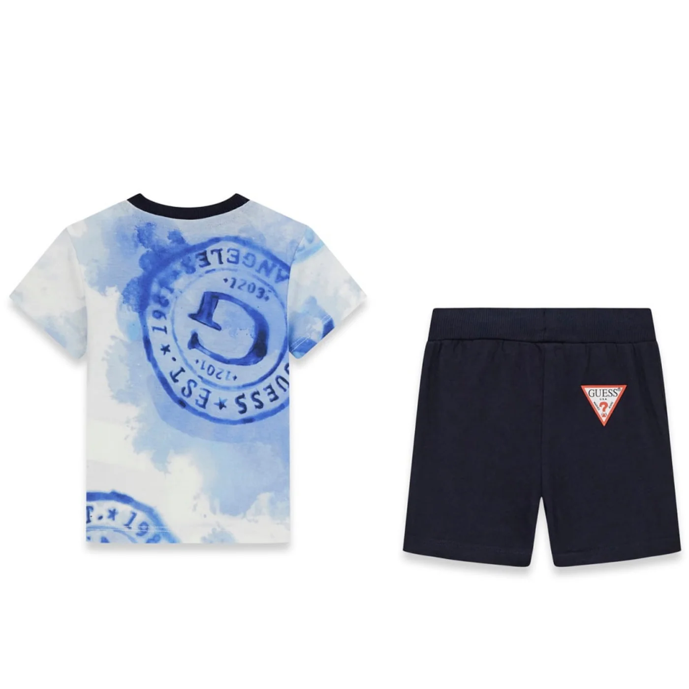 Guess completo due neonato in cotone blu T-shirt girocollo Maniche corte Fantasia all over Logo frontale Shorts in cotone garzato Vita elastica con coulisse regolabile Pacth logo posterioreComposizione: 100% cotoneMade in IndiaCollezione Primavera Estate Vestibilitร :Taglia Etร