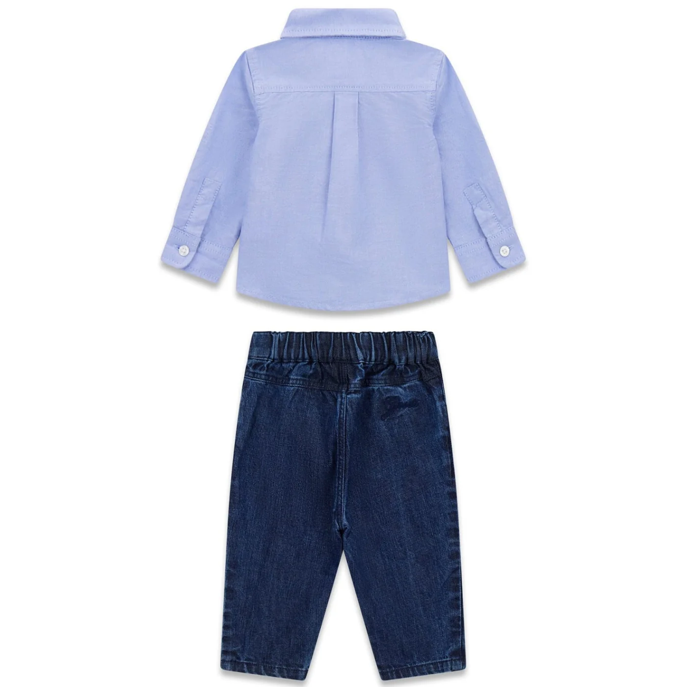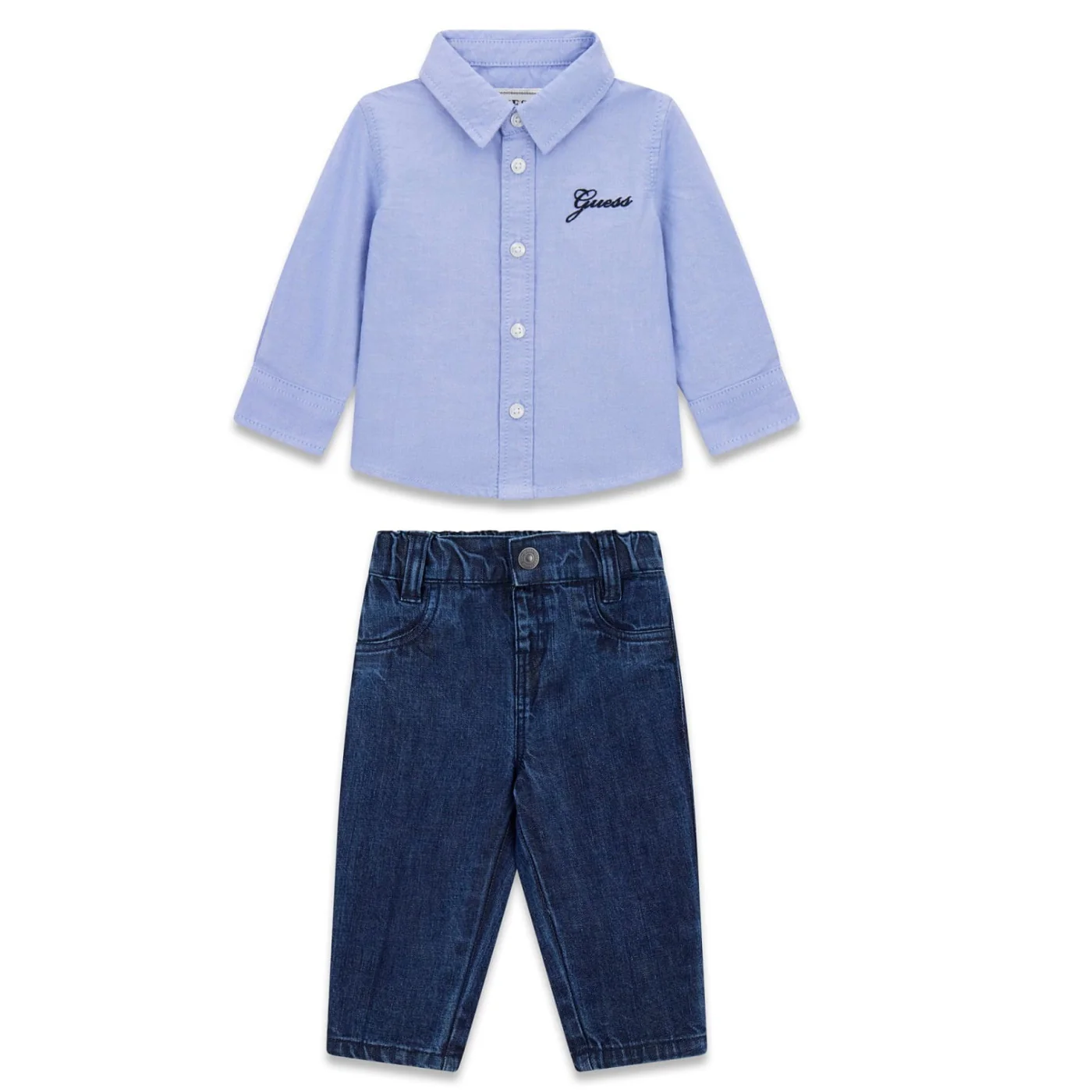 Guess completo due pezzi neonato in cotone blu denim Camicia oxford Maniche lunghe Chiusura con bottoni Ricamo logo lato cuore Jeans mom Vita elastica Chiusura con bottone Tasche america frontaliComposizione: 100% cotoneMade in IndiaCollezione Primavera Estate Vestibilitร :Taglia Etร