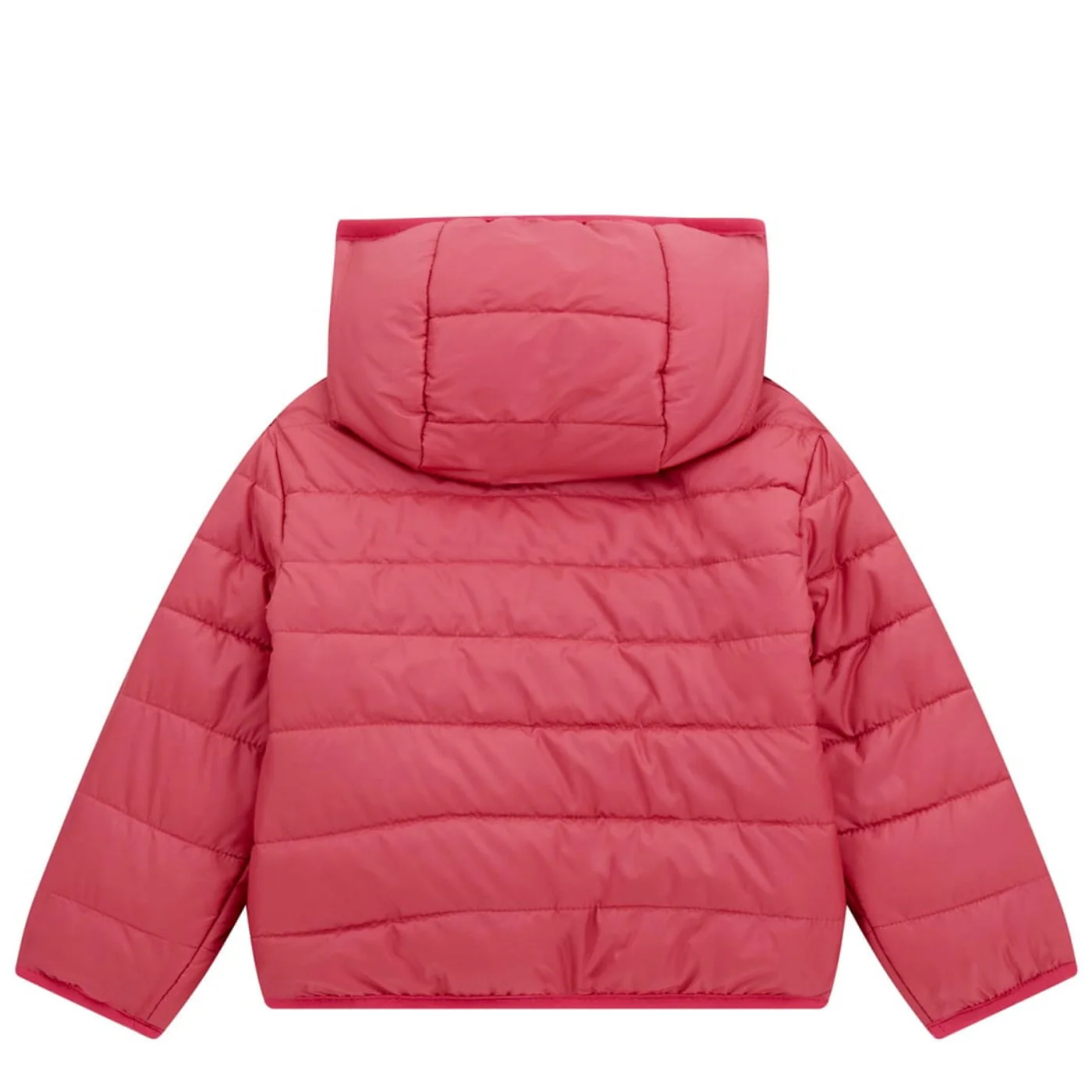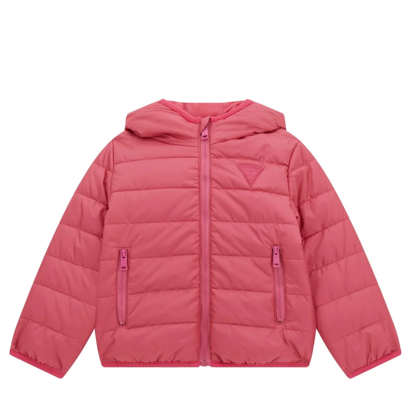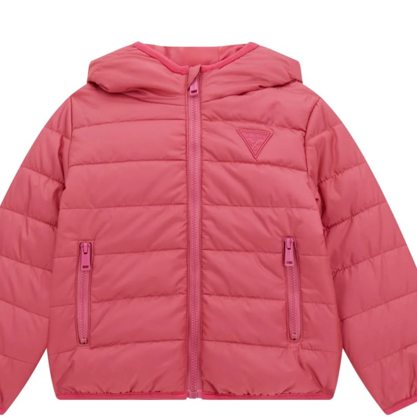 Guess giubbino 100gr con cappuccio baby rosaCappuccio non removibileChiusura frontale con cerniera lampoTasche frontali con zipComposizione: 100% poliestereMade in CinaCollezione Continuativa Vestibilitร :Taglia Etร