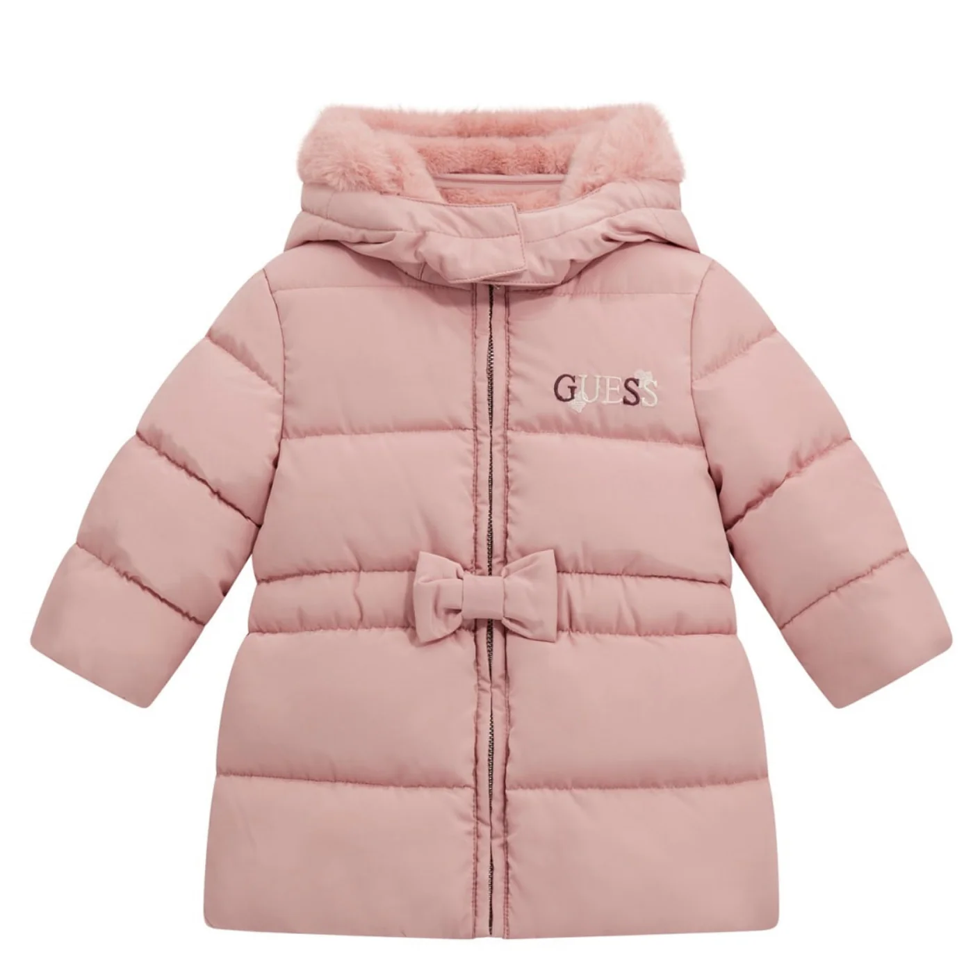 Guess giubbino lungo trapuntato neonata interno in pelliccia rosa Modello lungo Cappuccio con interno e bordi in pelliccia rimovibile Chiusura con zip centrale Fiocco frontale Ricamo logo lato cuore Composizione: 100% poliestere Made in Cina Collezione Autunno Inverno Vestibilitร :Taglia Etร