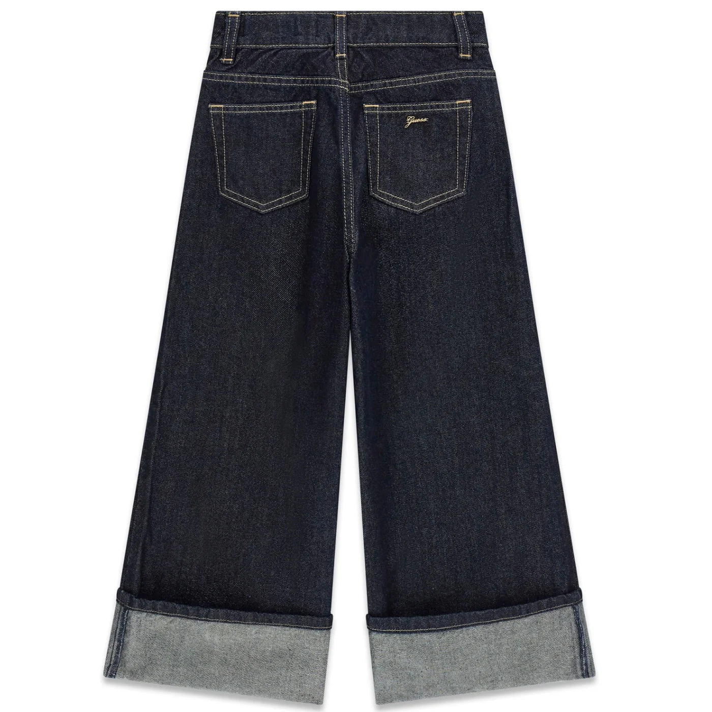Guess jeans bambina in lurex blu Modello palazzo Vita alta con passanti Cinque tasche Chiusura con zip e bottone Logo in metallo sul retroComposizione: 85% cotone 11% viscosa 4% fibra metallicaMade in IndiaCollezione Primavera Estate Vestibilitร :Taglia Etร