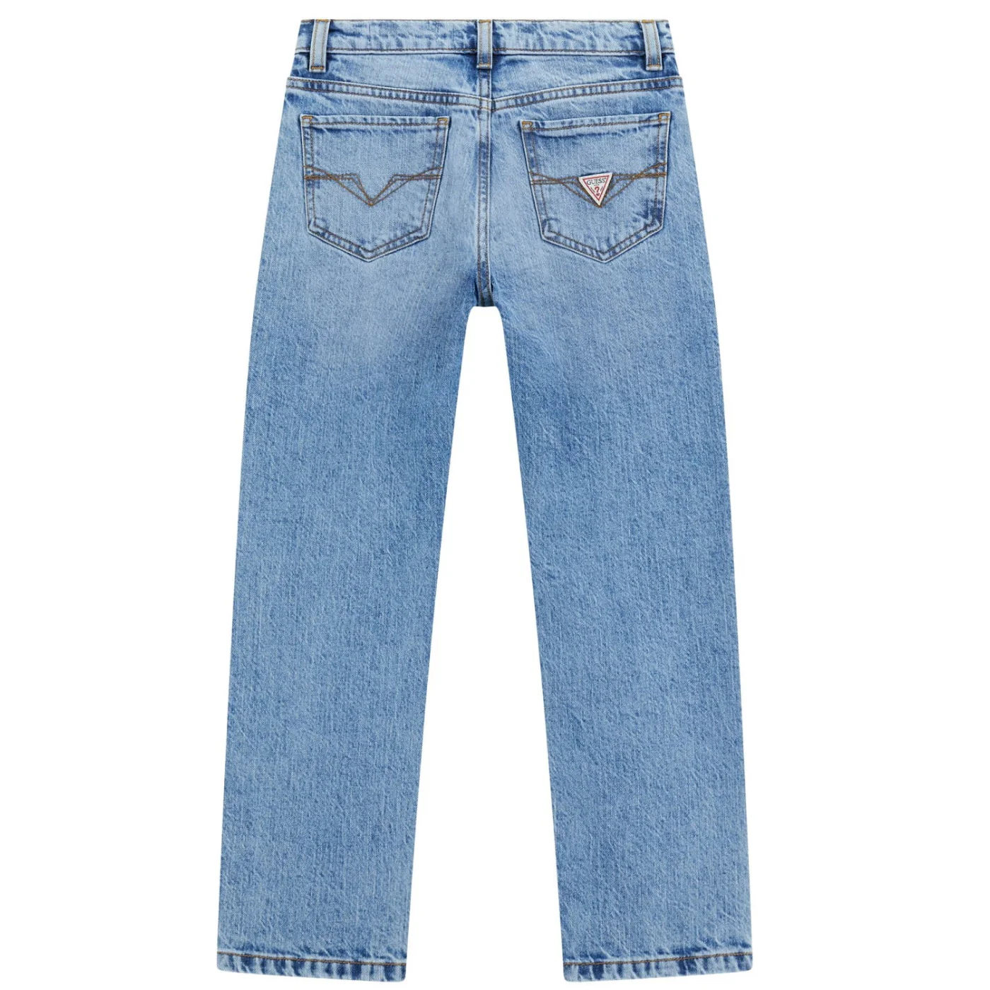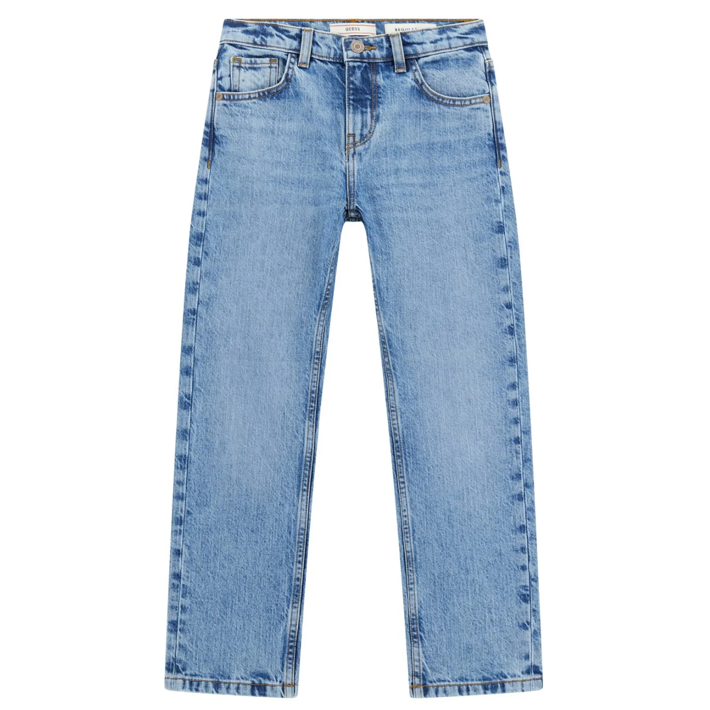Guess jeans regular teen blu Denim in cotone Cinque tasche Vita con passanti Chiusura con zip e bottone Logo su tasca posterioreComposizione: 99% cotone 1% elastanMade in PakistanCollezione Continuativa Vestibilitร :Taglia Etร