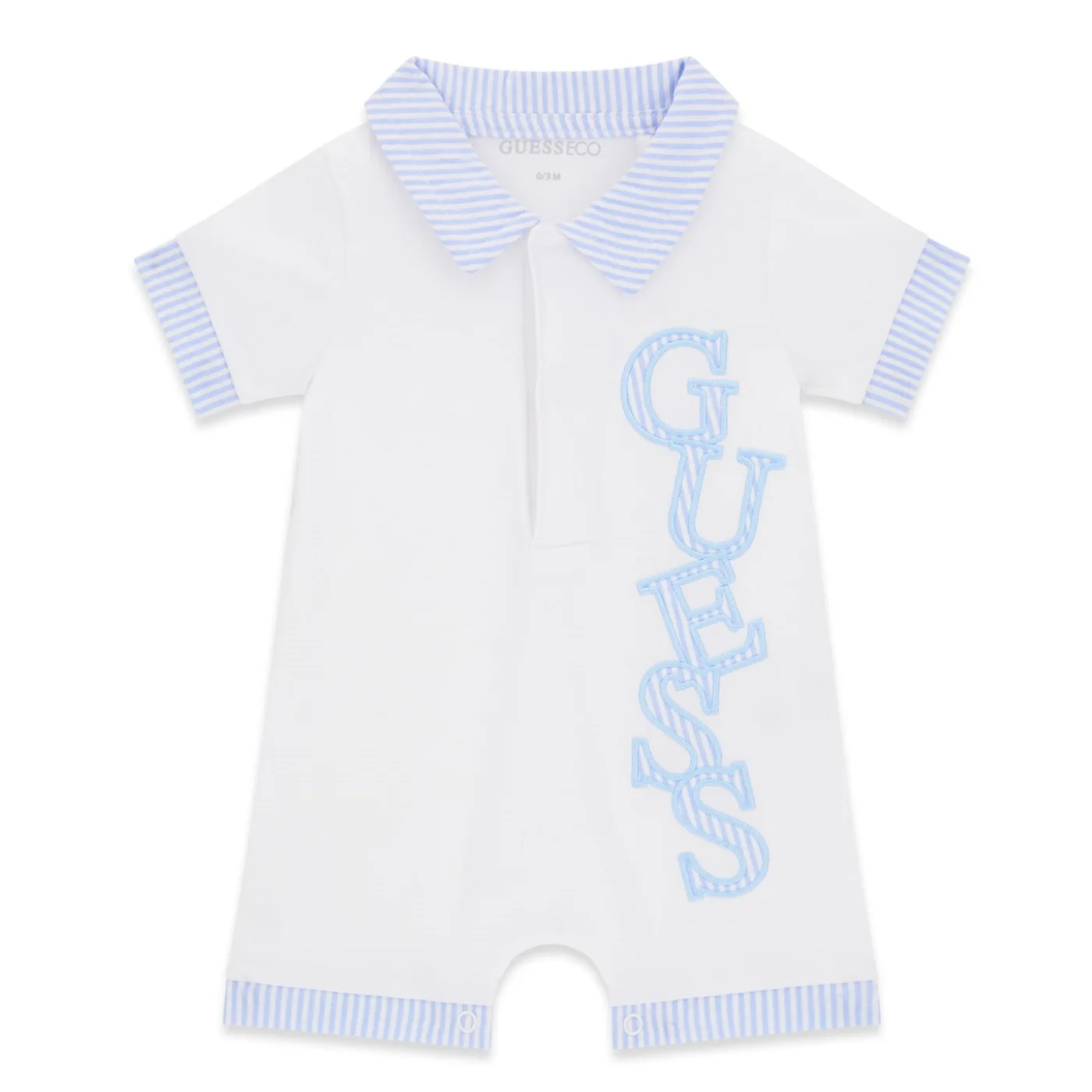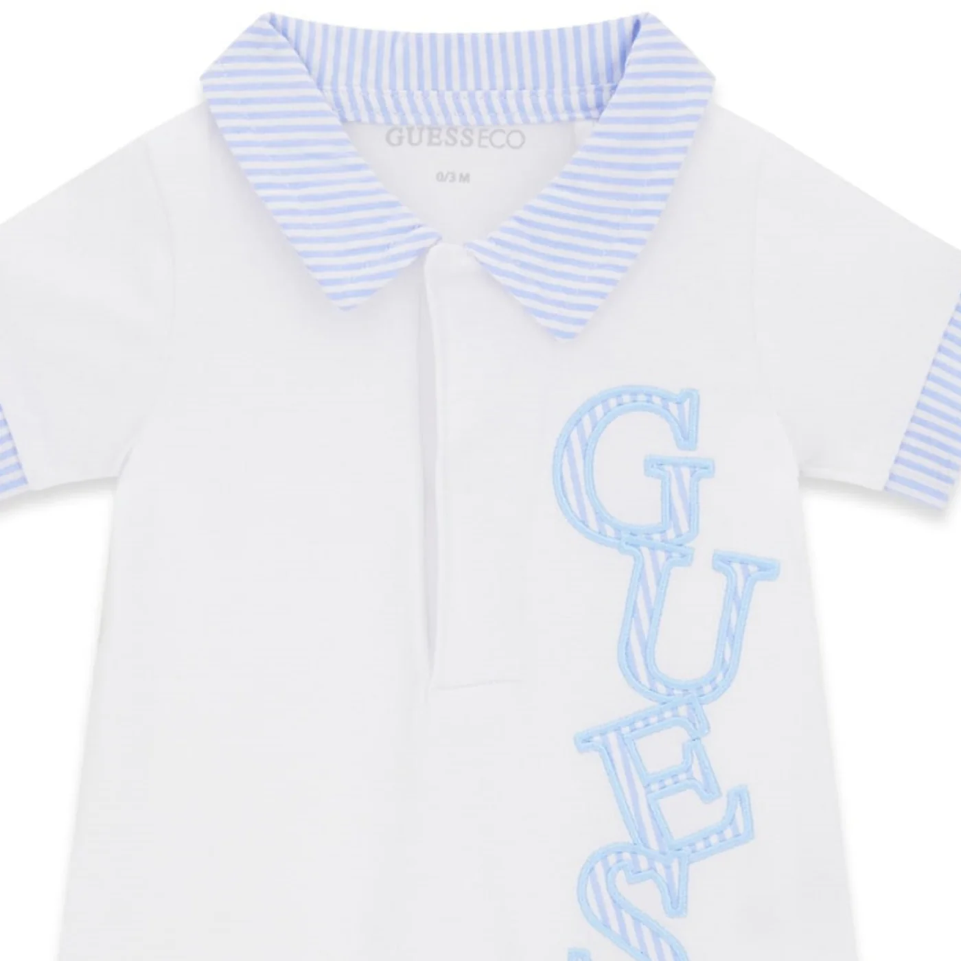 Guess pagliaccetto neonato in cotone bianco celeste Collo camicia a righe Chiusura con bottoni a pressione nascosti da patta Ricamo logo a righe frontale Chiusura entrogamba con bottoni a pressione Bordi a righeComposizione: 95% cotone 5% elastanMade in IndiaCollezione Primavera Estate Vestibilitร :Taglia Etร