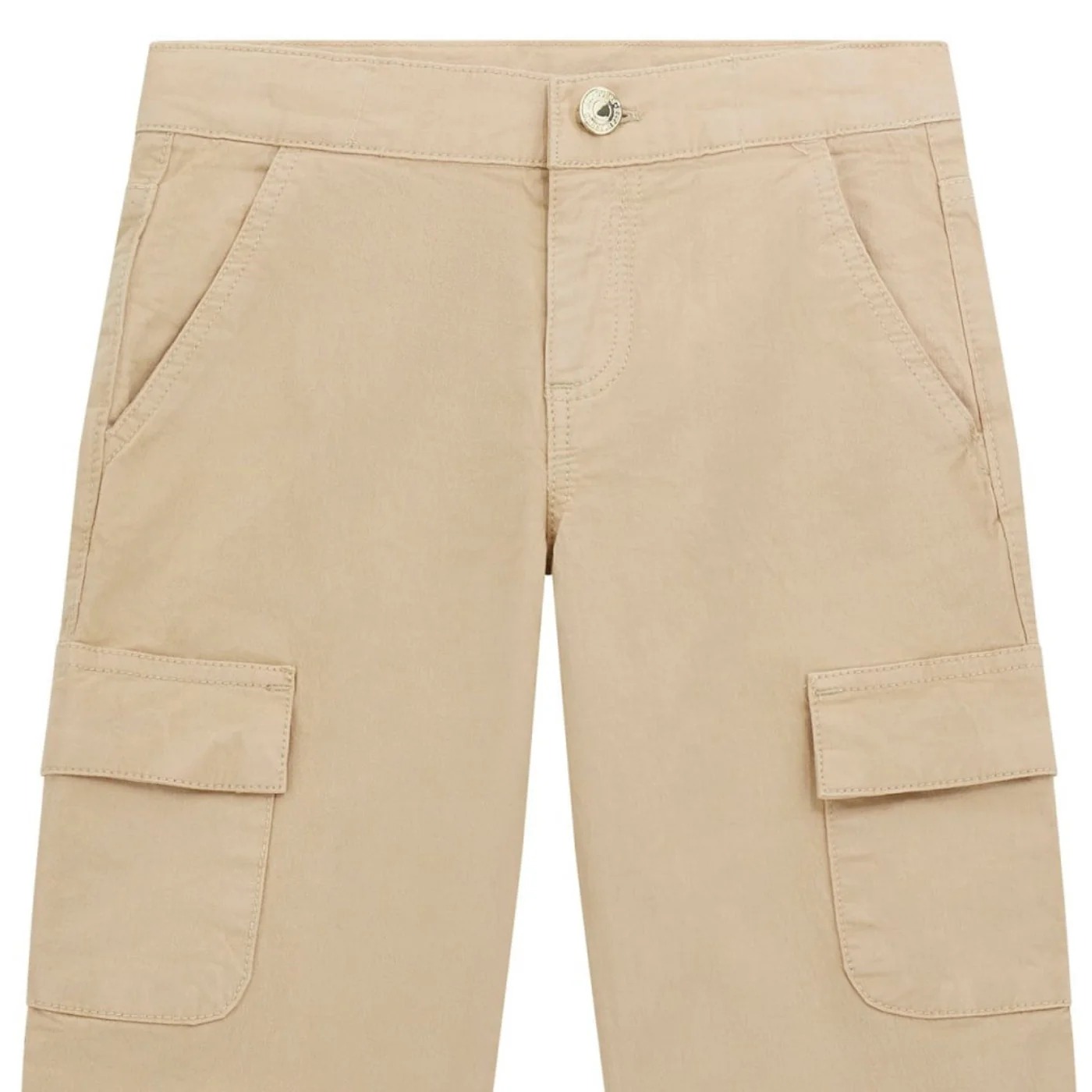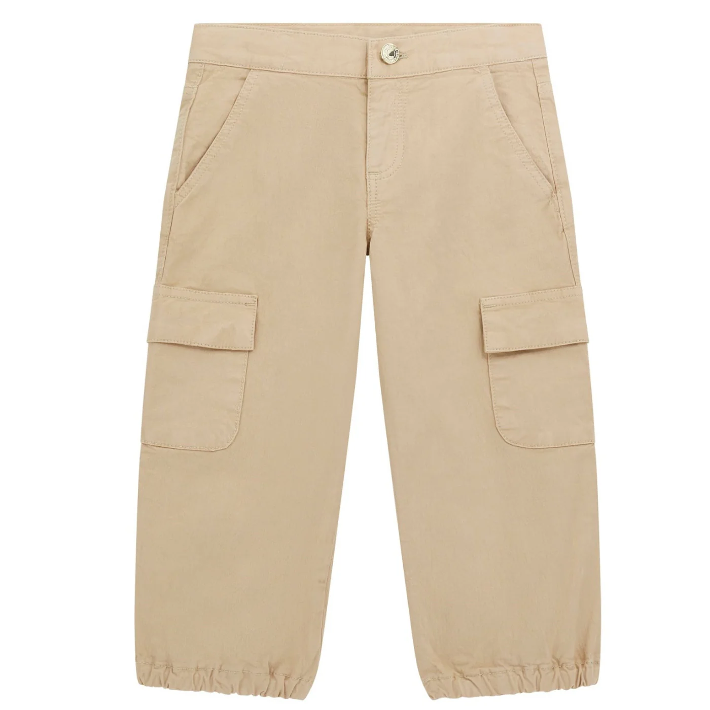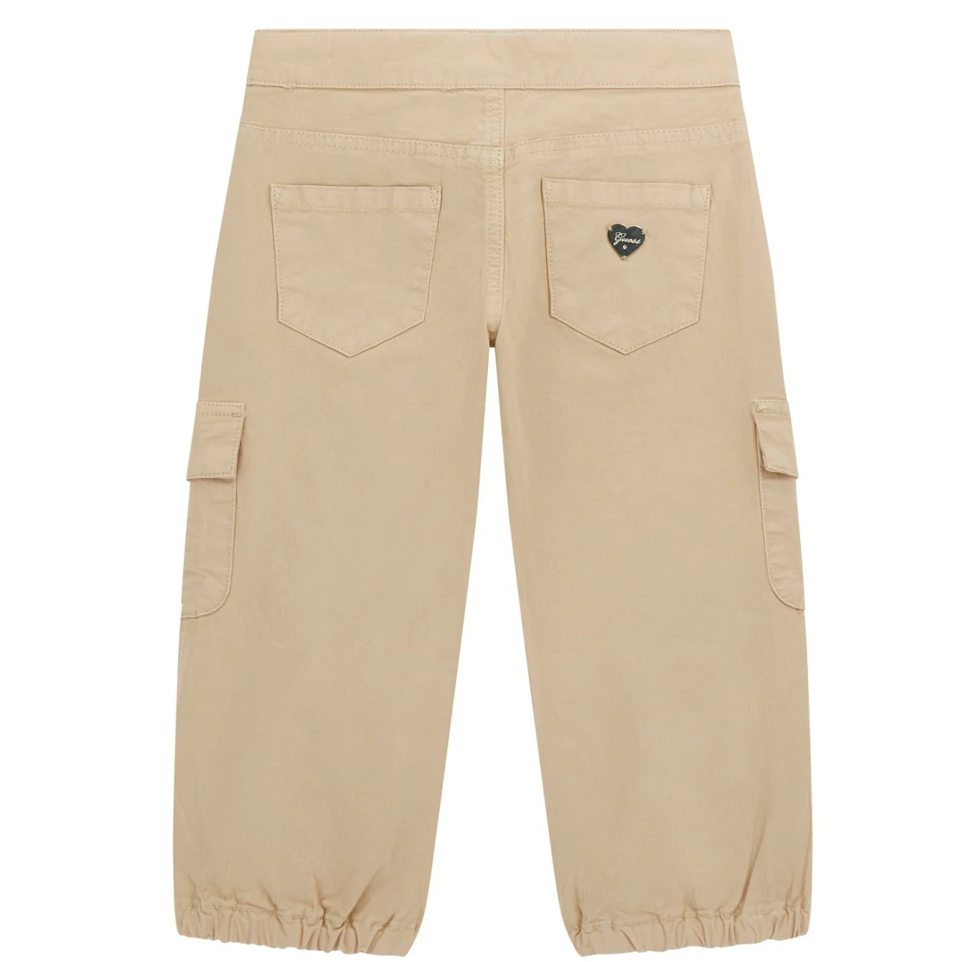 Guess pantalone cargo bambina in cotone beige Chiusura con bottone logato e zip Tasche america Tasconi lateraliFondo elasticoComposizione: 98% cotone 2% elastanMade in IndiaCollezione Primavera Estate Vestibilitร :Taglia Etร