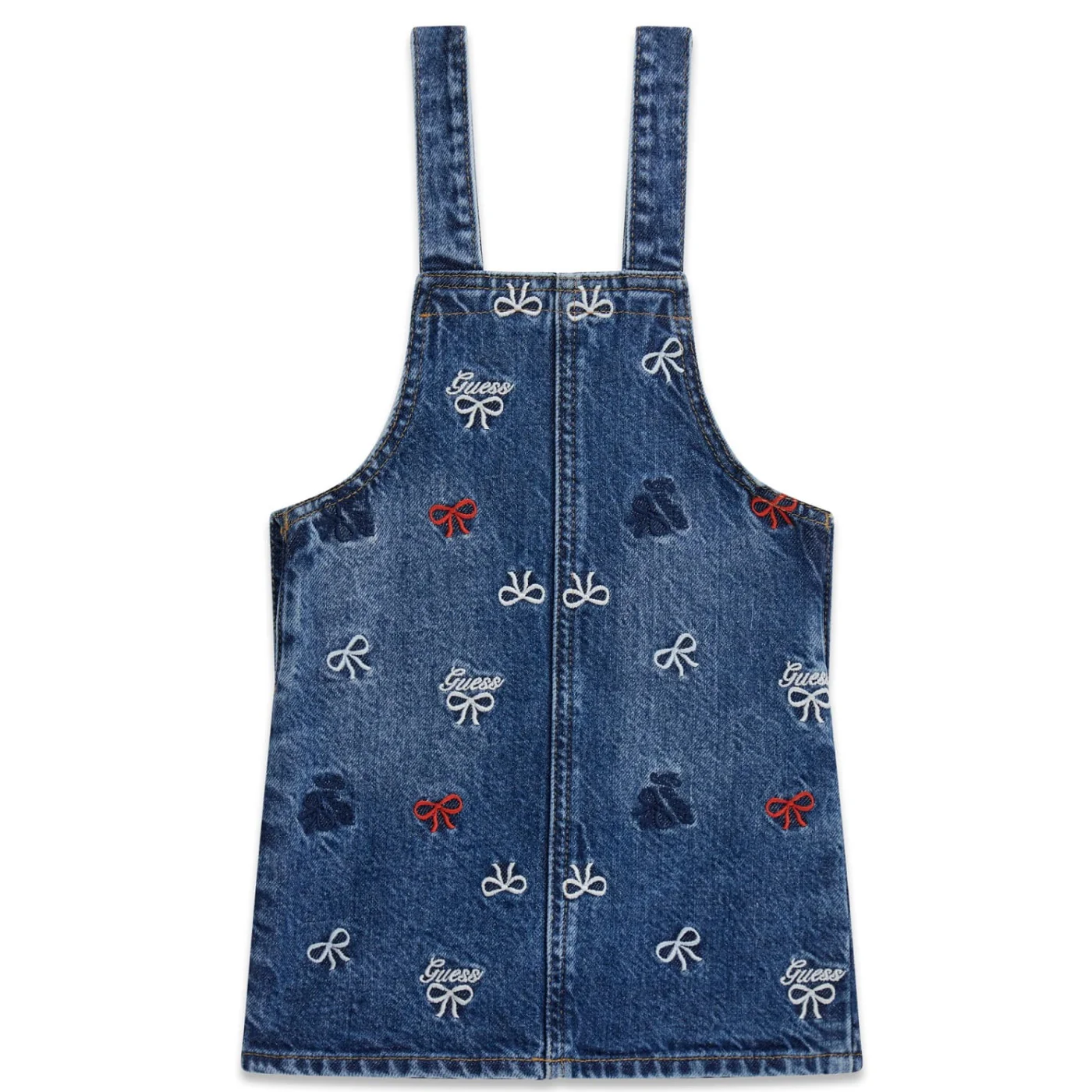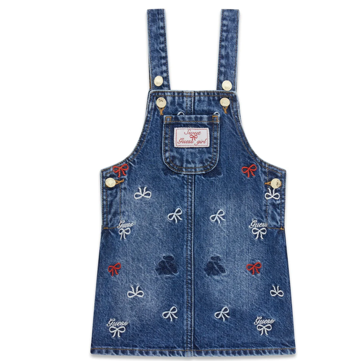 Guess salopette bambina in jeans blu Denim in cotoneBretelle regolabili Ricamo logo e fiocchetti all over Tasca a patta frontale con logoComposizione: 10% cotoneMade in PakistanCollezione Priumavera Estate Vestibilitร :Taglia Etร