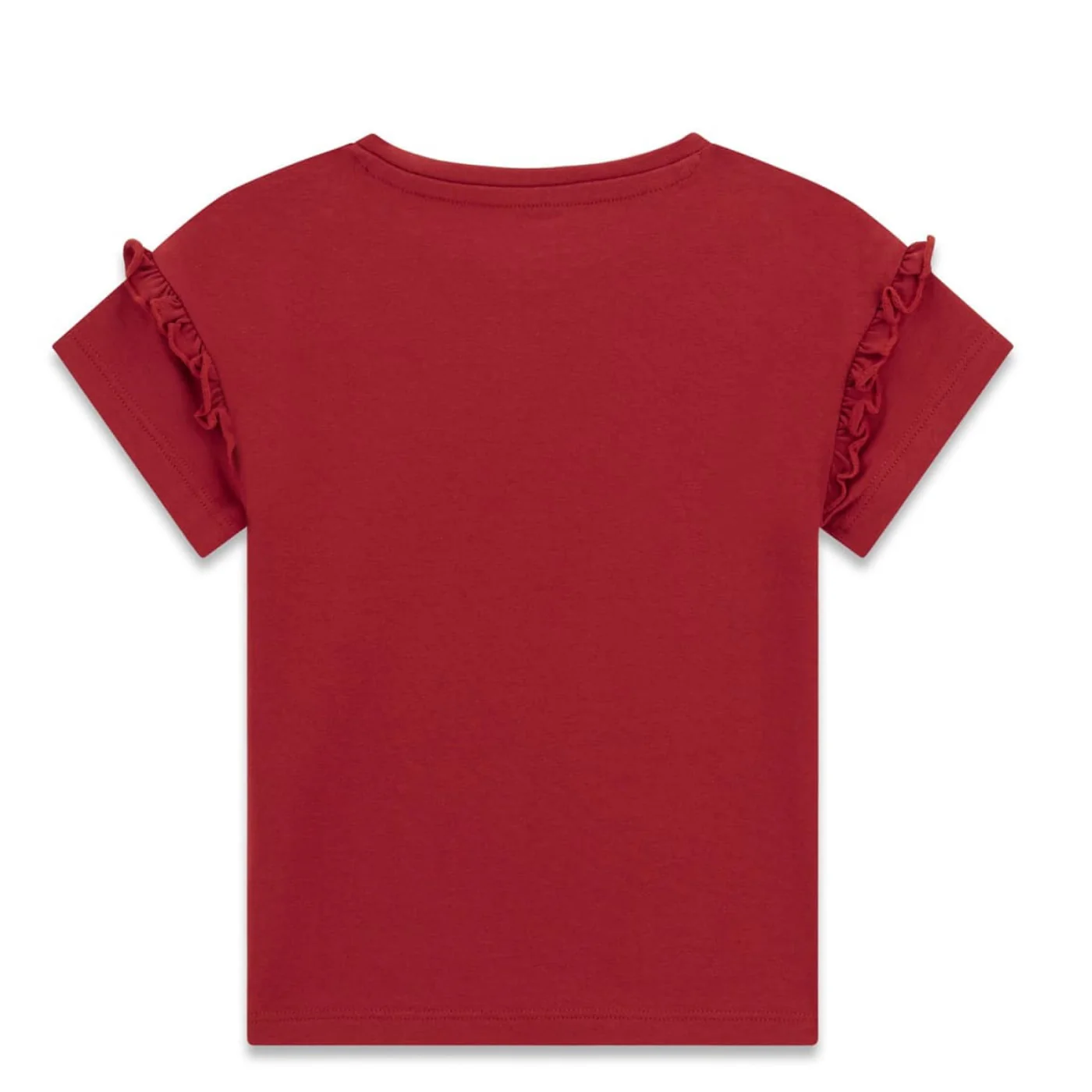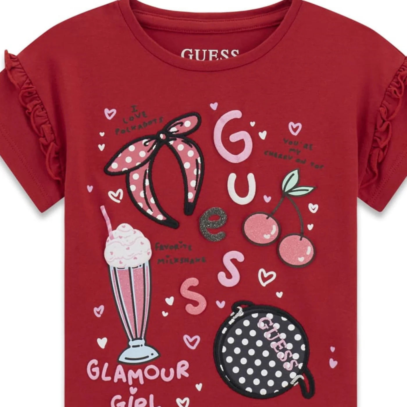 Guess t-shirt girocollo bambina in cotone rossa Maniche corte con riccio Stampe gommate con logo frontaliComposizione: 95% cotone 5% elastanMade in IndiaCollezione Primavera Estate Vestibilitร :Taglia Etร