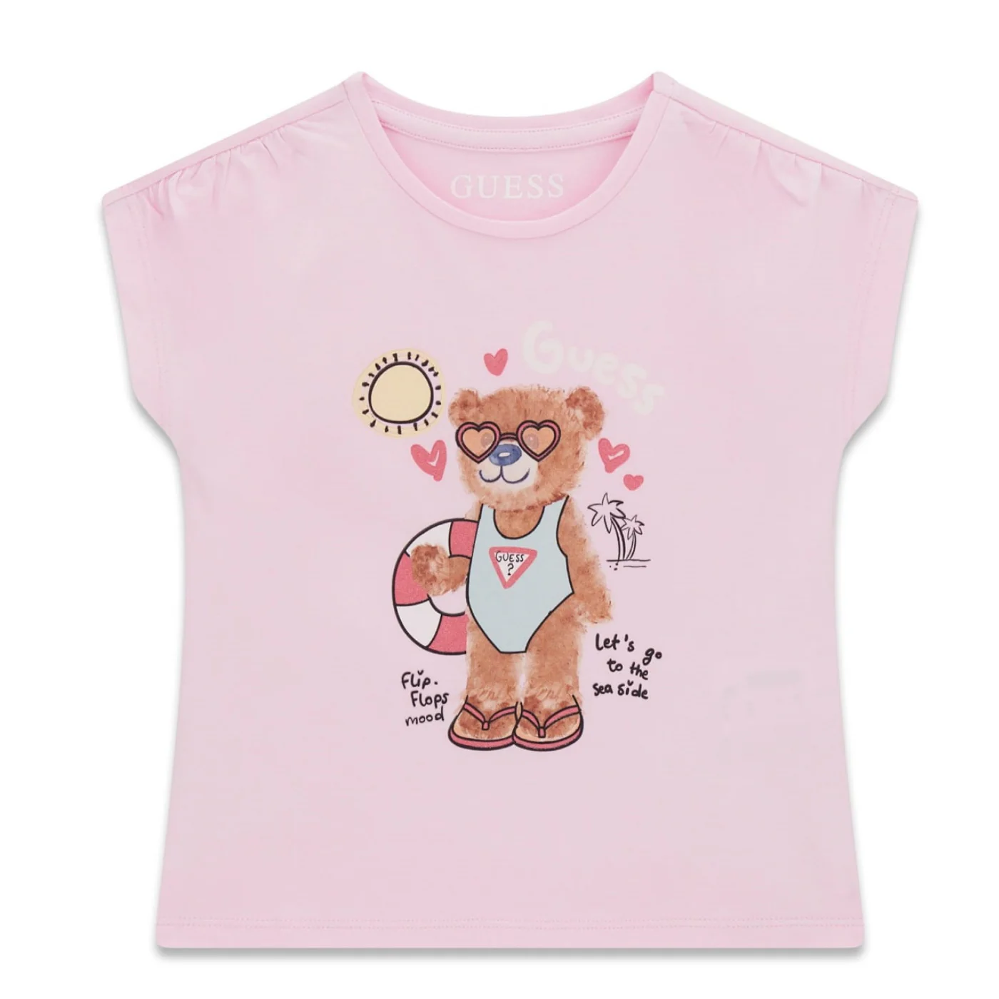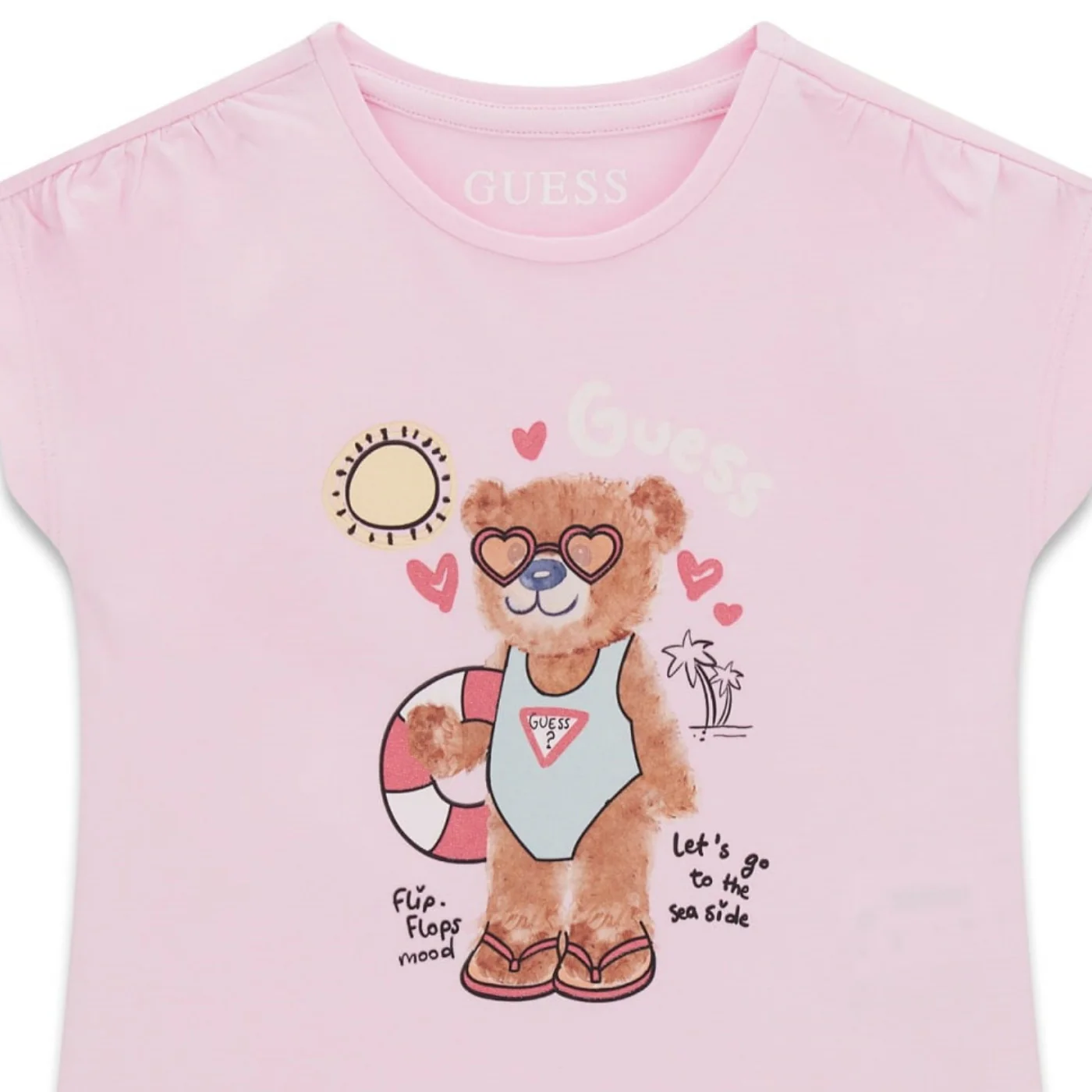Guess t-shirt girocollo bambina in cotone rosaManiche corte Logo con teddy frontale Composizione: 95% cotone 5% elastanMade in IndiaCollezione Primavera Estate Vestibilitร :Taglia Etร