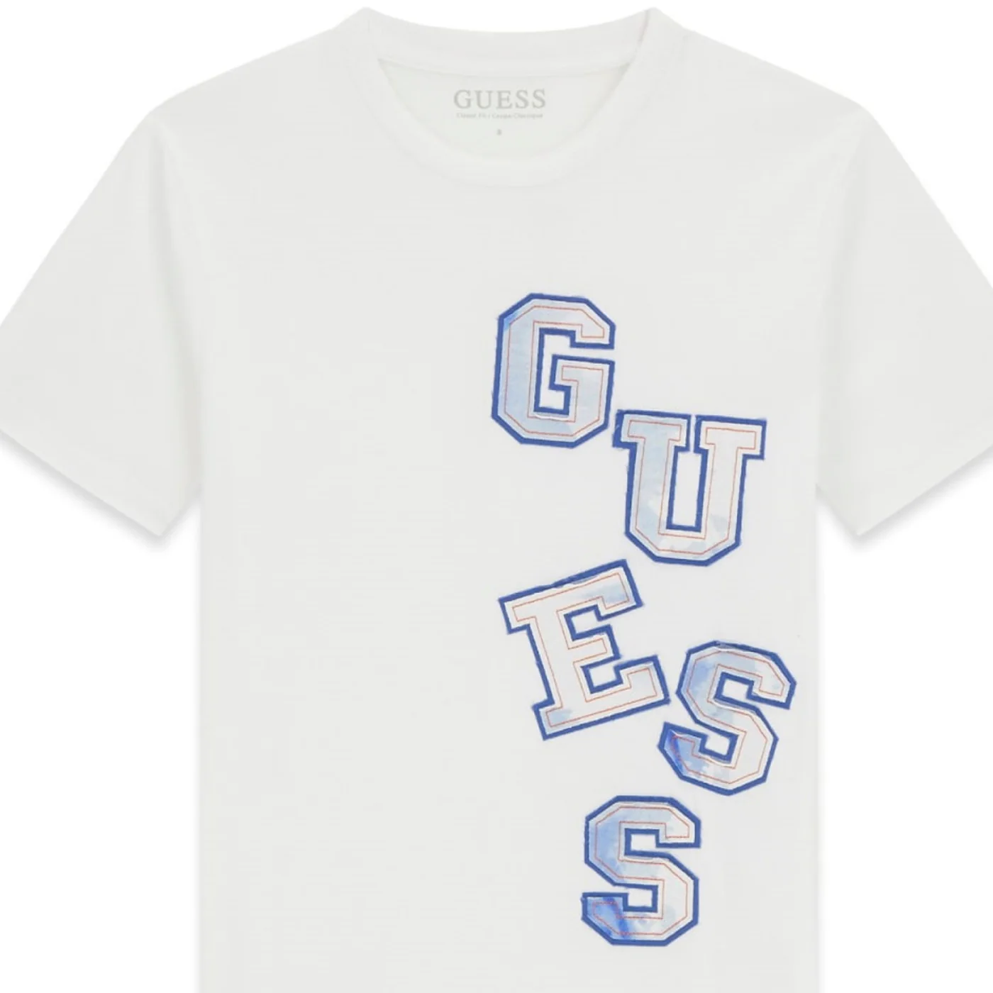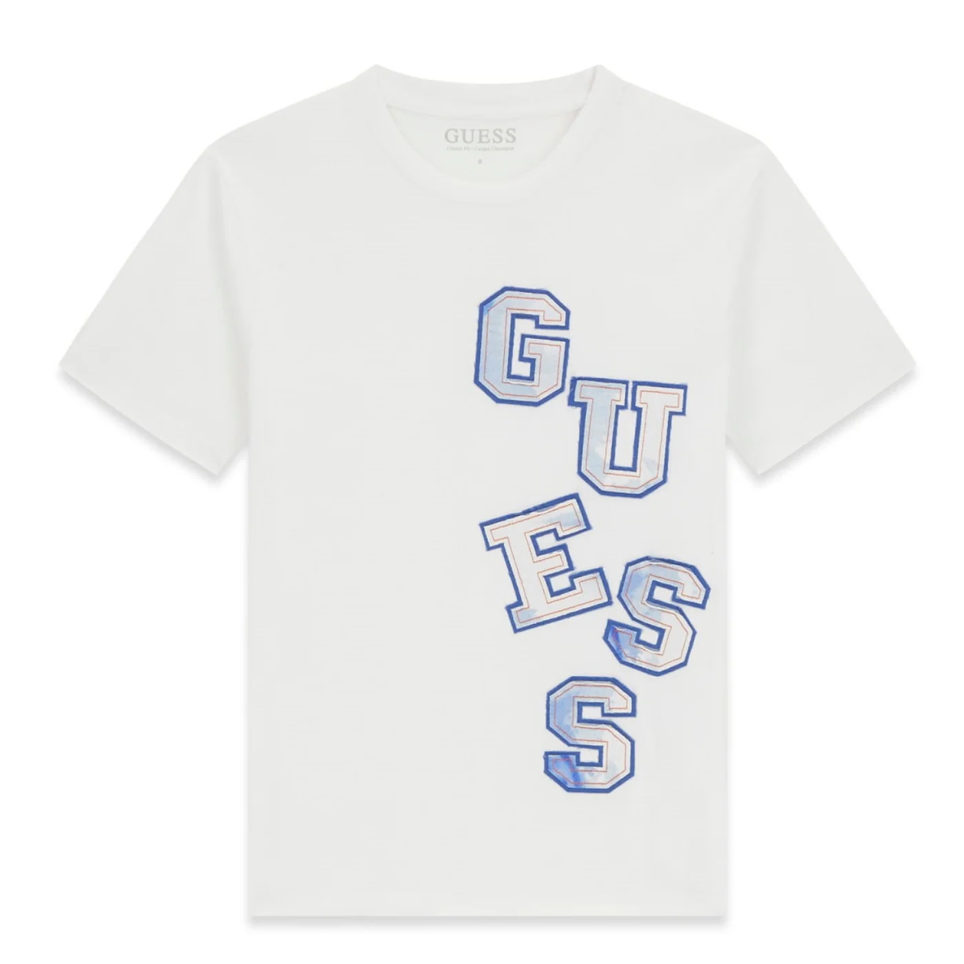 Guess t-shirt girocollo bambino in cotone bianca Maniche corte Logo frontale Composizione: 100% cotoneMade in IndiaCollezione Primavera Estate Vestibilitร :Taglia Etร