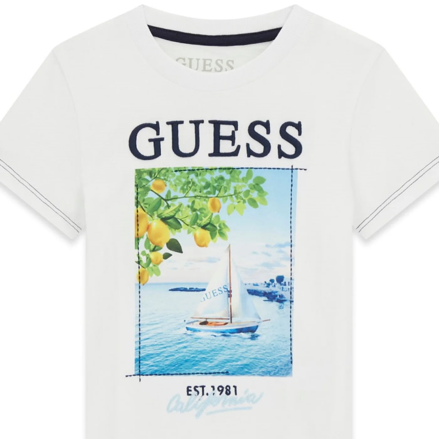 Guess t-shirt girocollo bambino in cotone bianca Maniche corte Ricamo logo con stampa frontaleComposizione: 100% cotoneMade in BangladeshCollezione Primavera Estate Vestibilitร :Taglia Etร