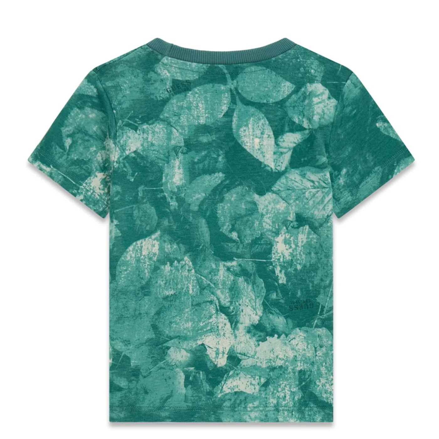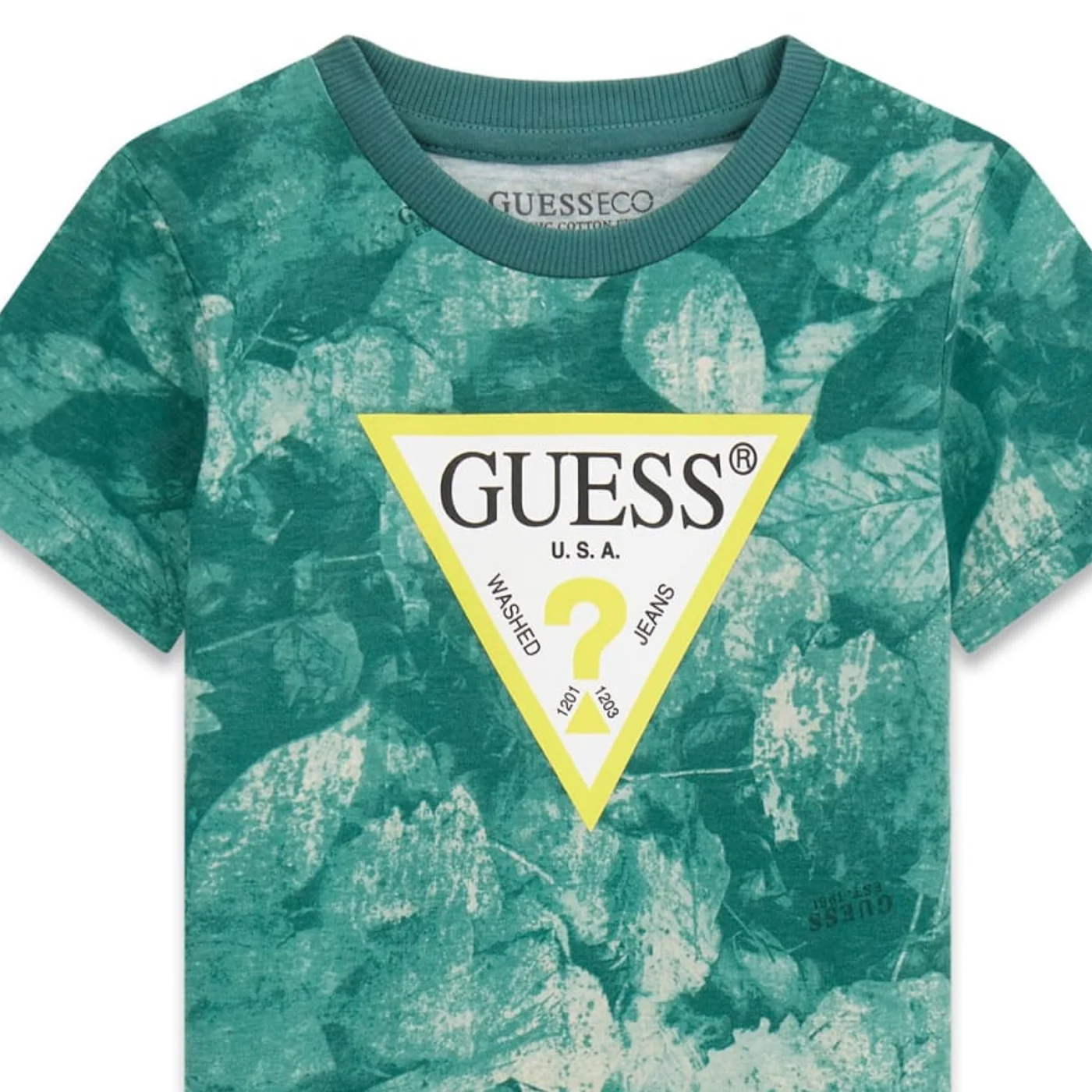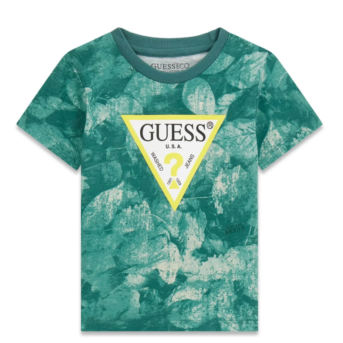 Guess t-shirt girocollo bambino in cotone verdeManiche corte Fantasia all overLogo con stampa frontaleComposizione: 100% cotoneMade in IndiaCollezione Primavera Estate Vestibilitร :Taglia Etร
